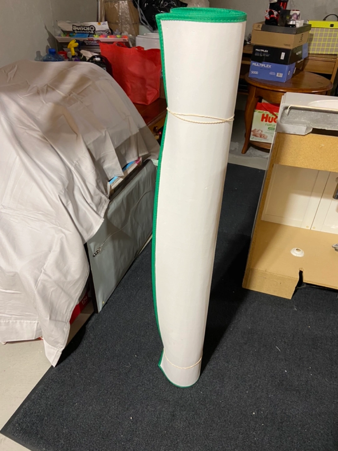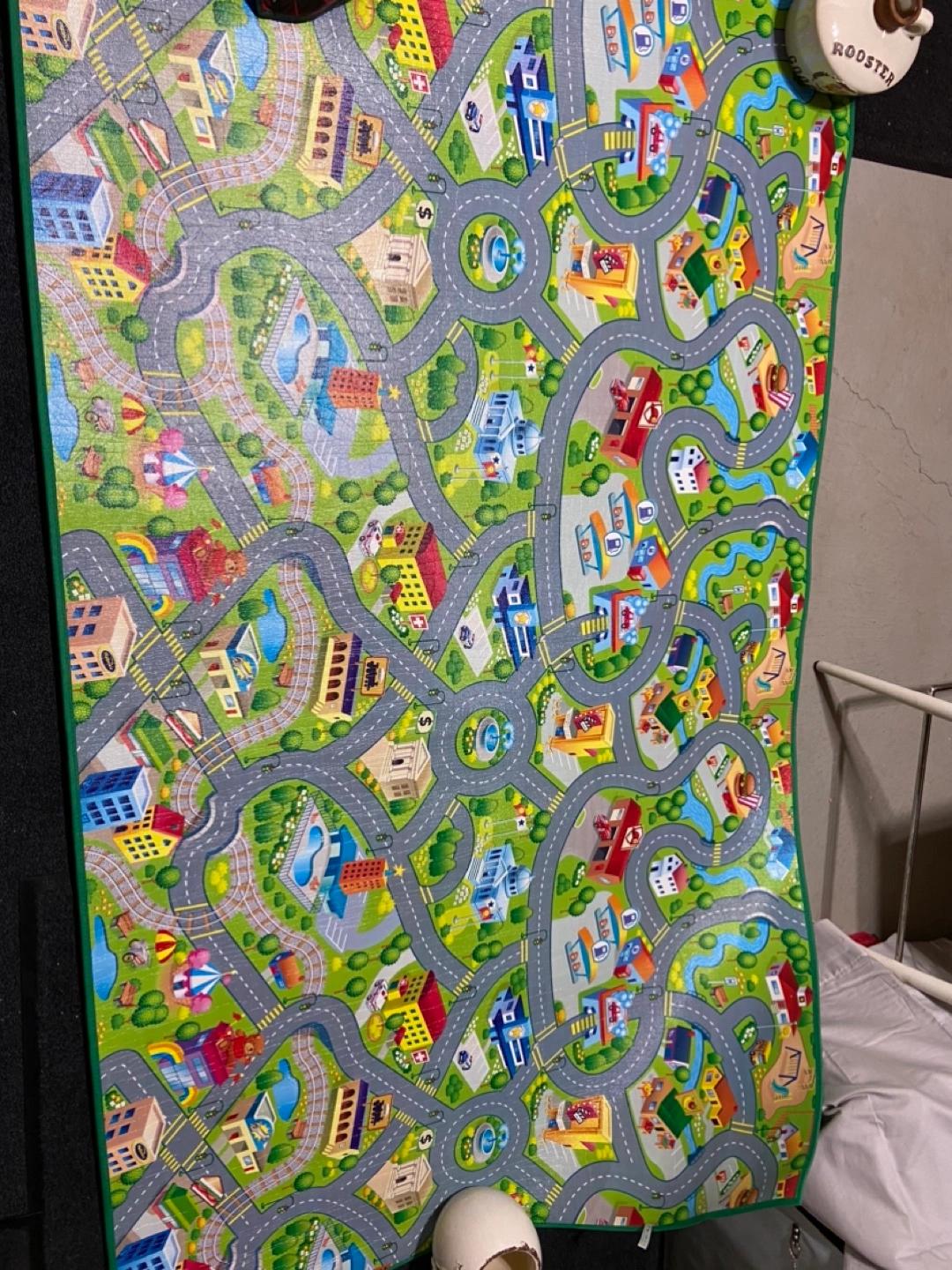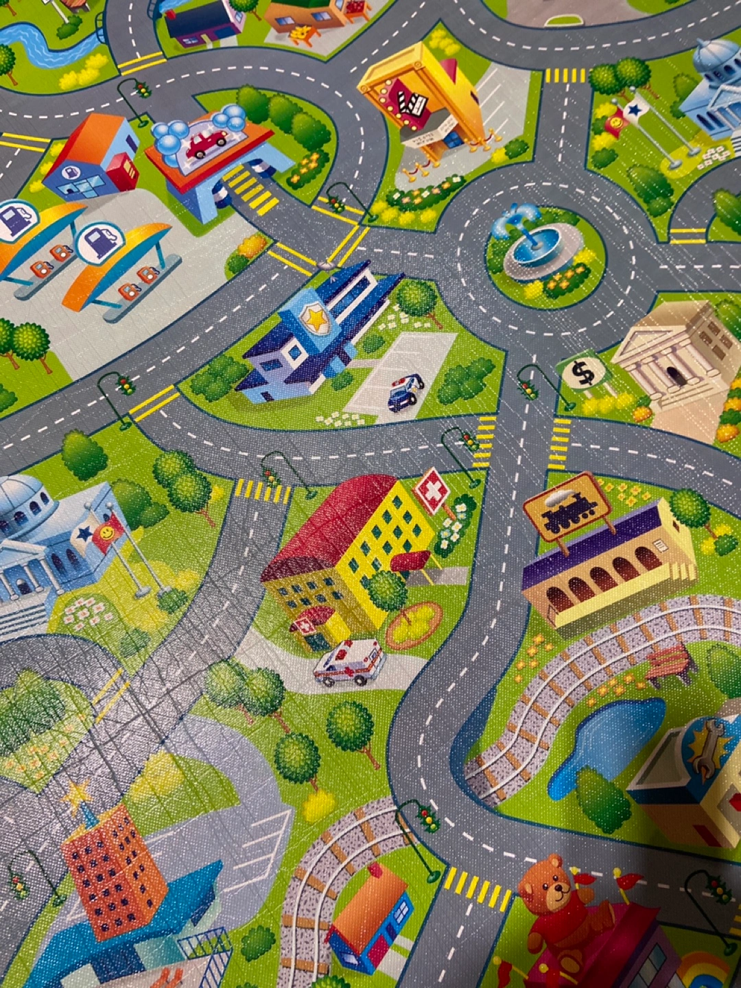 Play mat with city, roads, and buildings. Great for playing with toy cars. 47” wide by 78” long