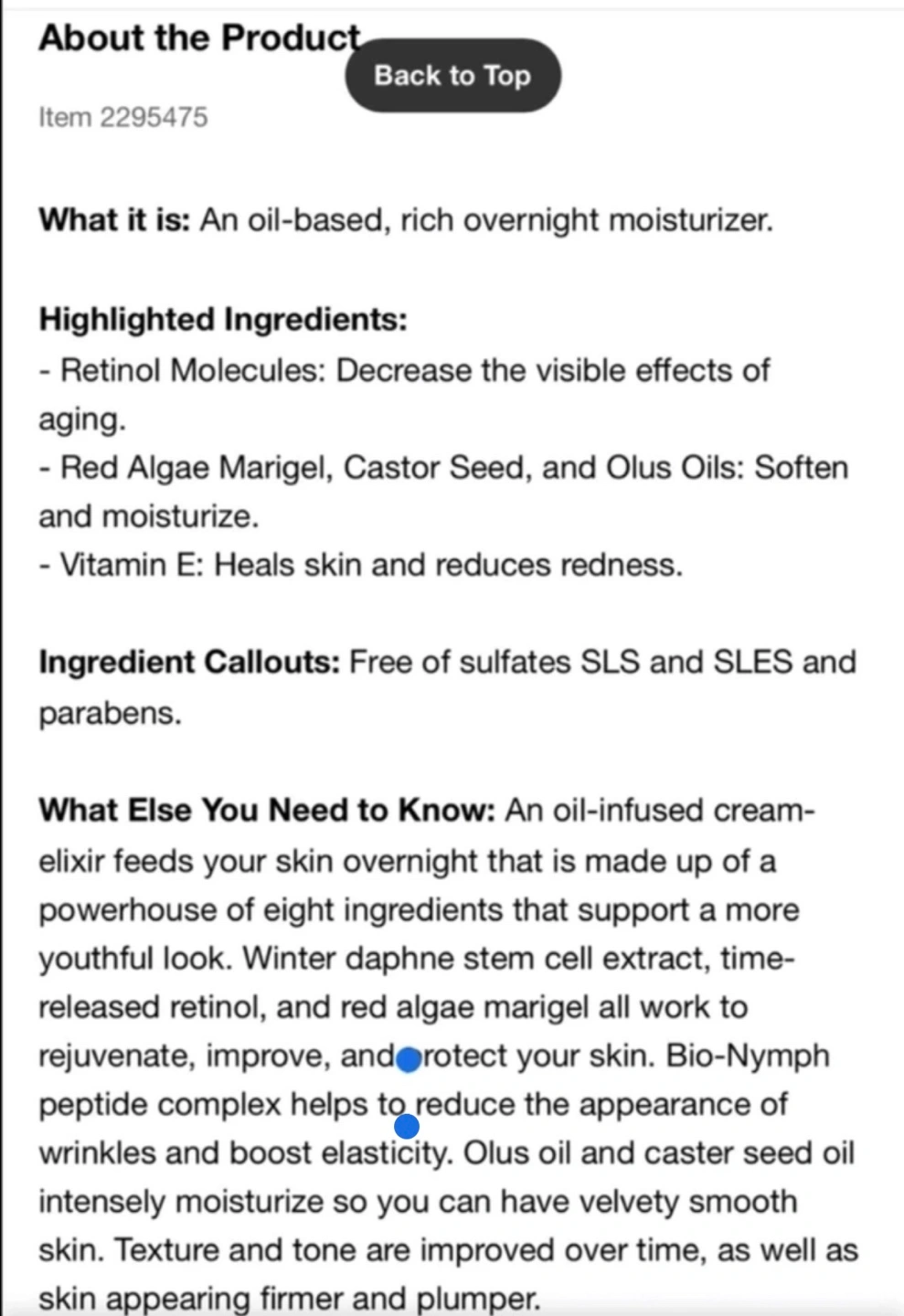 Mini size, 15ml. Oil-based, overnight moisturizer. Contains retinol, red algae, castor seed, and olus oils. Free of sulfates SLS and SLES, and parabens. New - has not been used Retails on Sephora for $54+ tax =$61.02 15ML Pick up at king station