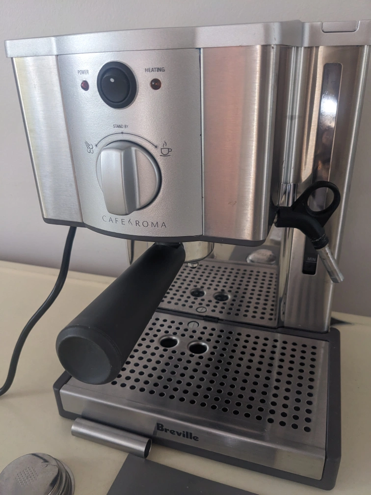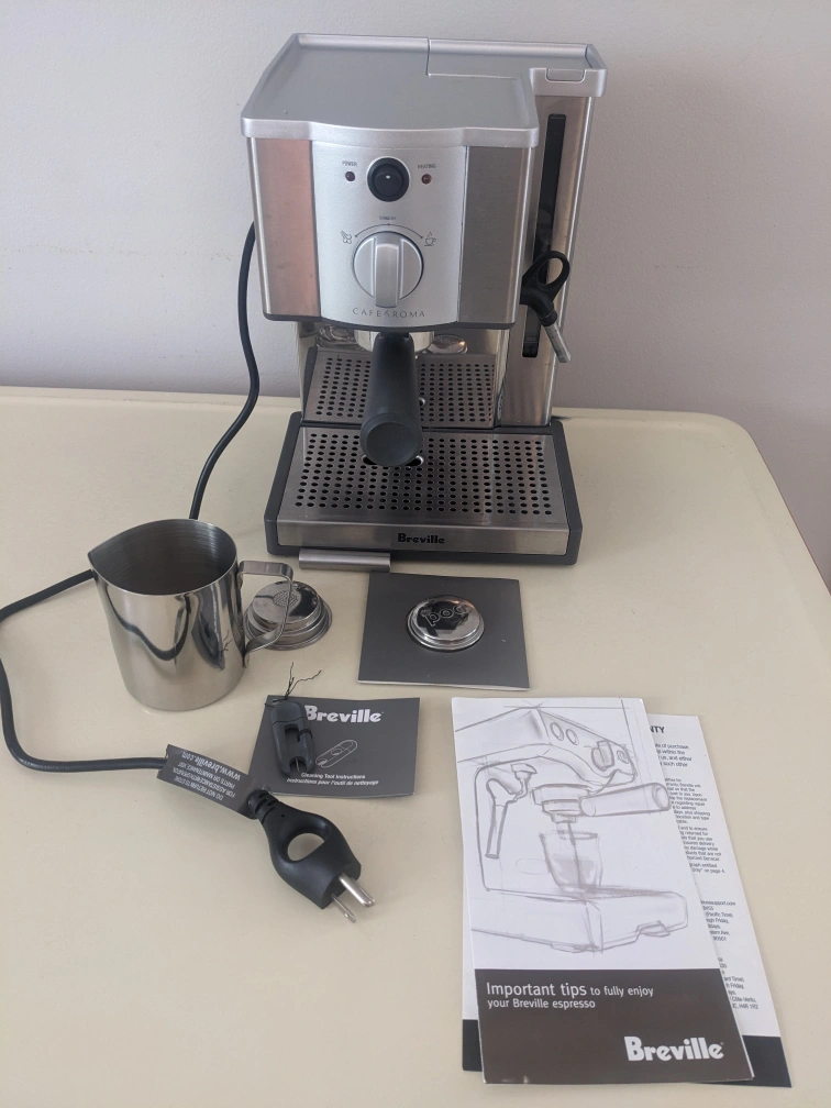Stainless steel espresso machine. Includes a milk frother, instructions and accessories. Used a few times but in storage since last Dec. Original box included.