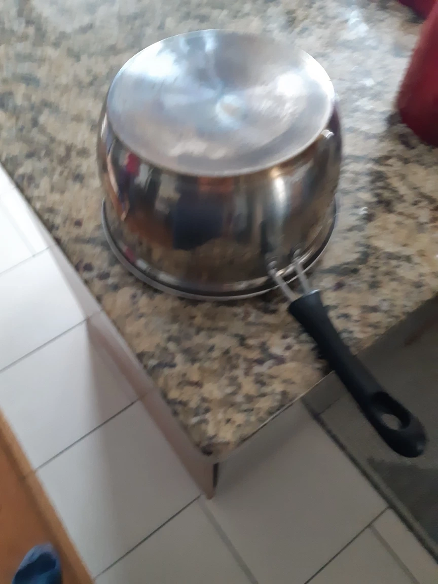 Stainless steel pot with a black handle. Suitable for cooking on the stovetop.