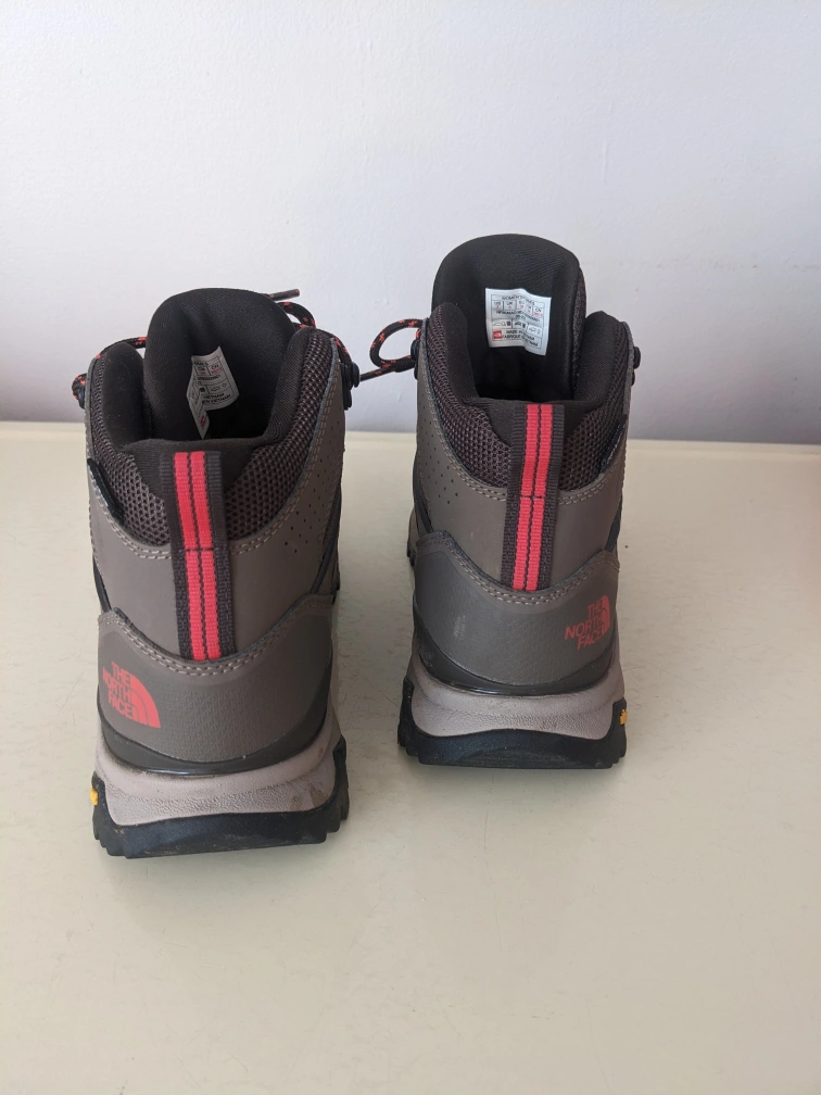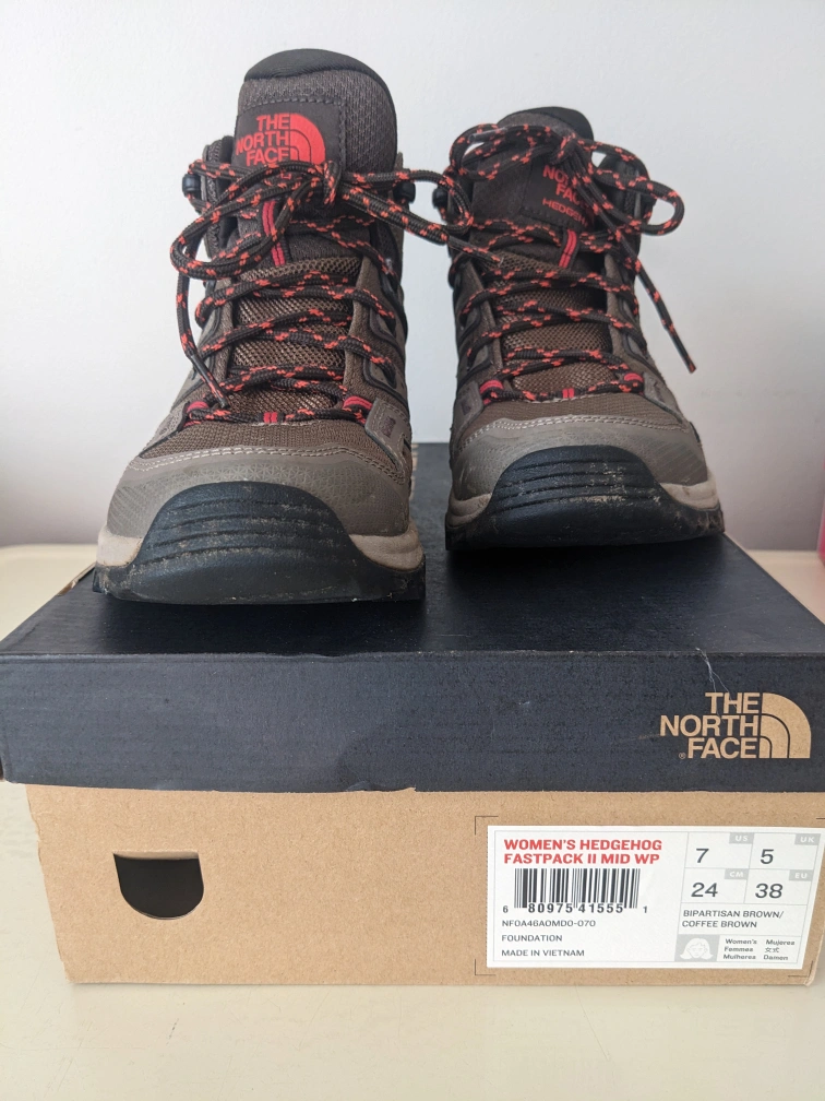 North Face hiking boots with red laces. Size 7. Worn once, very comfy. Original box included