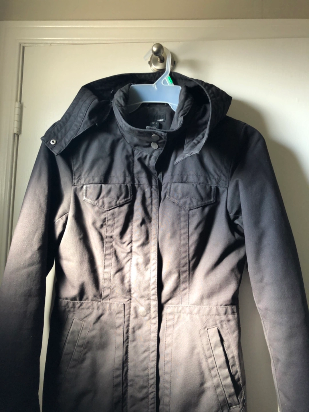 Long, black winter jacket with a hood. Zipper and button closure. The zipper need to be fixed