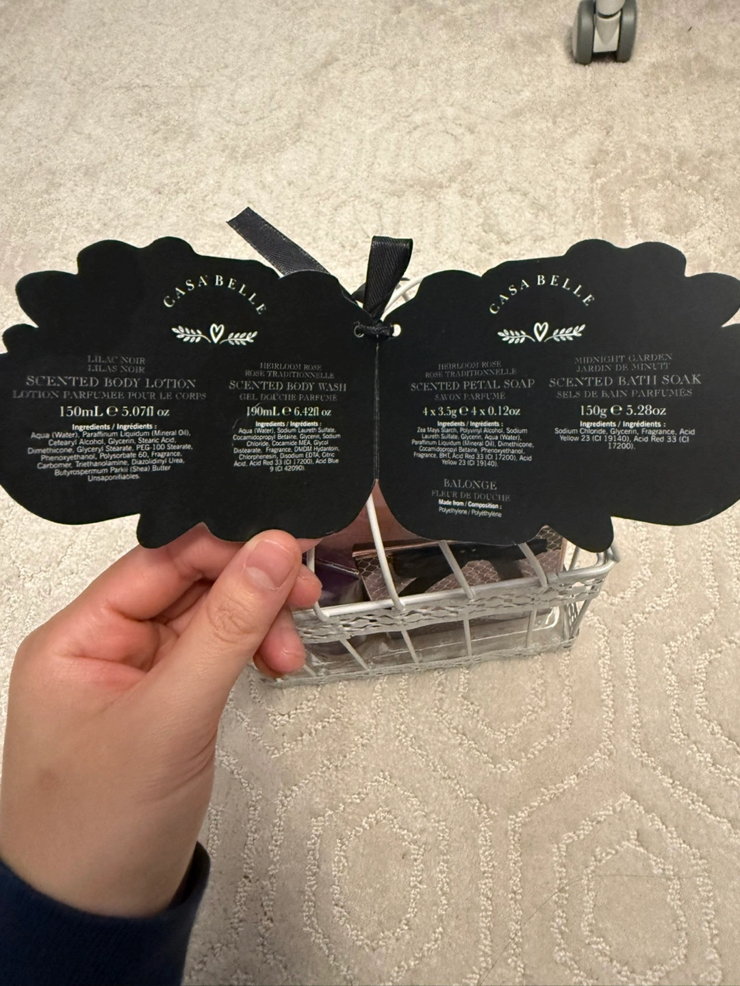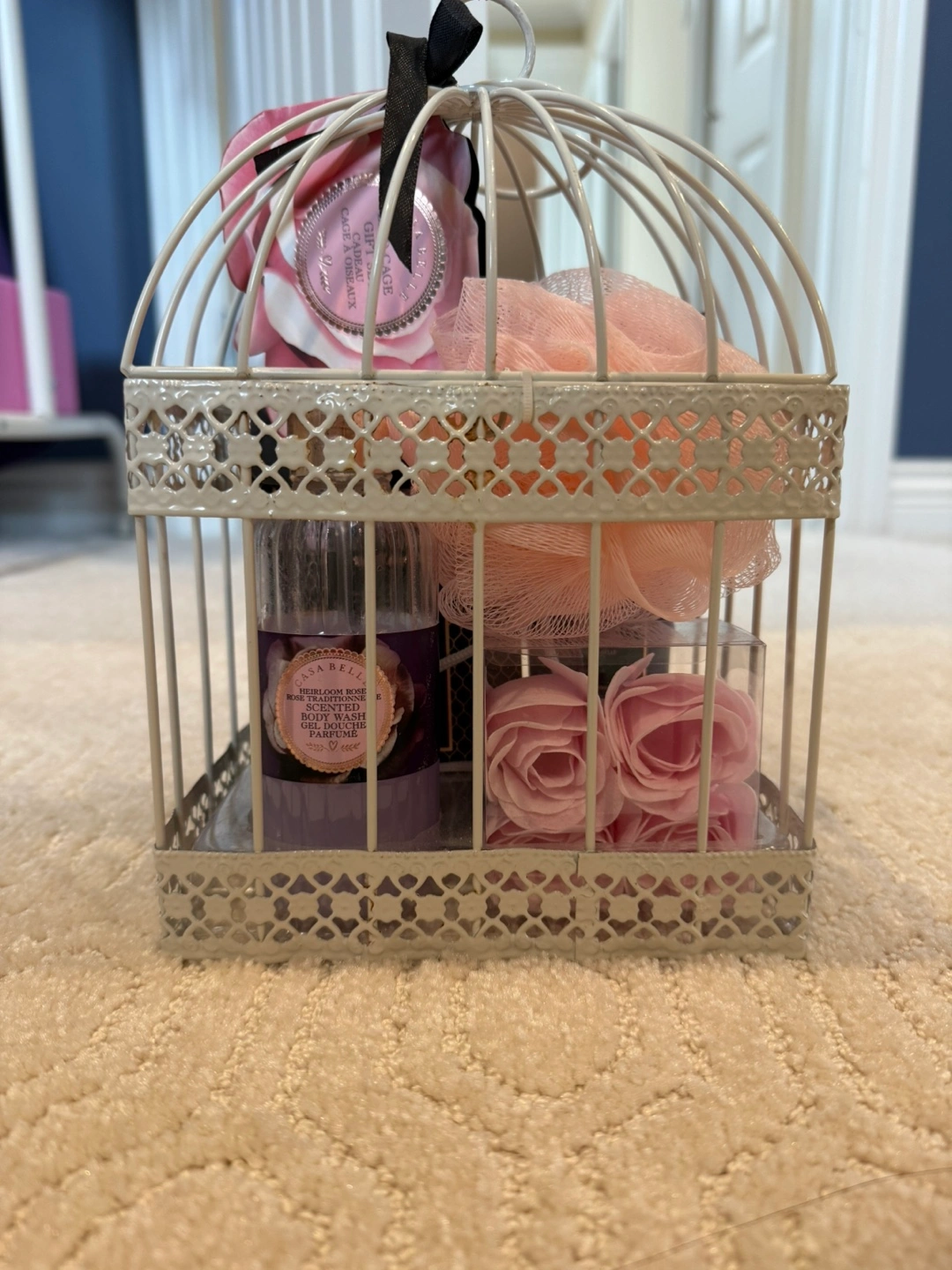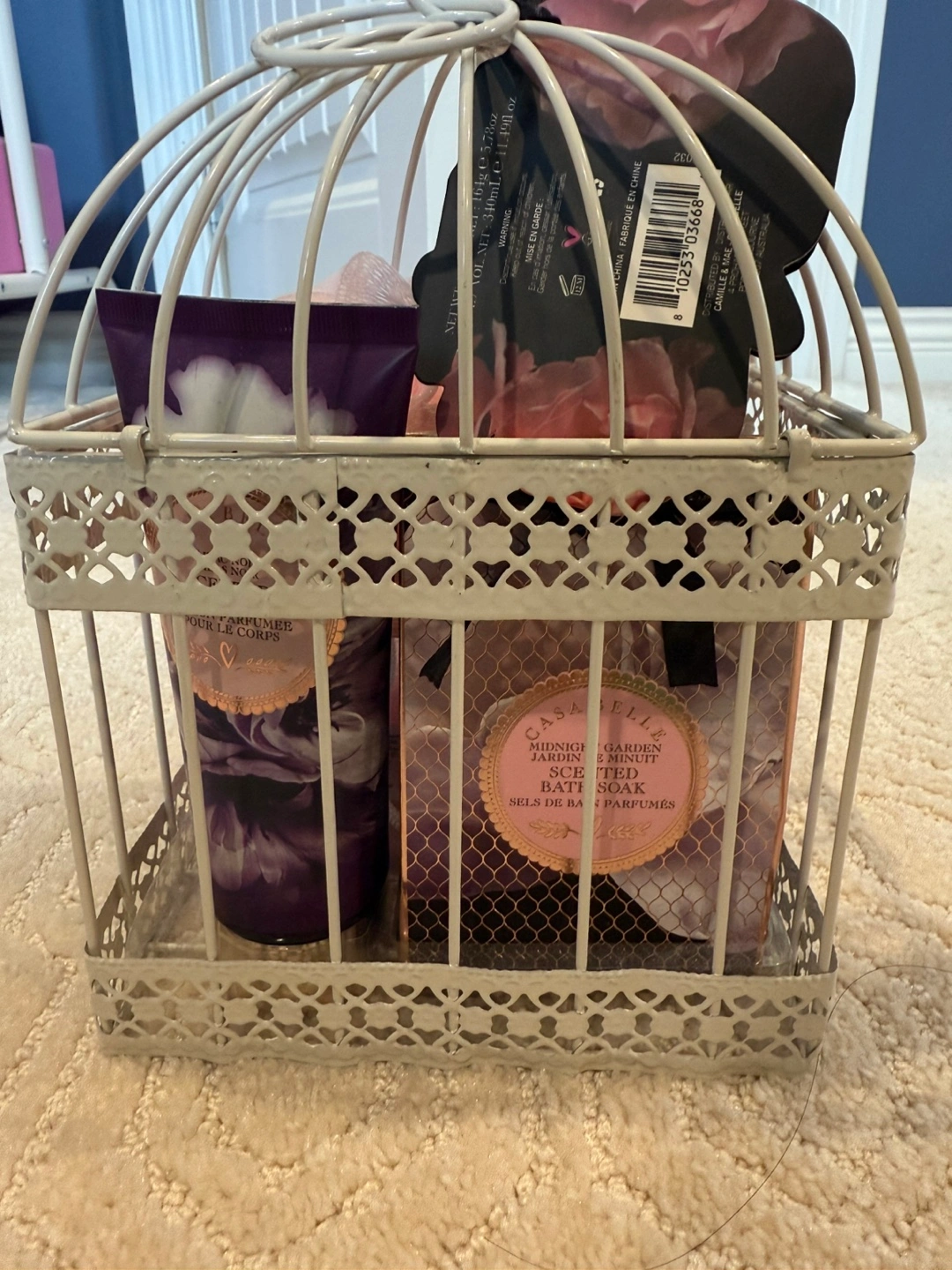 * part of the body wash leaked out when I put it on the side ~ 1/2 left Gift set includes body lotion, body wash, and bath soak. All items are scented. New and unused. Comes in cute birdcage holder
