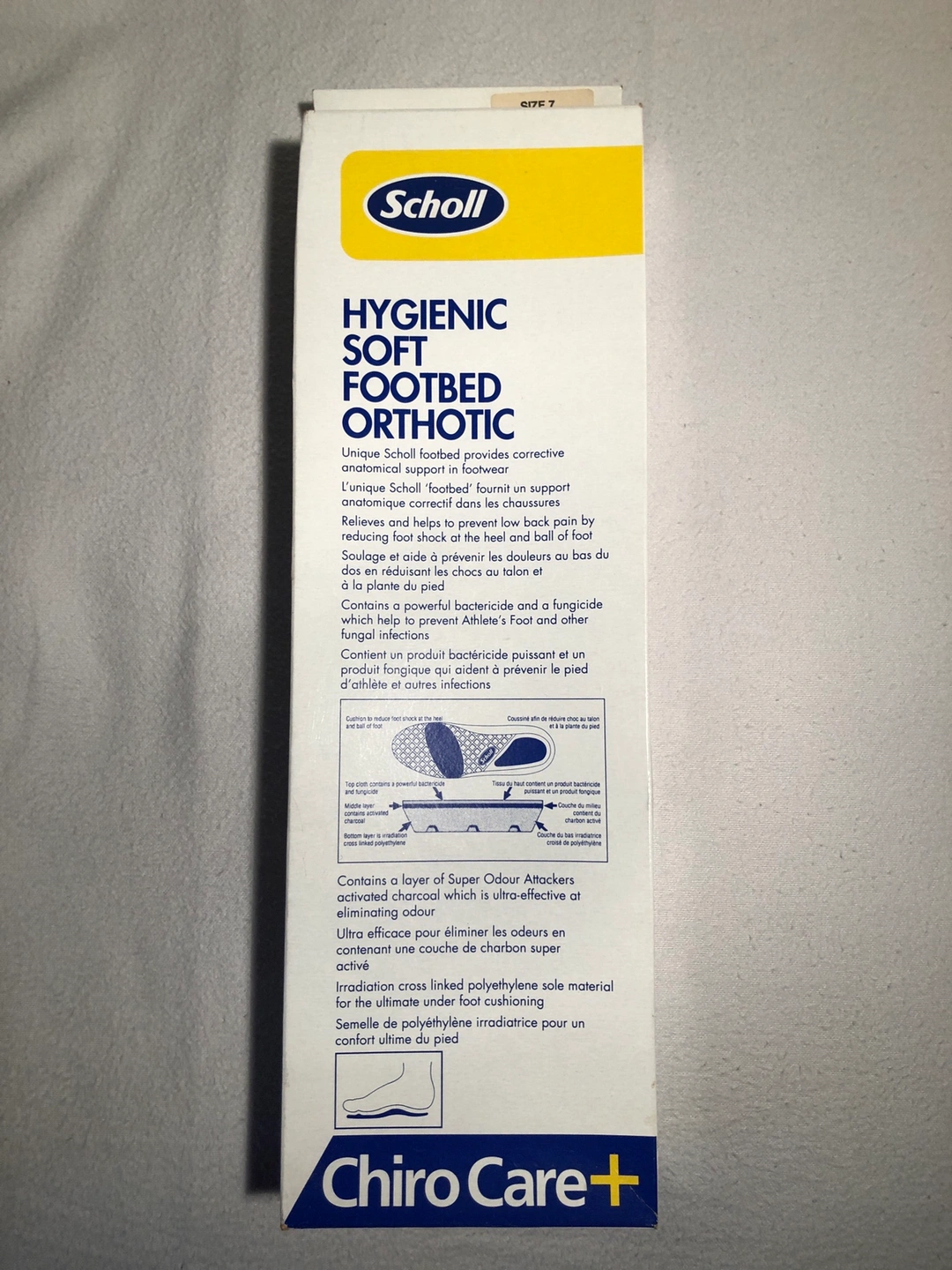 Scholl footbed provides corrective anatomical support in footwear. Relieves and helps to prevent low back pain by reducing foot shock at the heel and ball of foot. Contains a layer of Super Odour Attackers activated charcoal which is ultra-effective at eliminating odour.