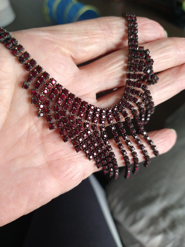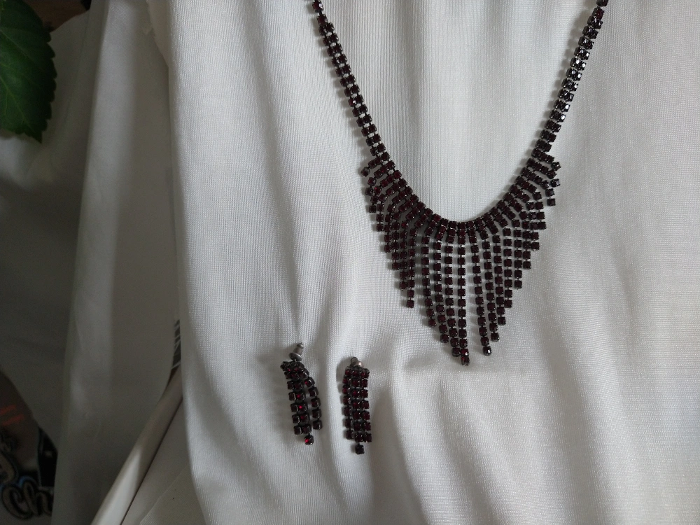 Red crystal necklace with matching earrings. The necklace features a cascading design.