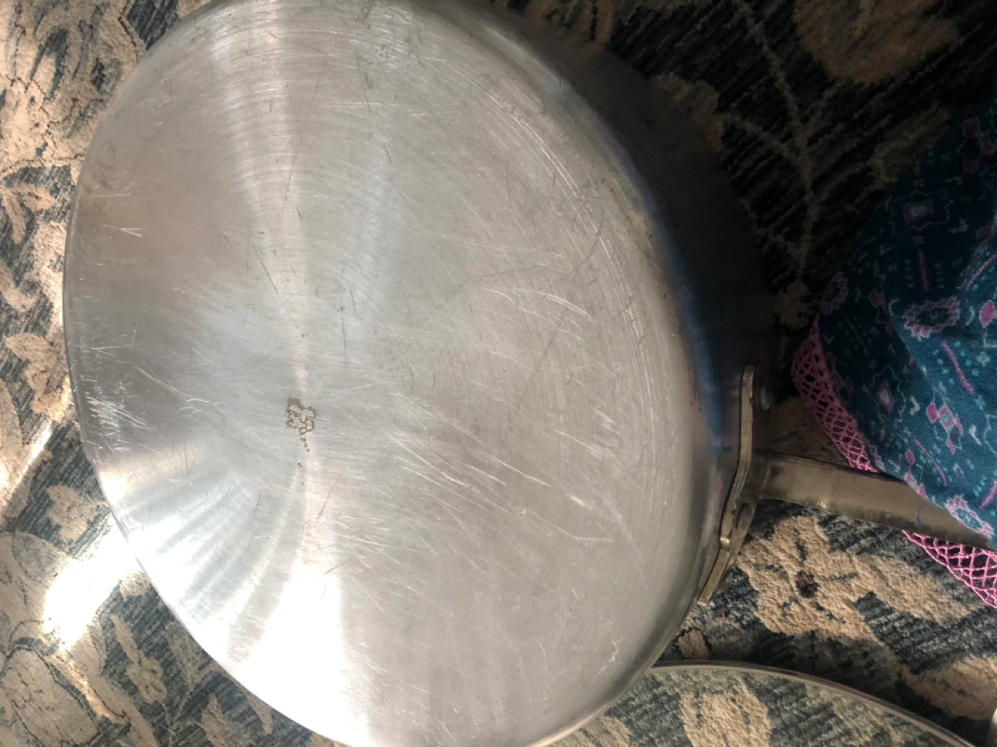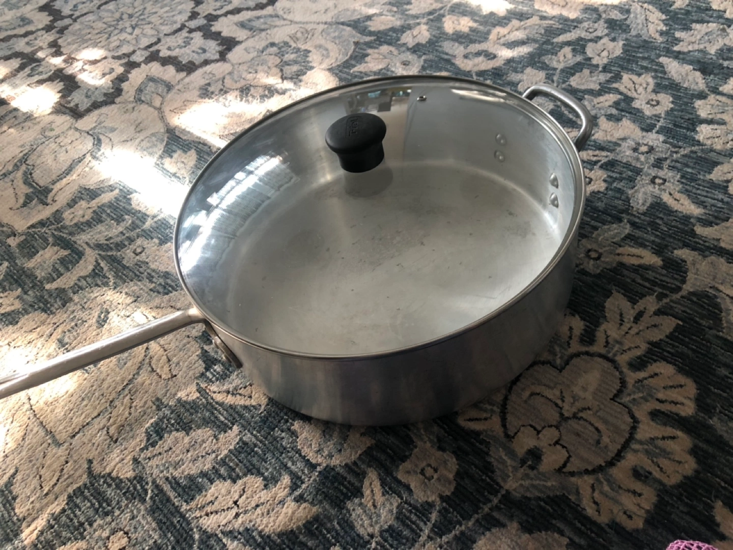 Large stainless steel skillet with glass lid. Includes a long handle.