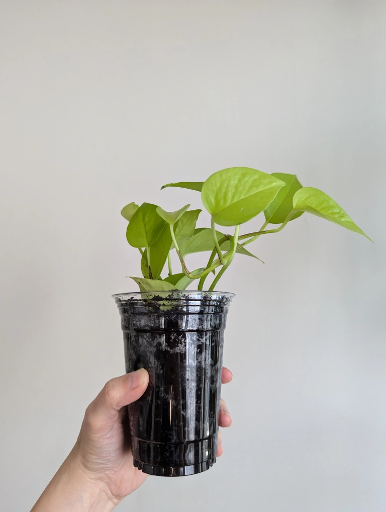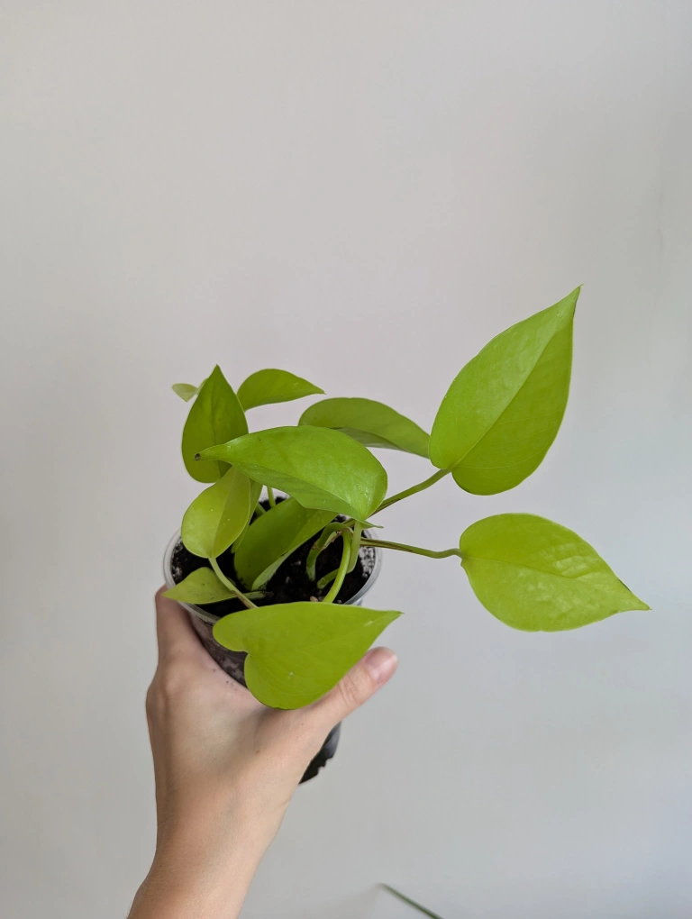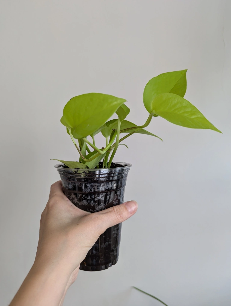 Healthy neon pothos plant in a small plastic pot. Easy to care for.