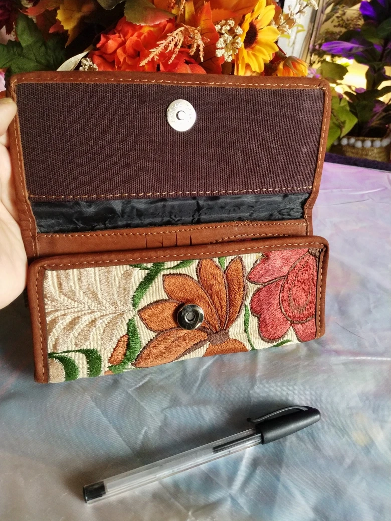 Leather wallet with embroidered floral design. The wallet features a zipper closure, multiple card slots, a bill compartment, and a zippered pocket. (Pen is just for reference, not included.) FCFS basis. Sorry, no holds. Pick up only, please. Brentwood - Holdom area. You might want to check my other listings ๐Ÿ™‚ Happy Fall! ๐Ÿ๐Ÿ‚๐ŸŽƒ