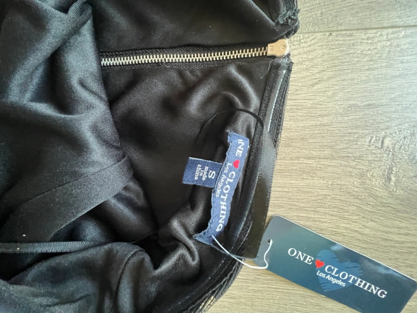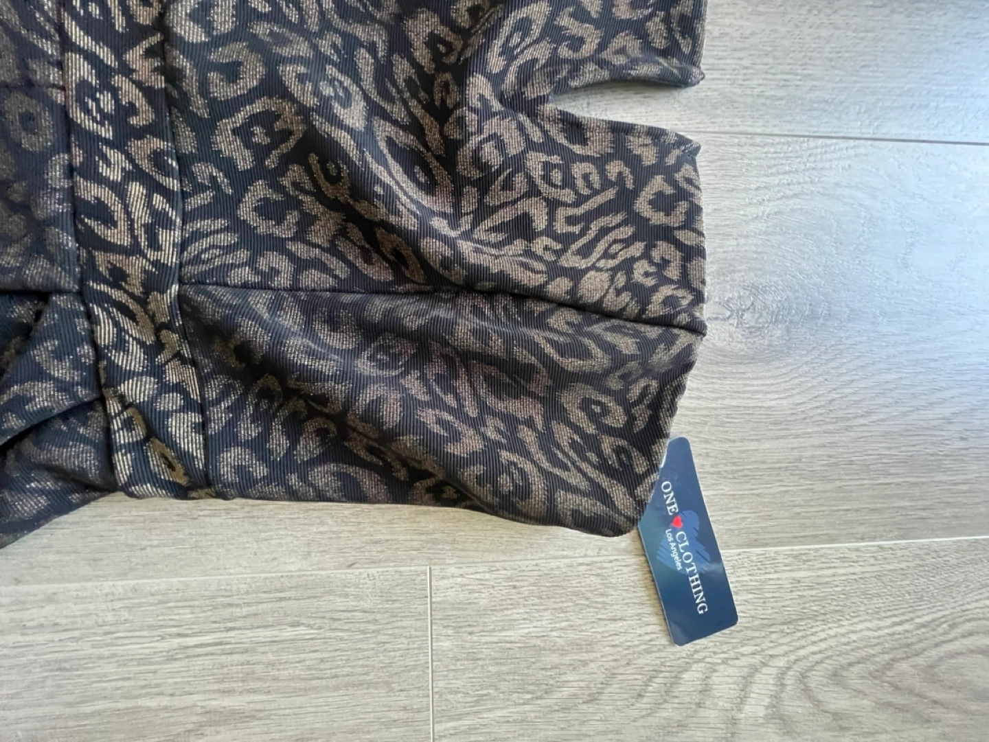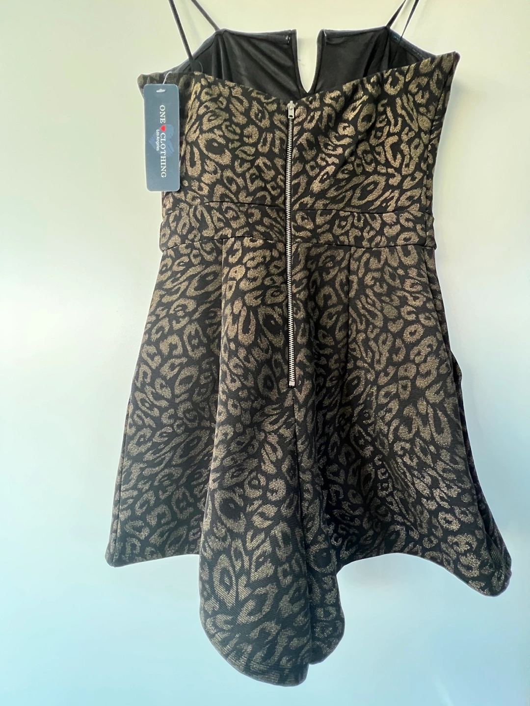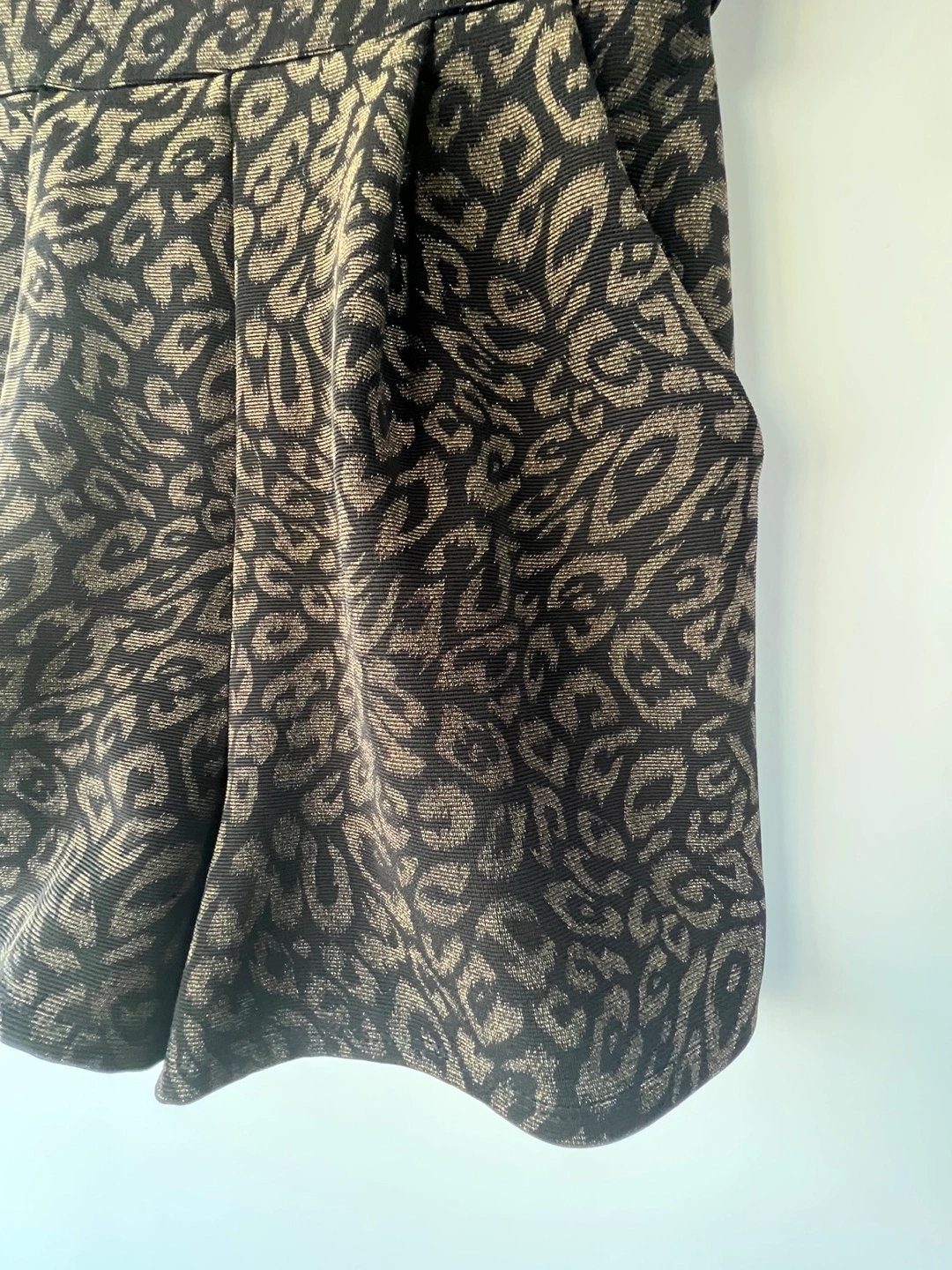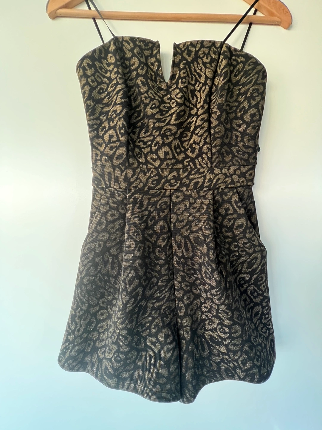 Strapless romper / one piece/ jumpsuit with a V-neck and a gold leopard print. It has a zipper on the back and pockets. Size S , fits small