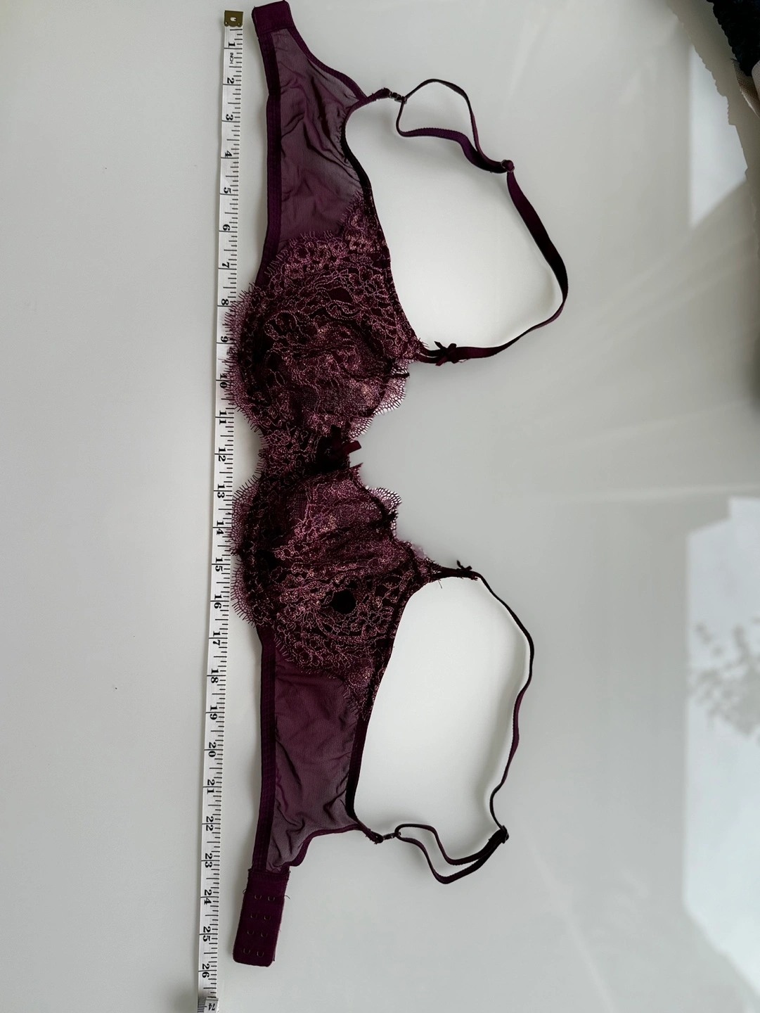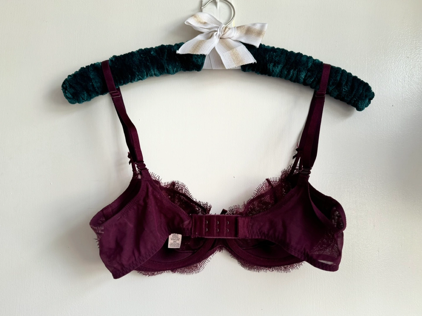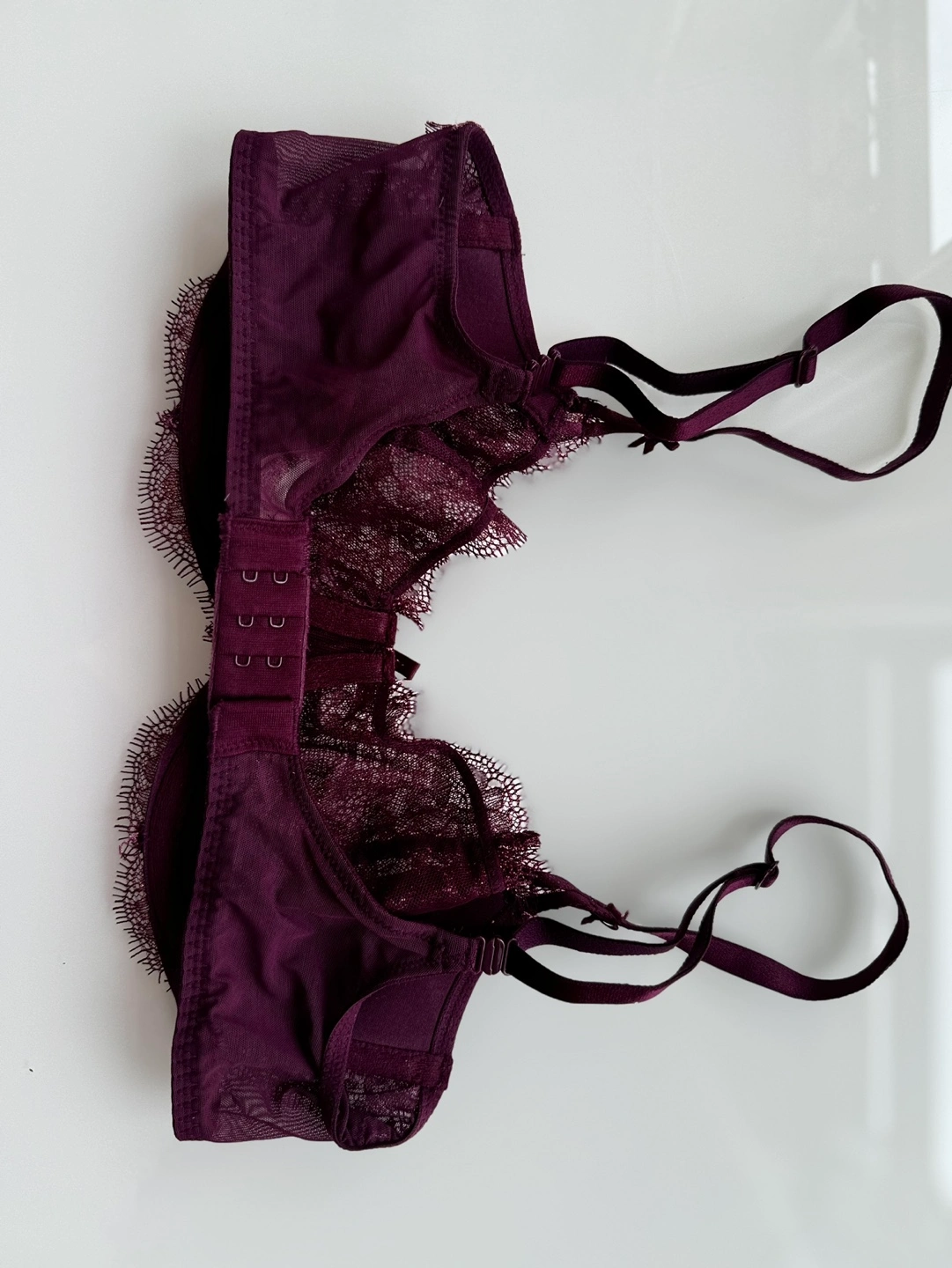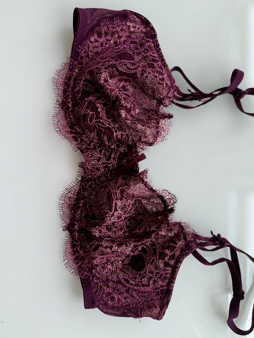 Burgundy lace push up bra with adjustable straps and a hook and eye closure. Has a bow on the front. Lace has a gold sheen which is in excellent condition.