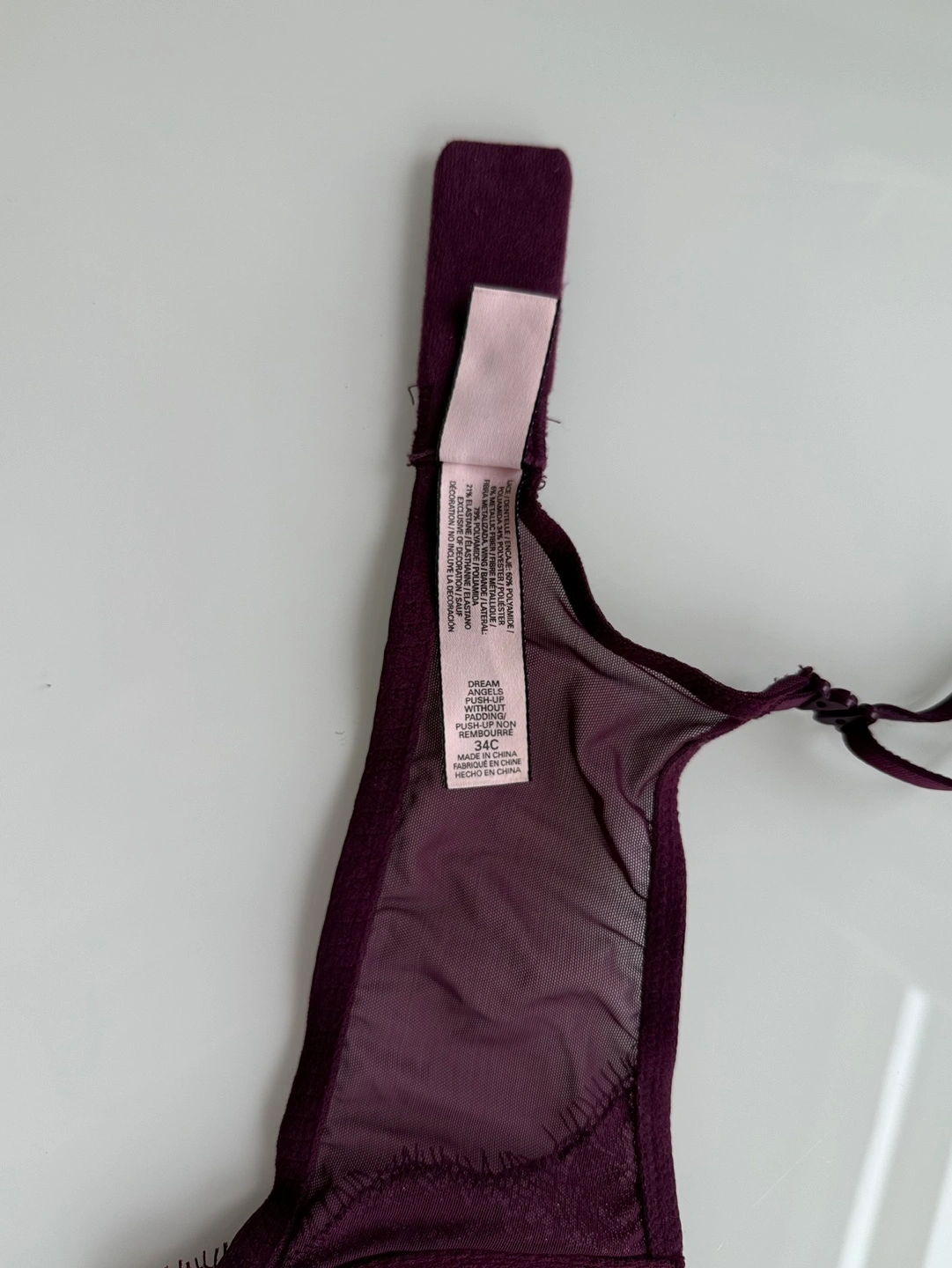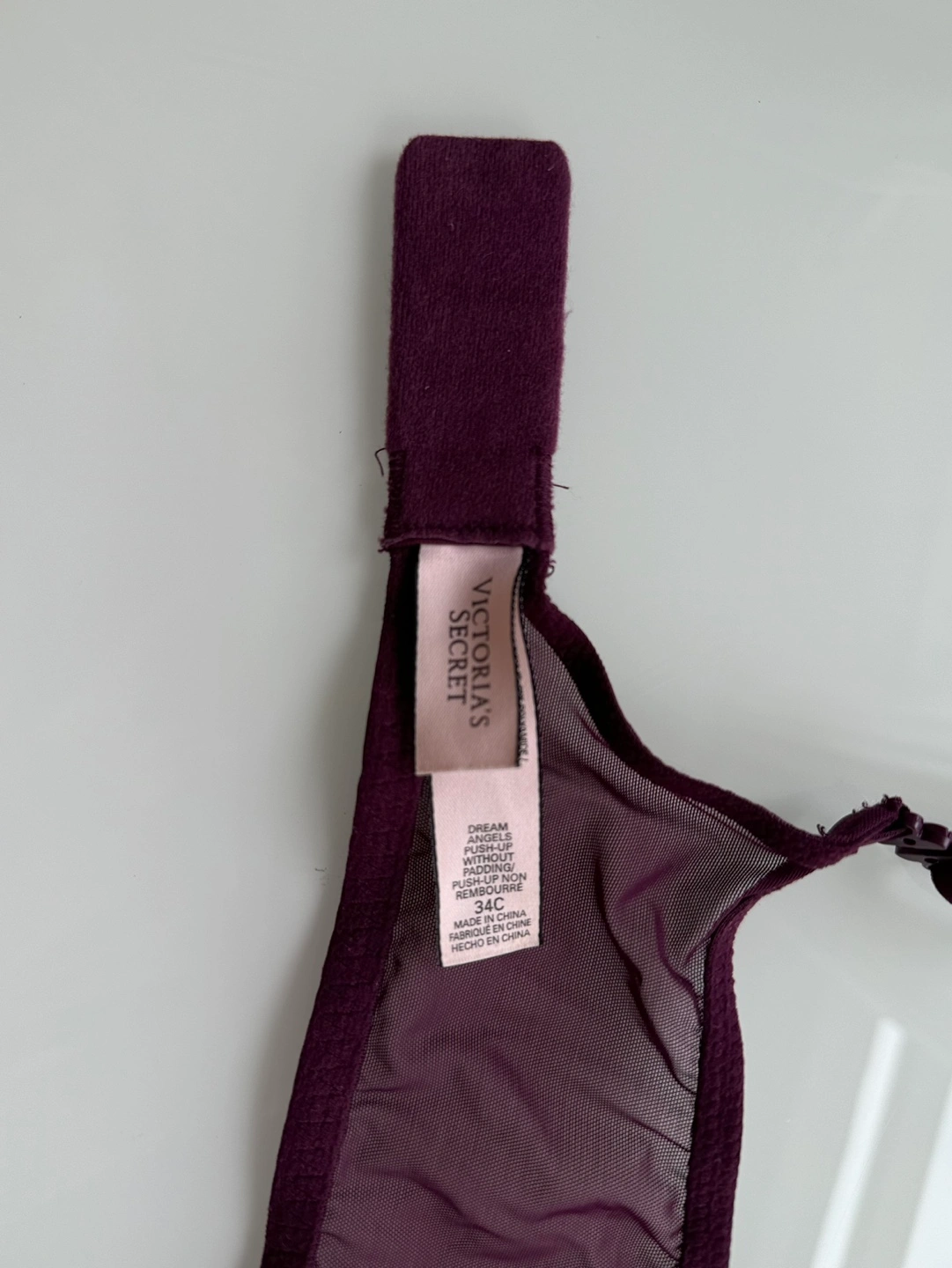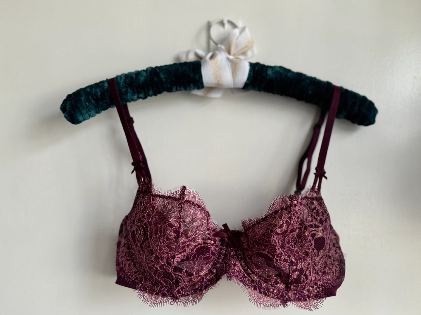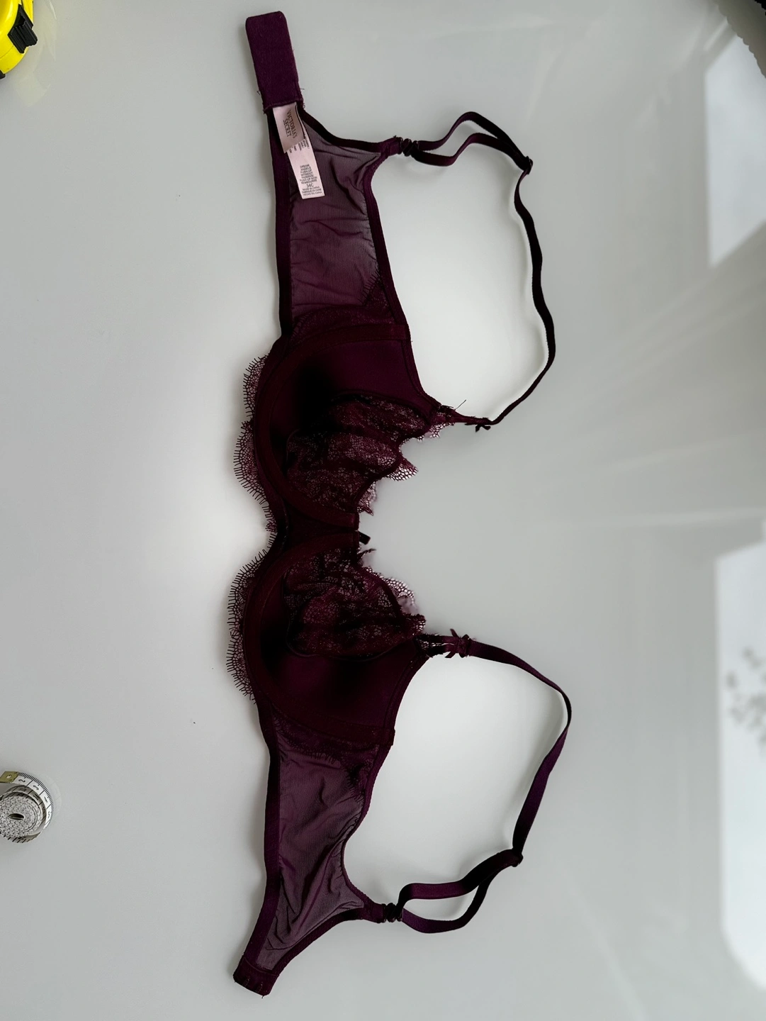 Burgundy lace push up bra with adjustable straps and a hook and eye closure. Has a bow on the front. Lace has a gold sheen which is in excellent condition.