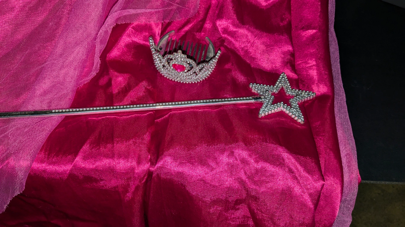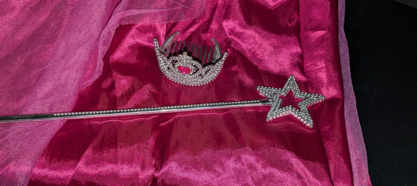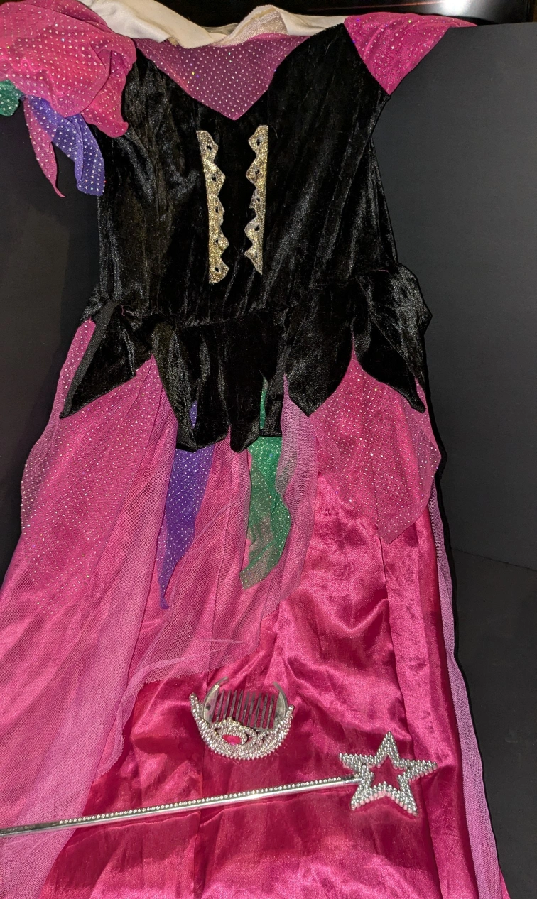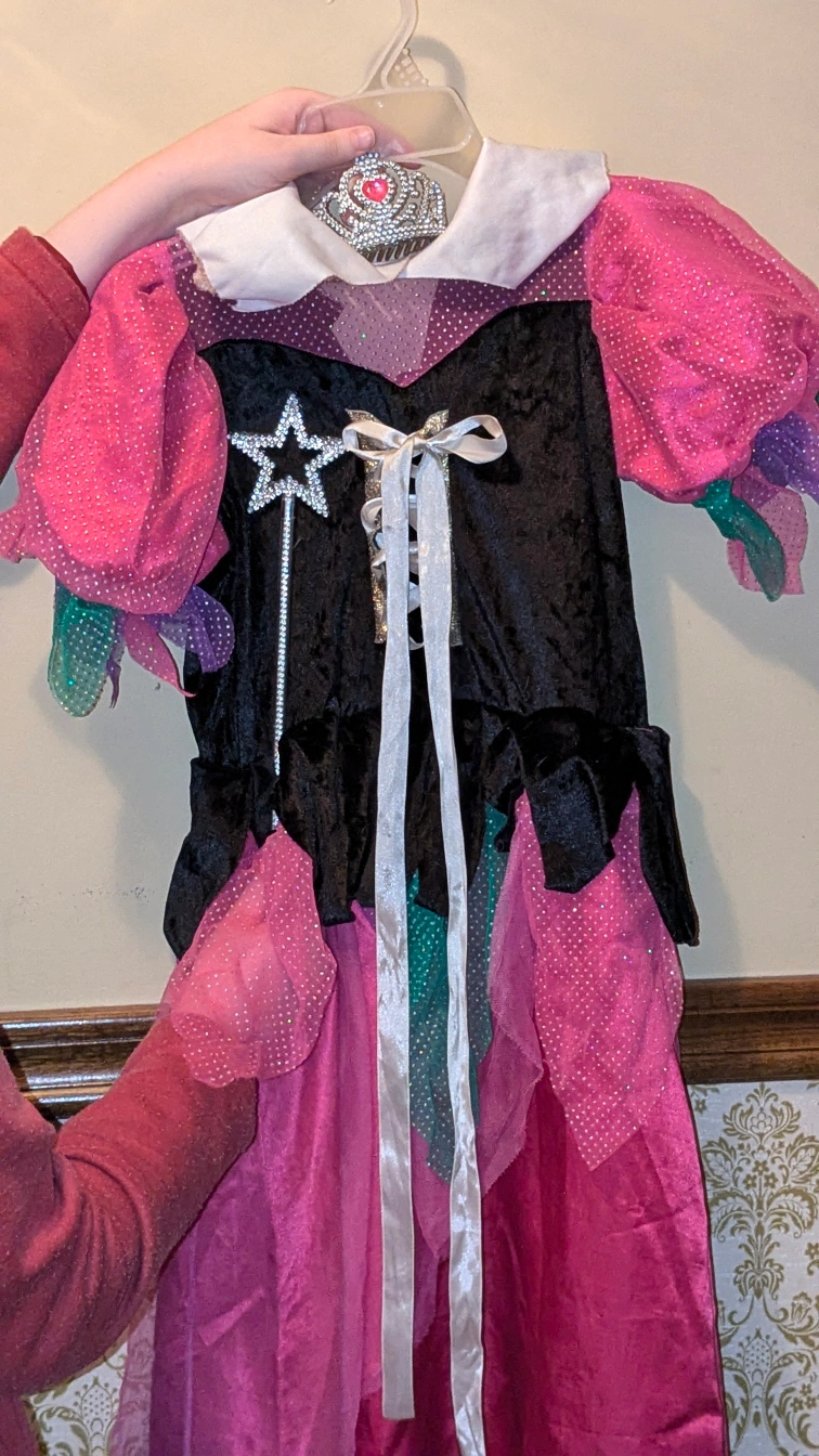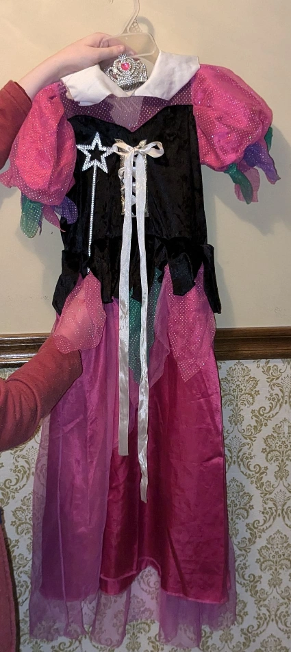 This is a fun and non-traditional fairy princess/witch dress. It has a dark bodice. With gold and white ruching for the front. There is green and purple tulle trim around the bottom of the bodice and the sleeves. The sleeves are a poofy pink. This is perfect for any child that wants a break from the traditional: All pink princess look. This costume comes included with a sparkly silver mini Crown and a sparkly silver star wand. We have also included a sparkly silver necklace, the necklace can also be worn as a bracelet, please see the photos. If your child would like a set of wings to go with this costume, please check my other listing as I do have wings posted. Don't forget that this is an easy and perfect addition to any dress up closet. Smoke-free home. Thank you for looking at my listing. Please feel free to ask any questions.