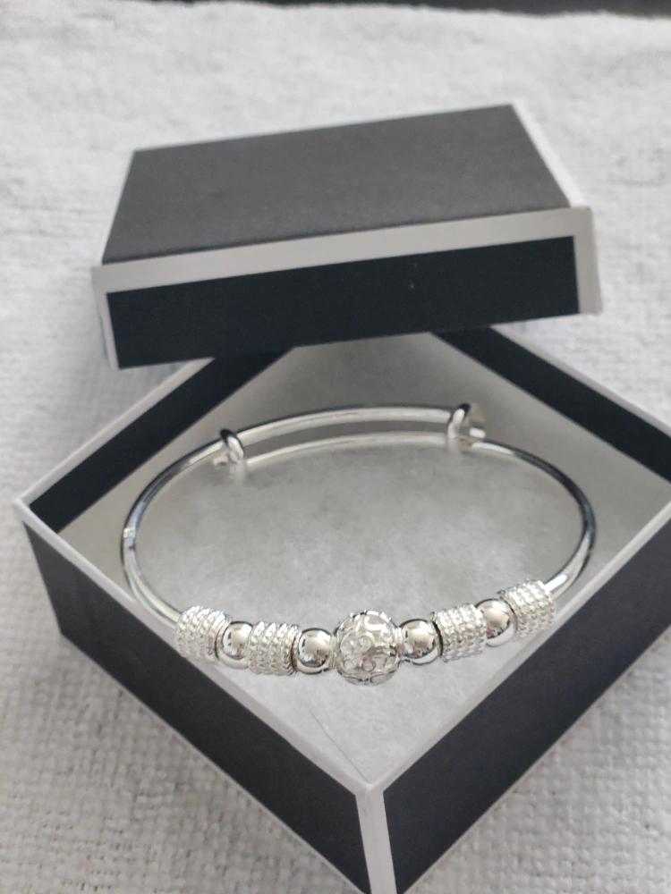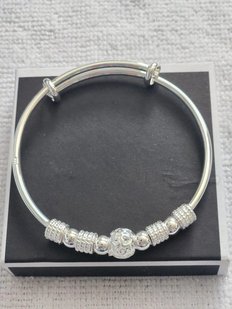 Sterling silver adjustable bracelet Includes decorative charms Comes in a box. Perfect gift.