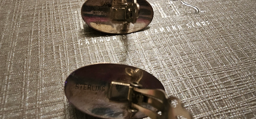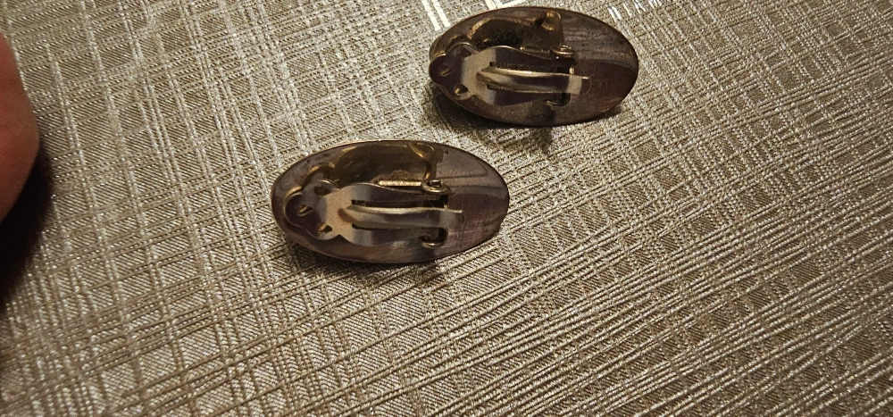 Oval-shaped blue stone earrings with sterling silver settings. Clip-on style.