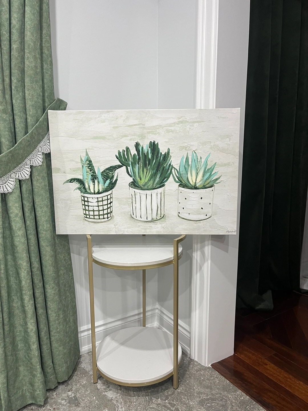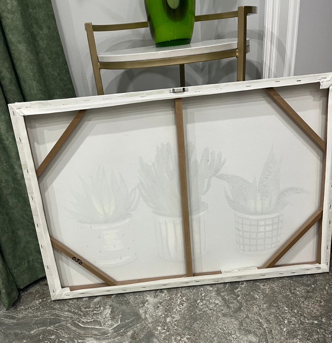 Canvas wall art with a painting of three plants in pots. The painting has a wooden backing. This bright colourful painting would be a great addition for any decor, style or space.