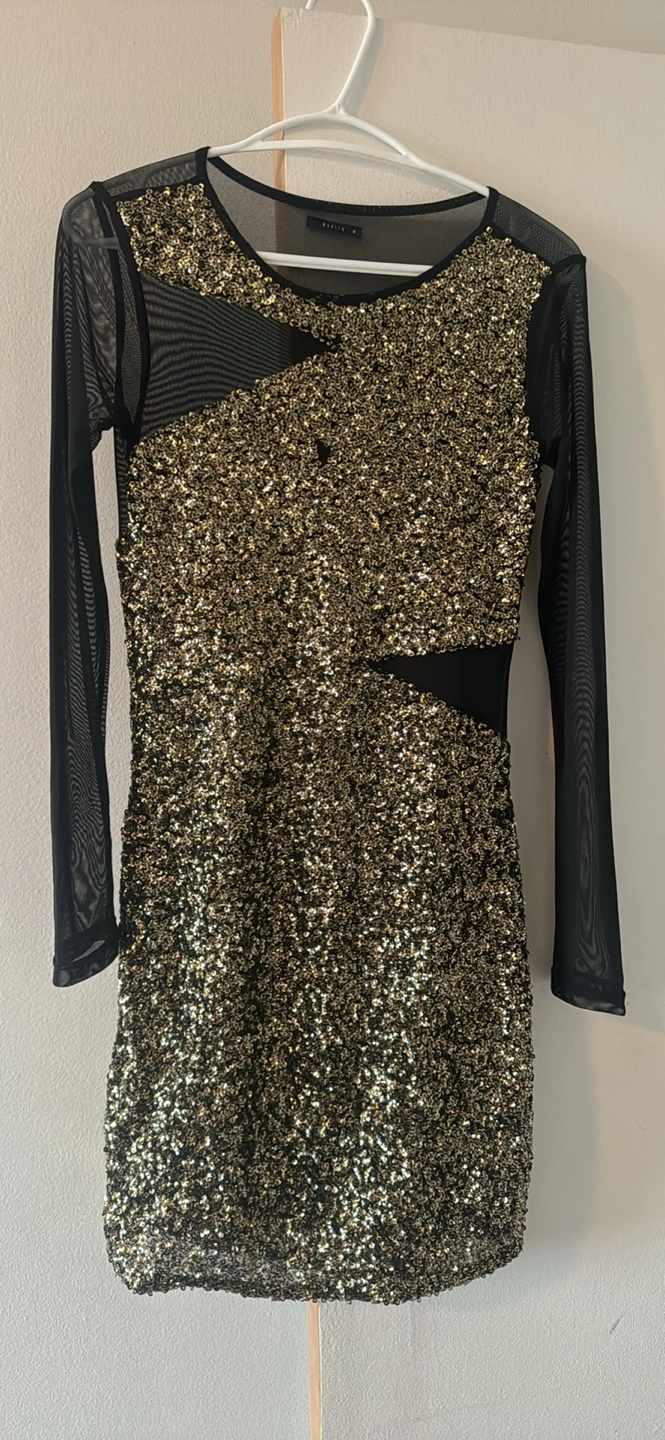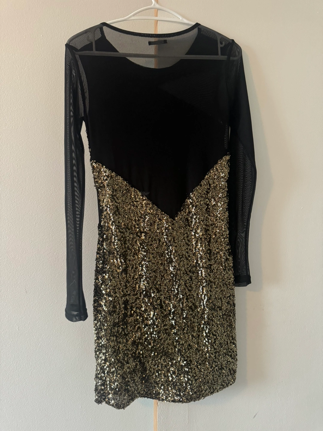 Long-sleeved dress with mesh detailing, gold sequins, and a black bodice. Size small. Great condition