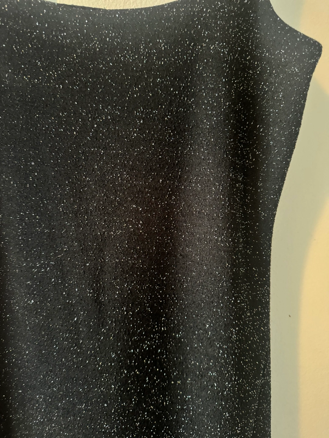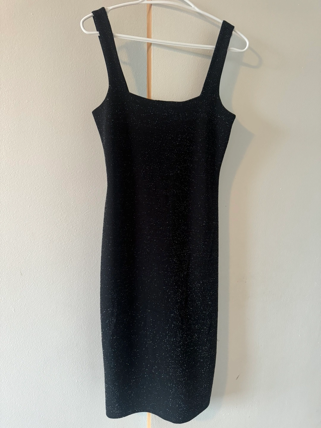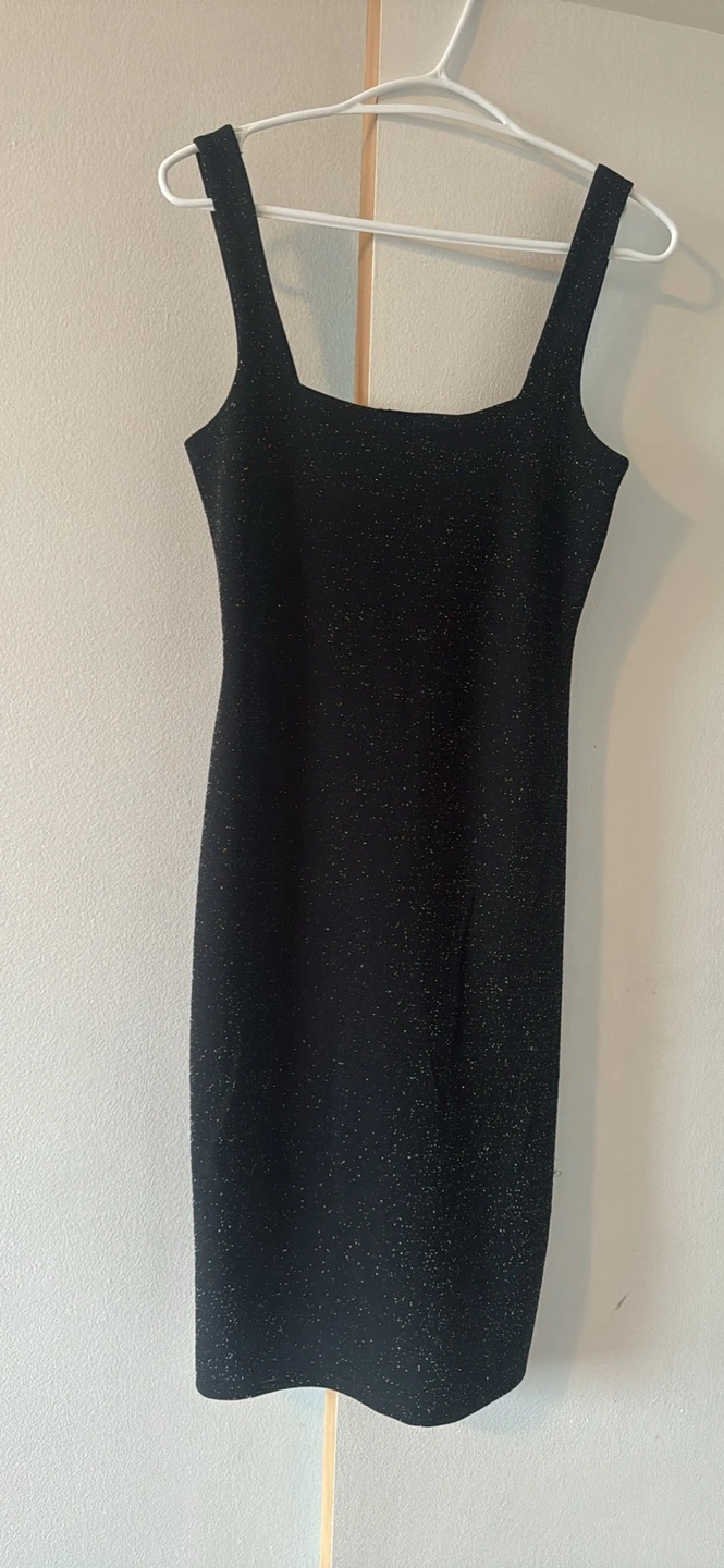 Black, sparkly dress. Sleeveless and fitted. Square neckline. Great for going out. Size S/M