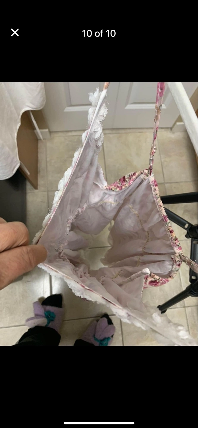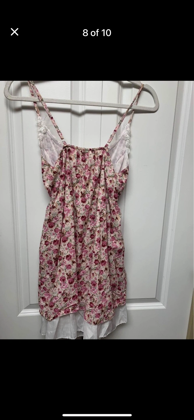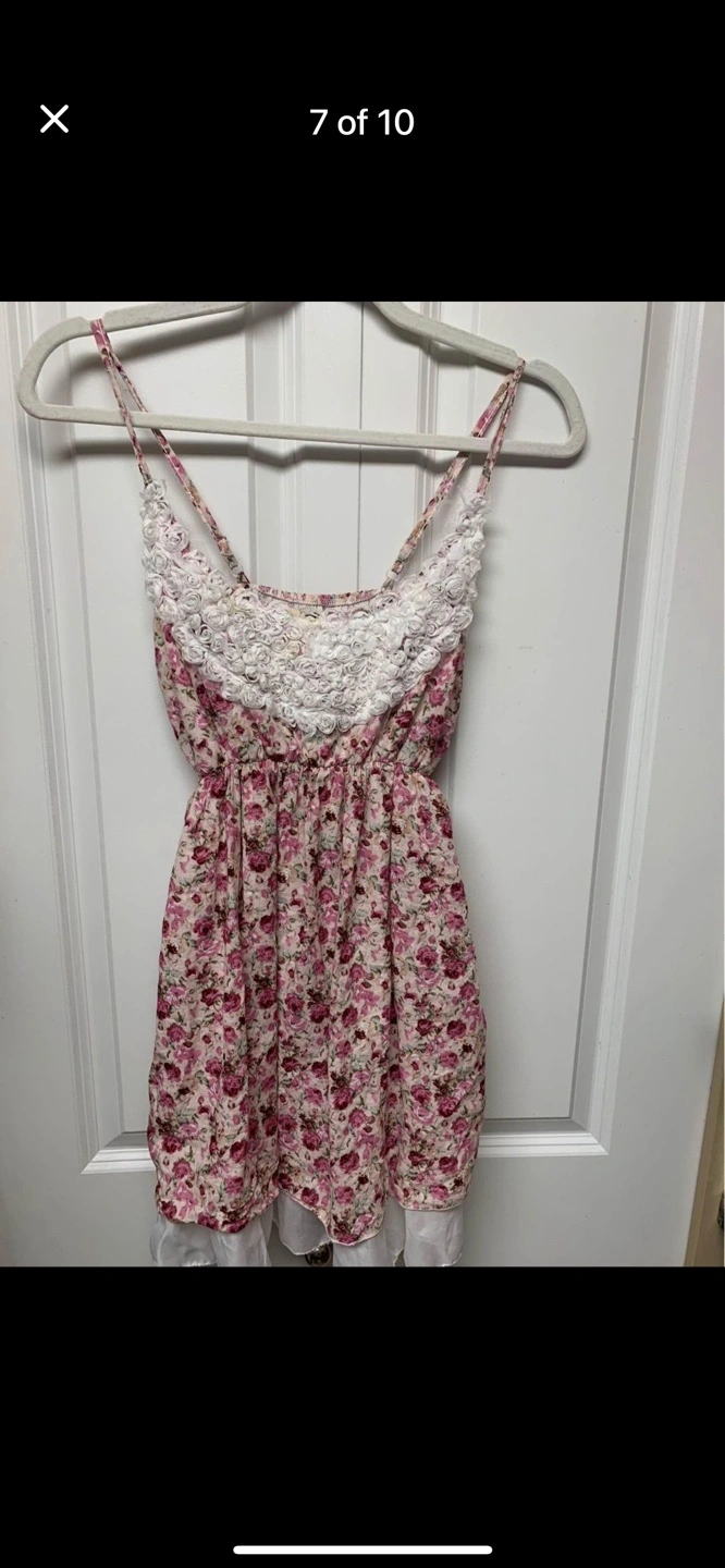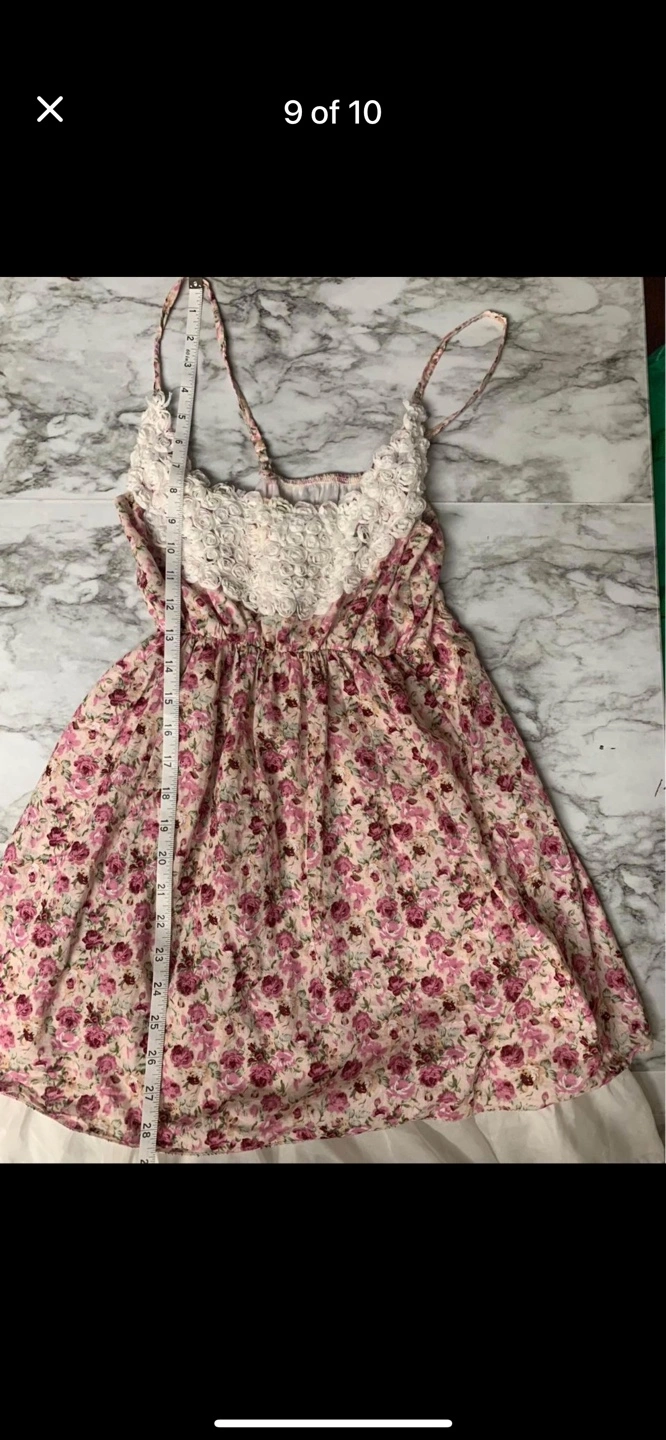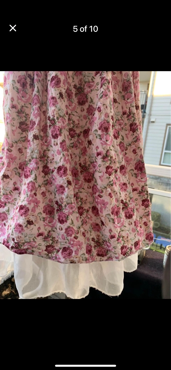 Women’s Boho Floral Chiffon sleeveless pink with white dress with lace detail and a white slip underneath. Adjustable straps. From shoulder to bottom 28” Stored in a smoke,pets free home Cash only and pick up at Port Coquitlam