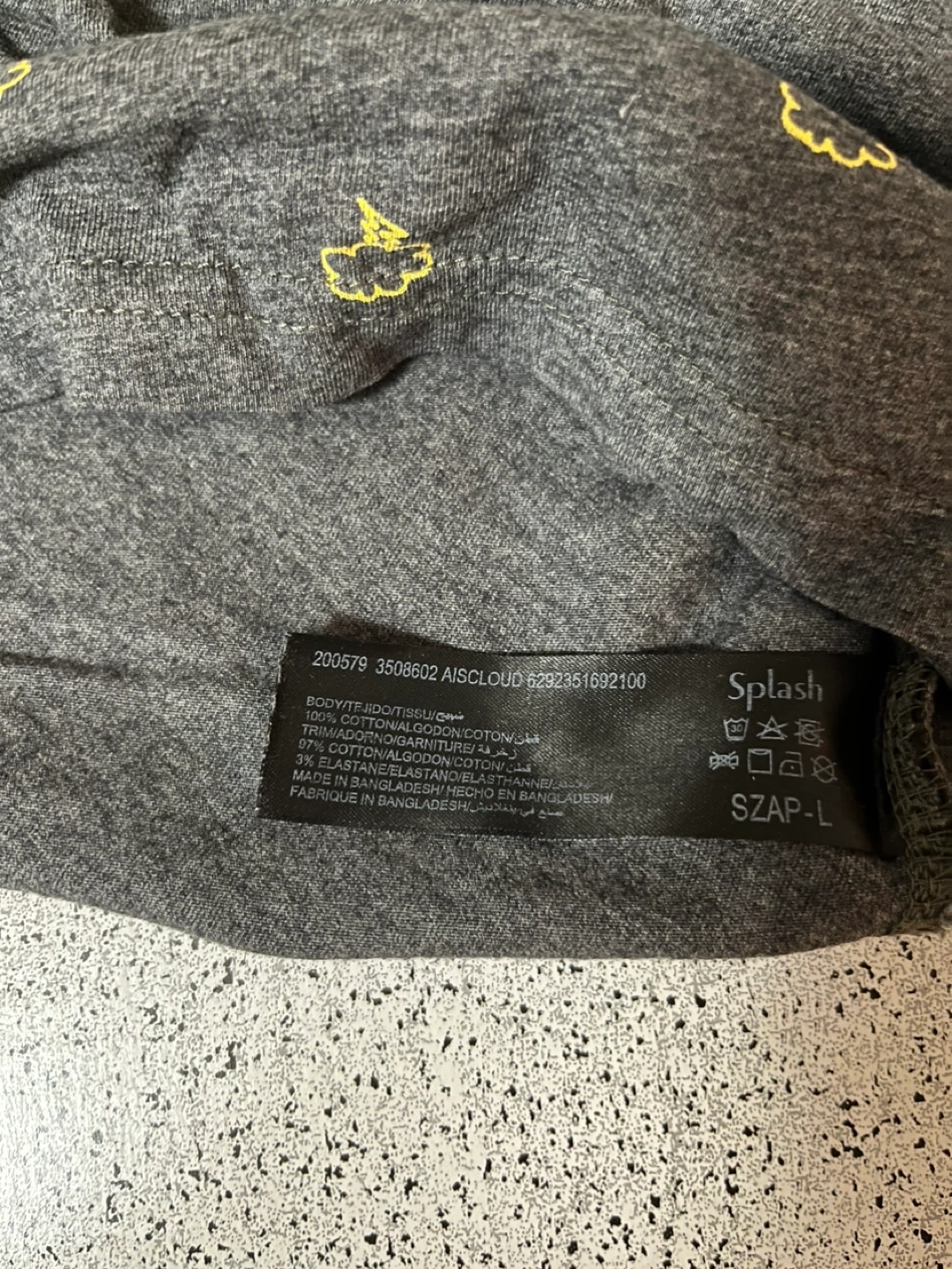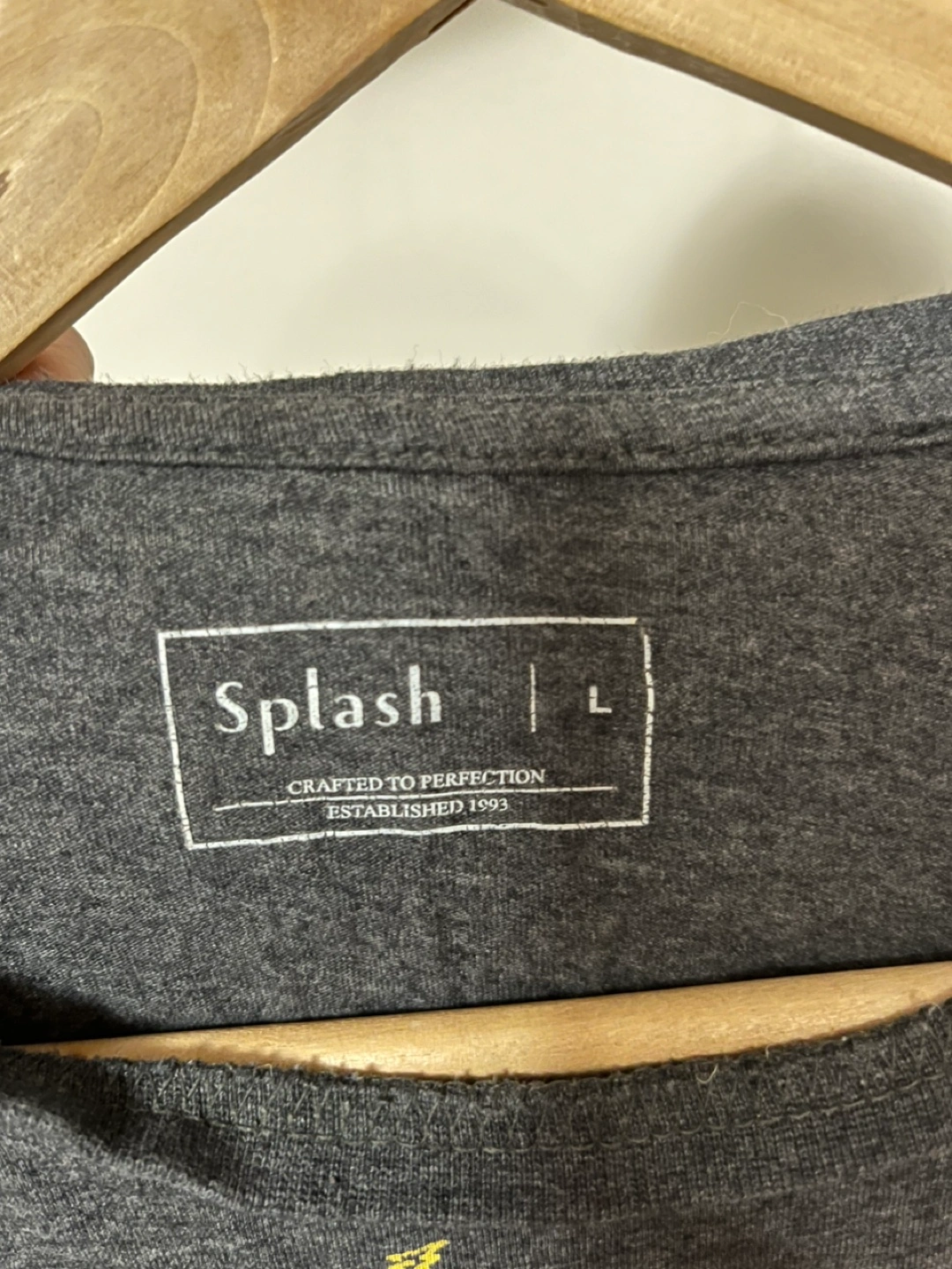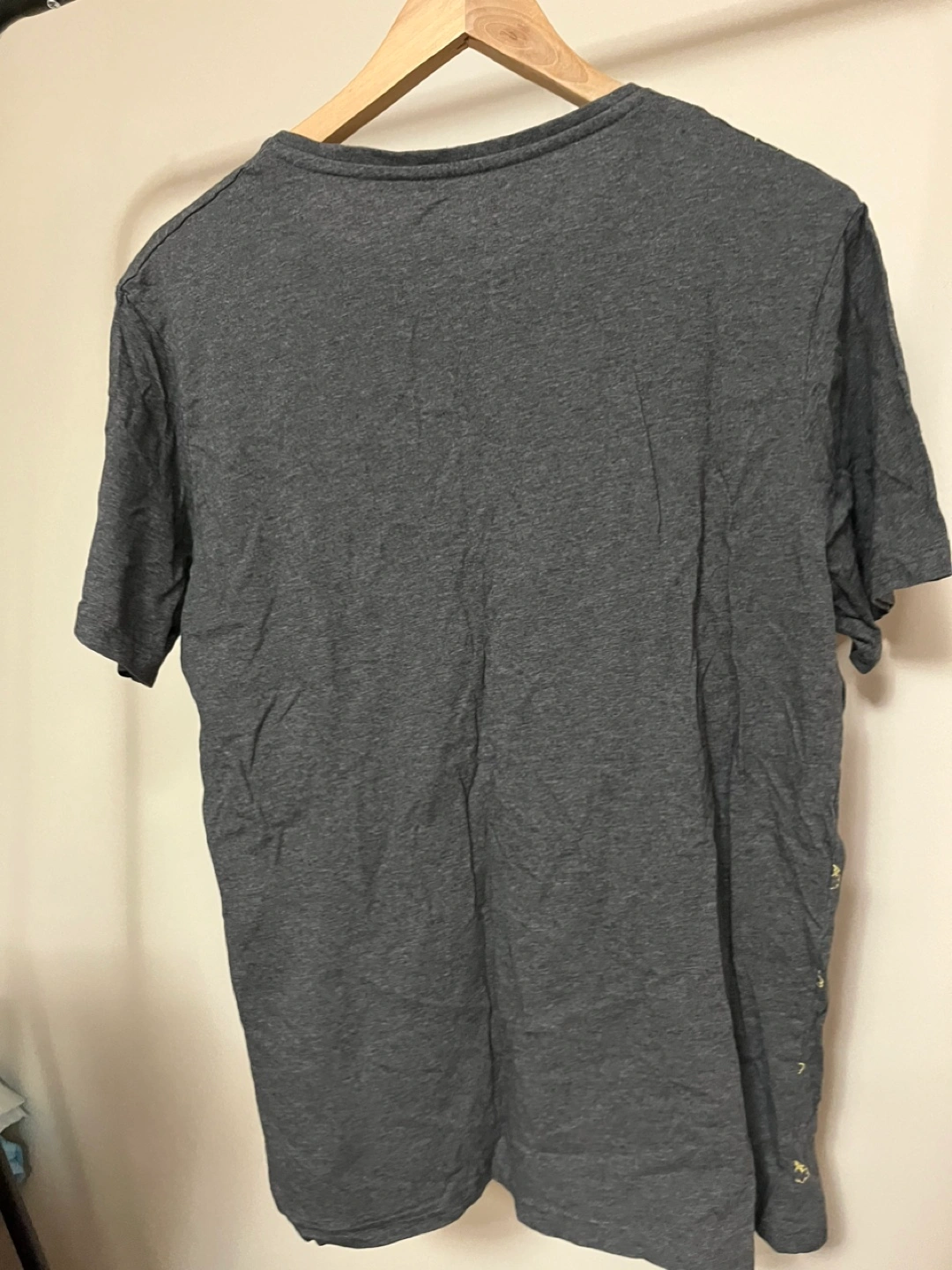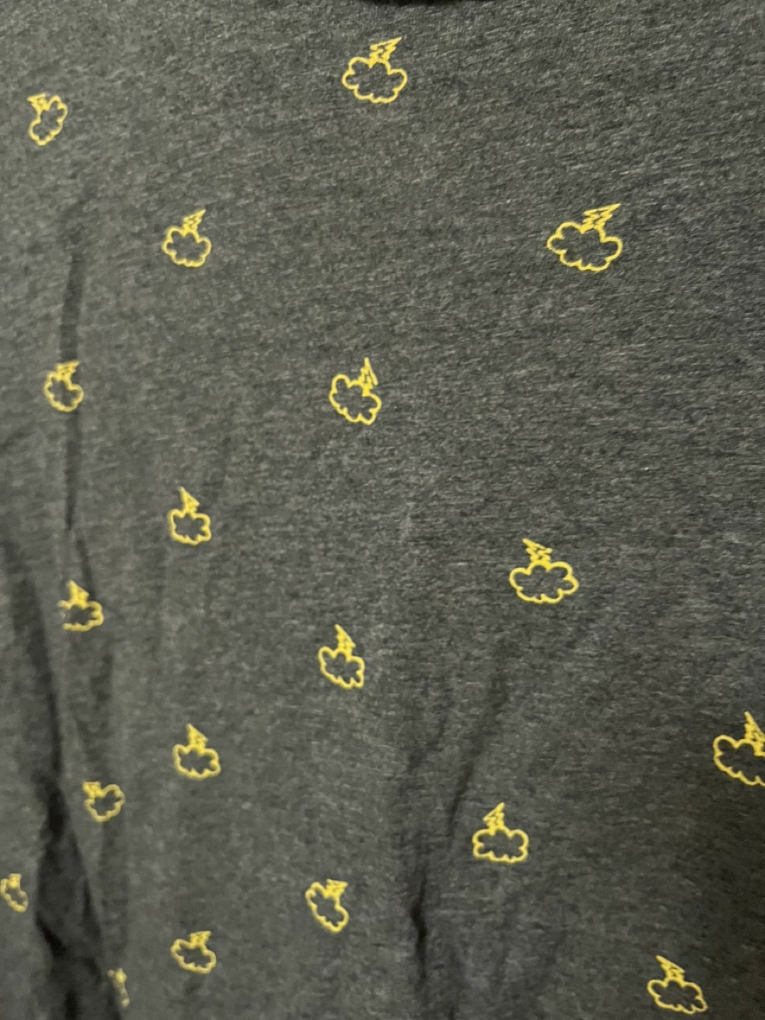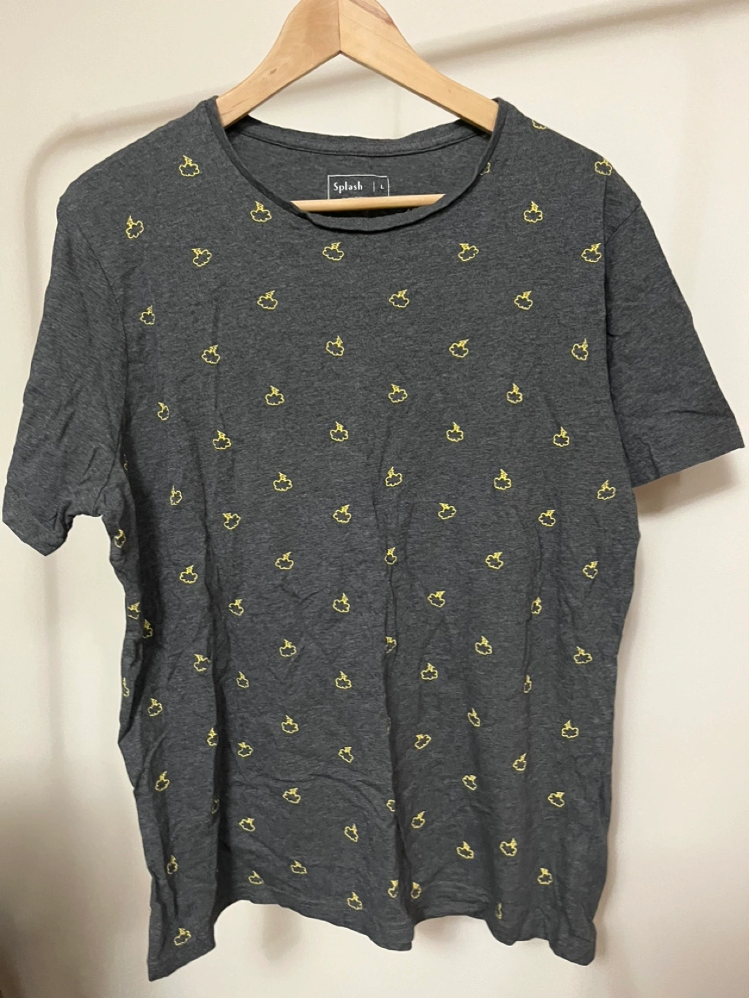 Grey t-shirt with a yellow cloud and lightning bolt design. Short sleeves. Size L. Pick up by Keele and Rogers Cash only