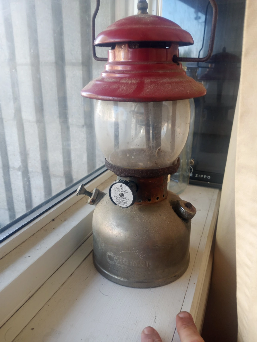 Vintage Coleman lantern. Red top, silver base. Includes glass globe.( curved glass)