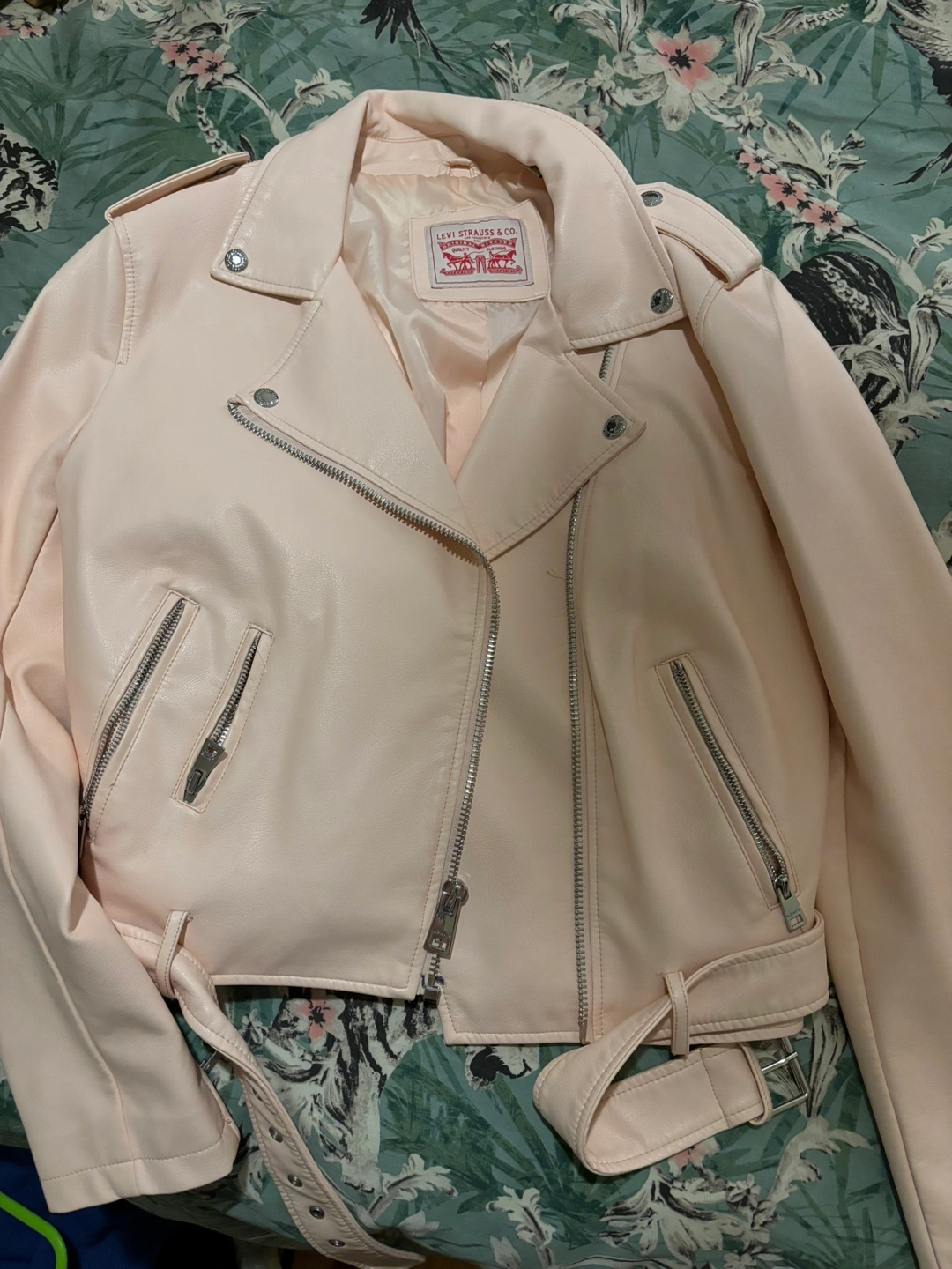 Pink faux leather jacket with a belt. Zipper closure and pockets. Good condition.
