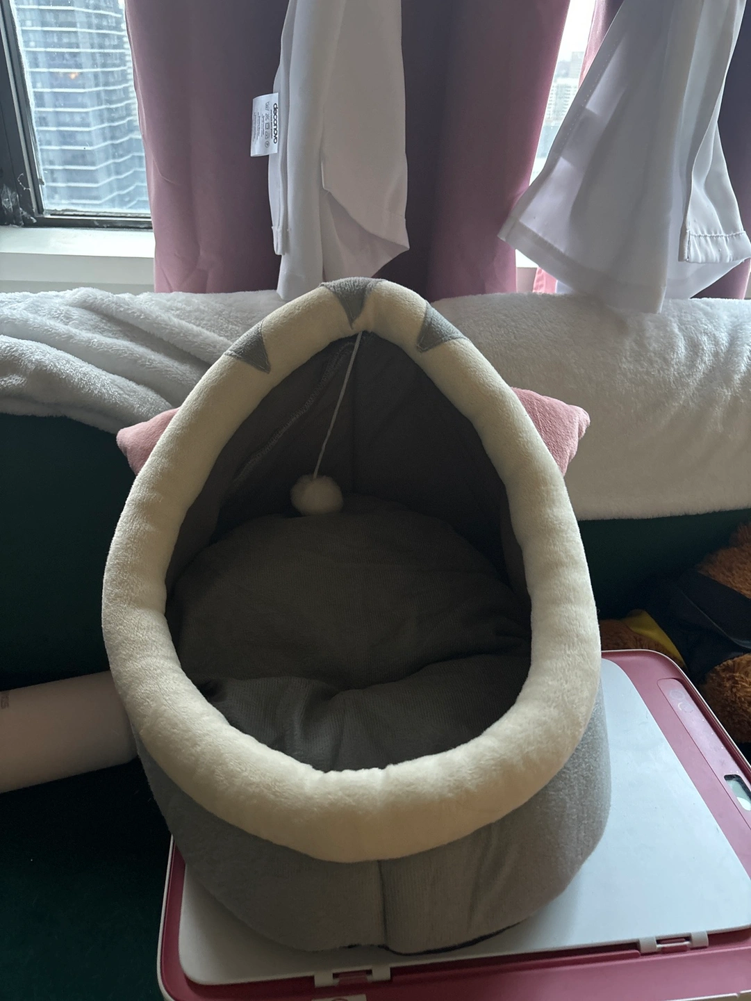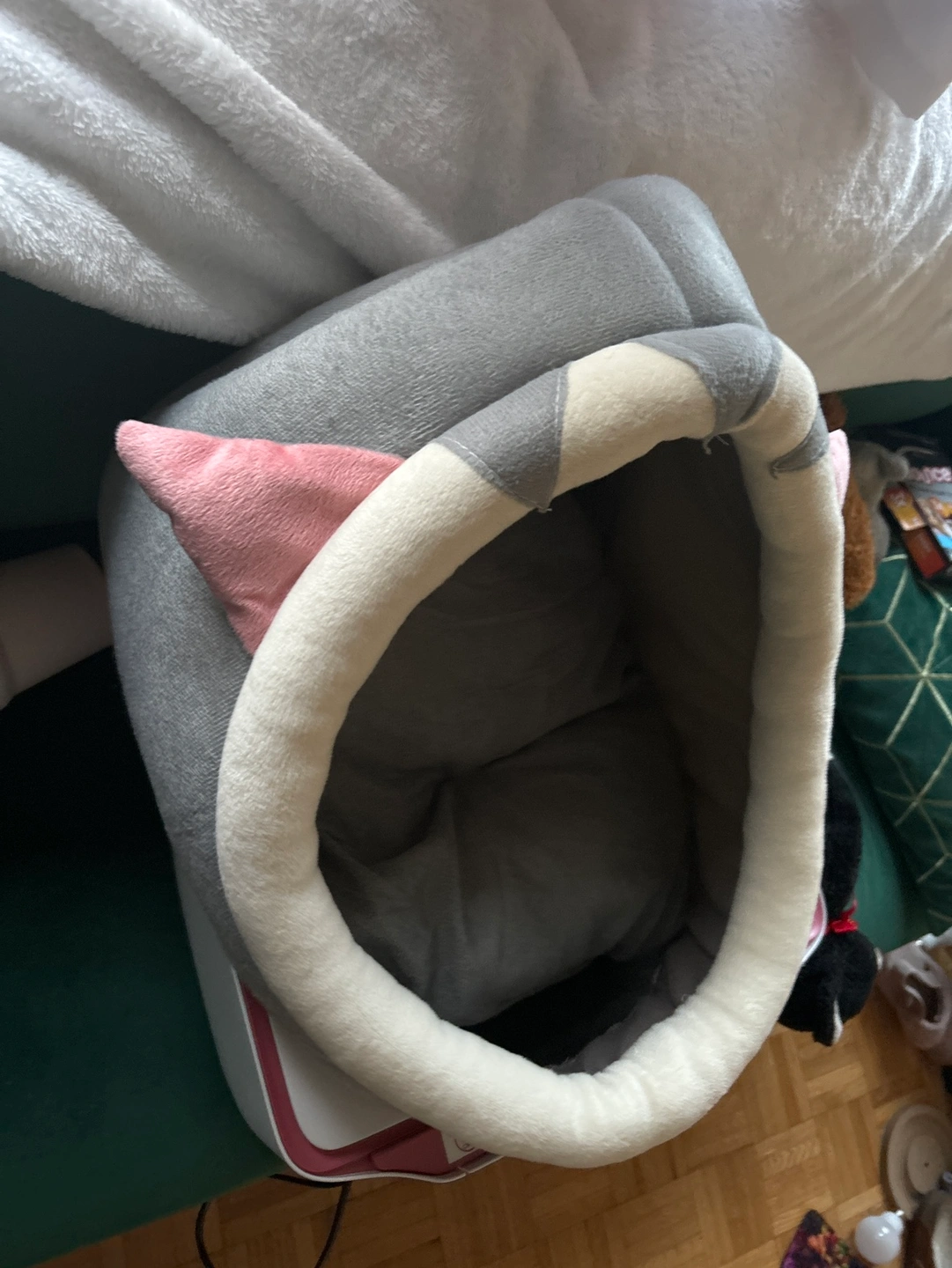 Soft grey and pink cat bed with a white trim. Comes with a removable cushion.