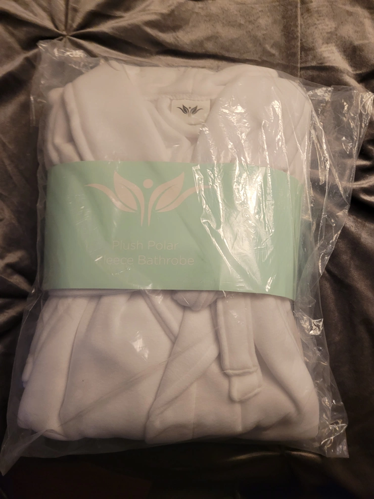 White plush fleece bathrobe, new with tags. Comes with a self-tie sash.