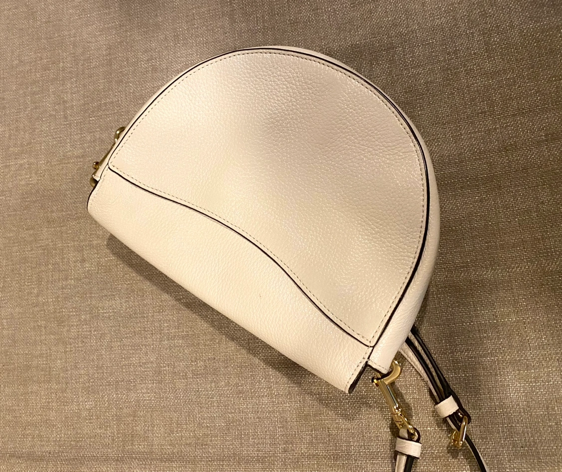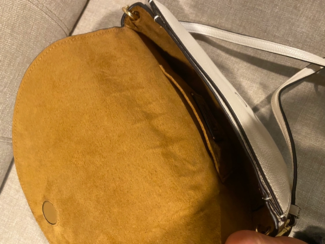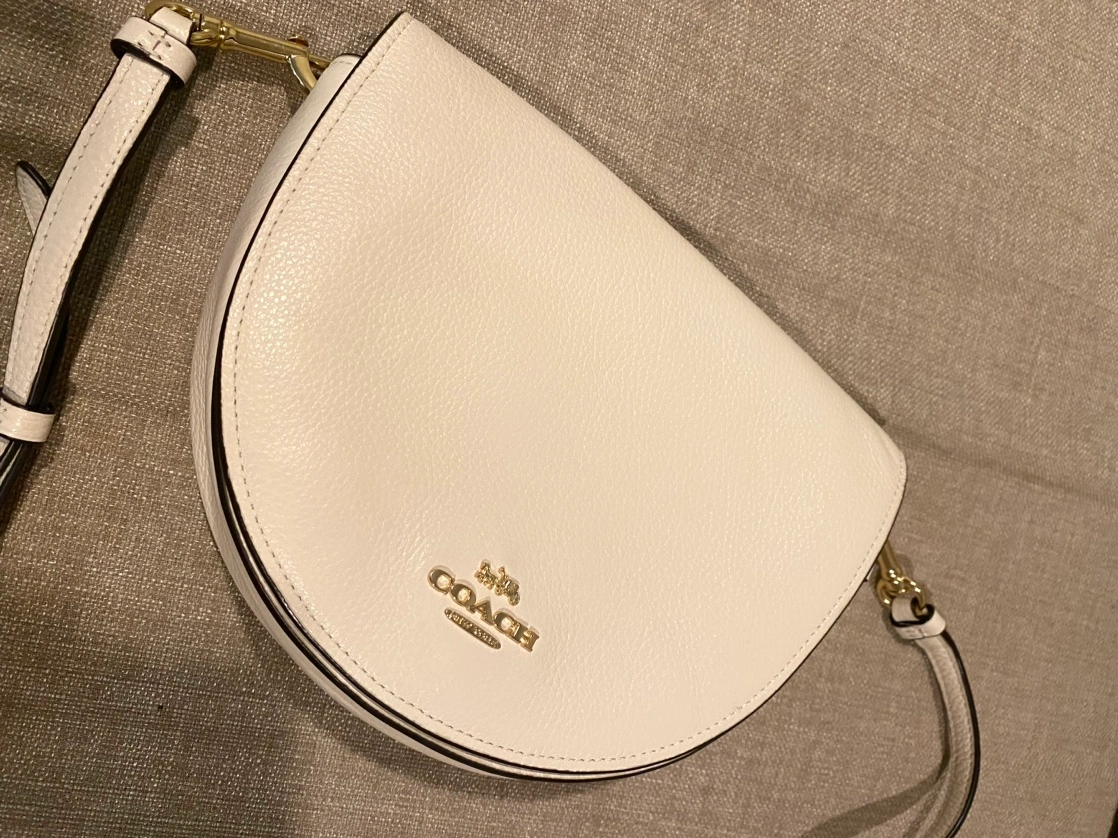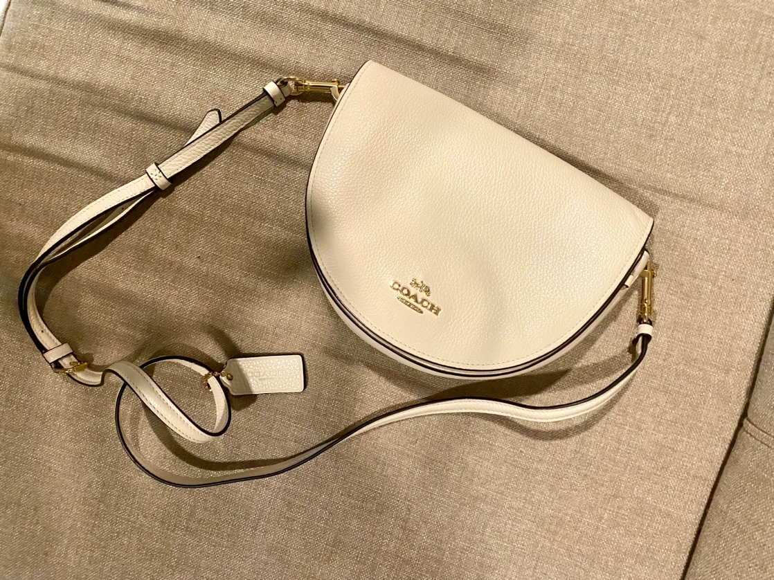 White leather crossbody bag with adjustable strap. Only used few times; very likely new. Pebble leather exterior . Magnetic snap. Width 8.3 x Height 6.1 x Depth 2.6 inches