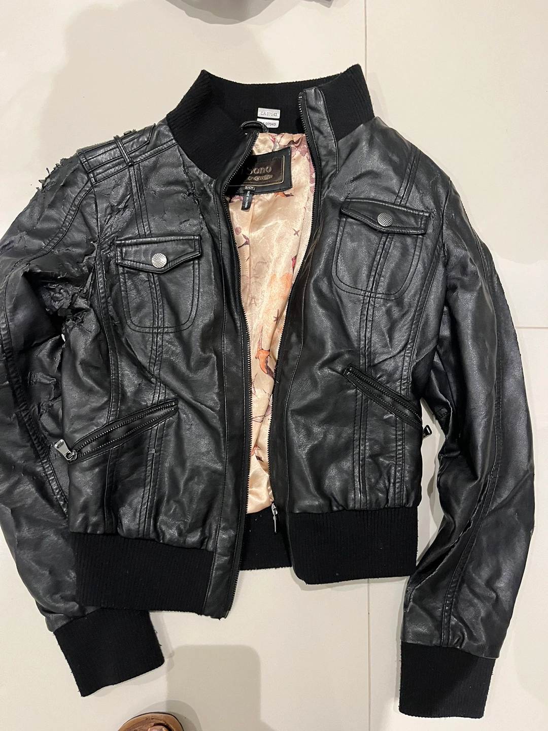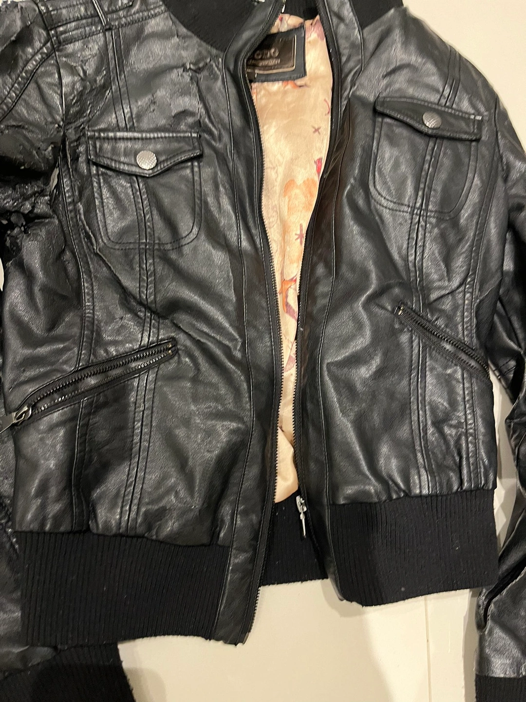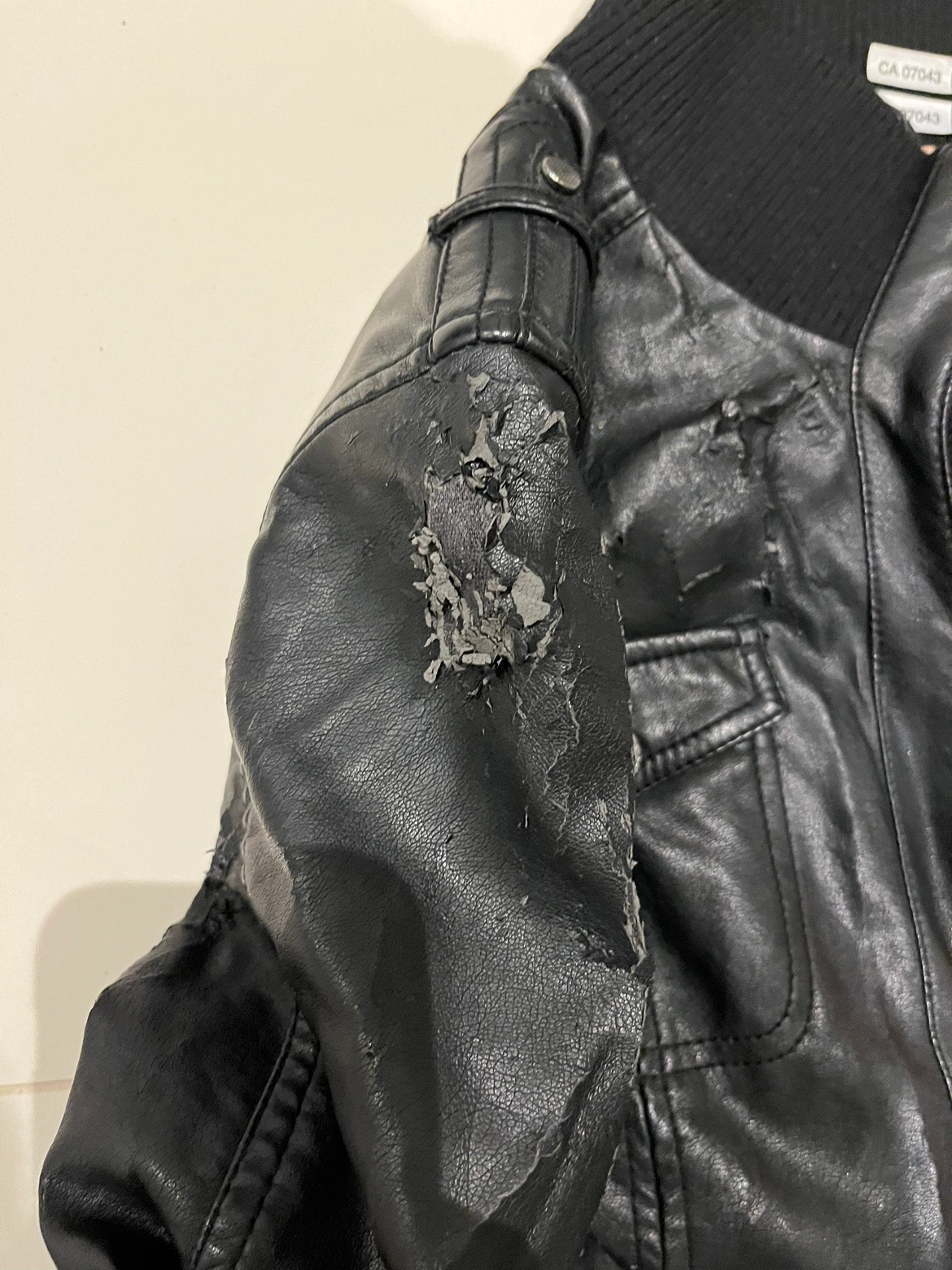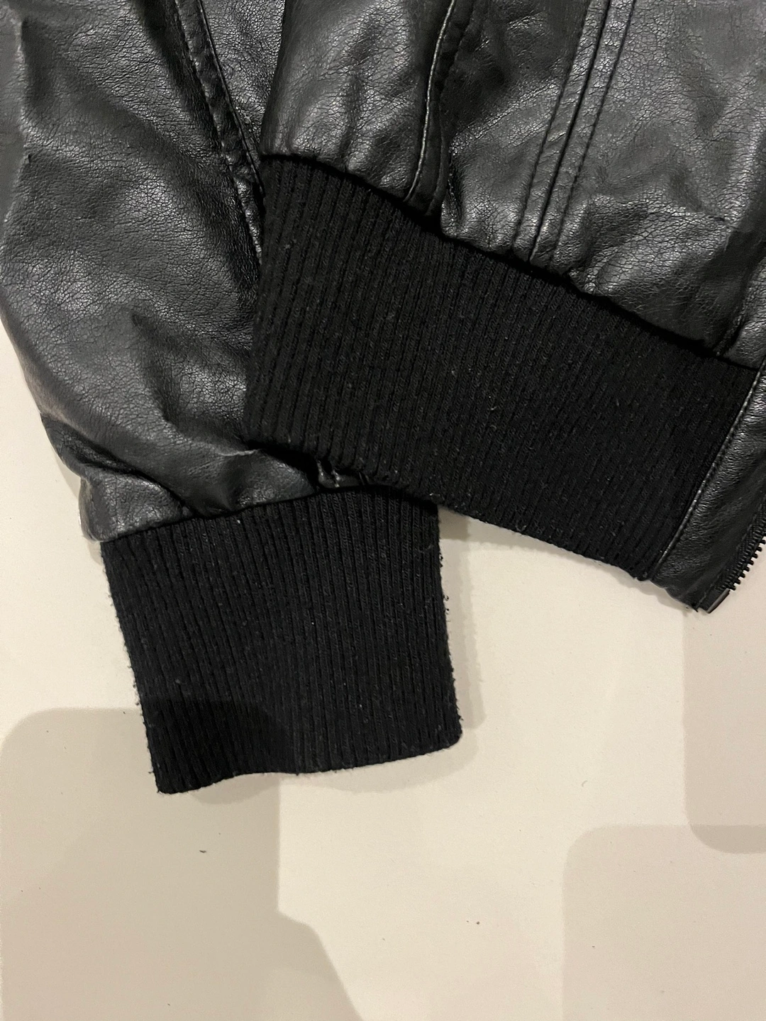 Black bomber jacket. Cuffs and waistband in excellent condition. One area at shoulder approximately 1.5 x 1.5” that the leather is flaking off. Pick up at Bloor & Church between Tuesdays through Thursday week of Nov 4th