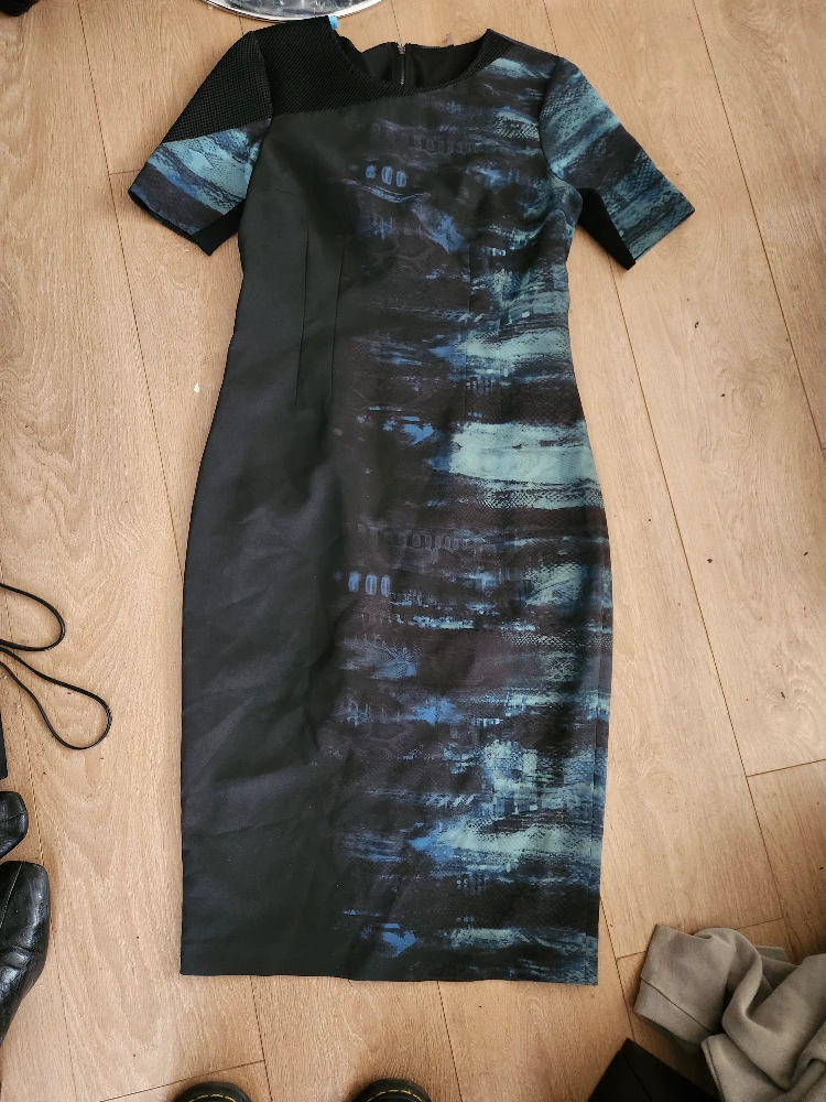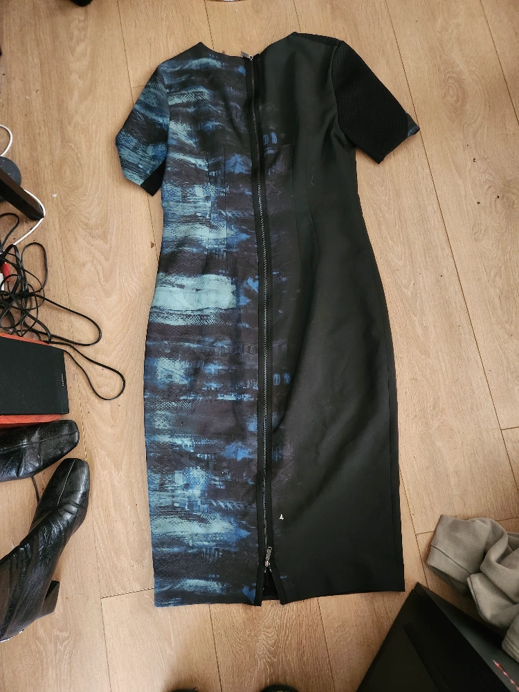 R.J Clothing Short sleeve, midi-length dress. Black on one side and blue abstract print on the other. Zipper closure on the back. * Cash Only * * No E-transfers * * Pickup Only * * Serious Offers Only *
