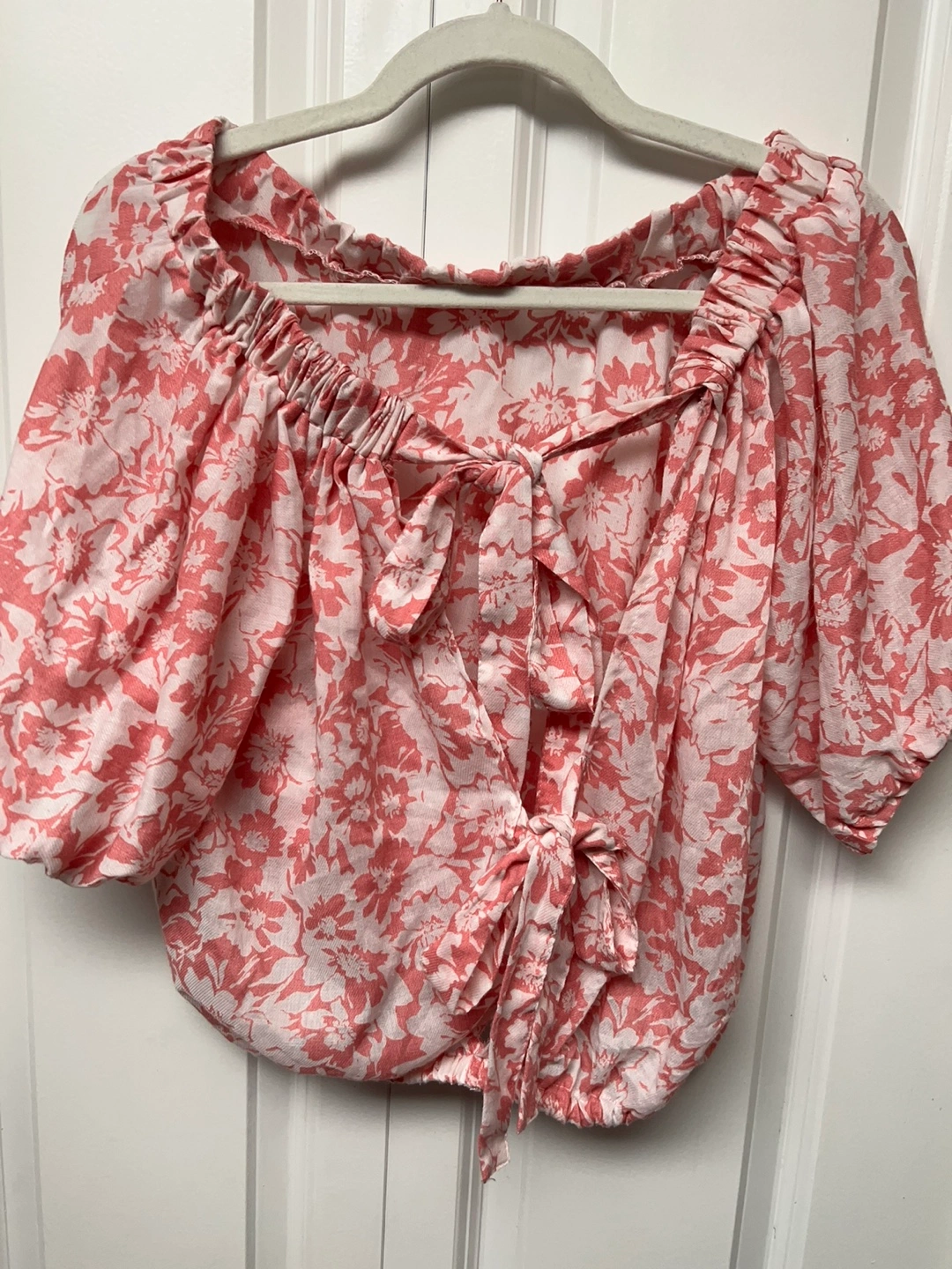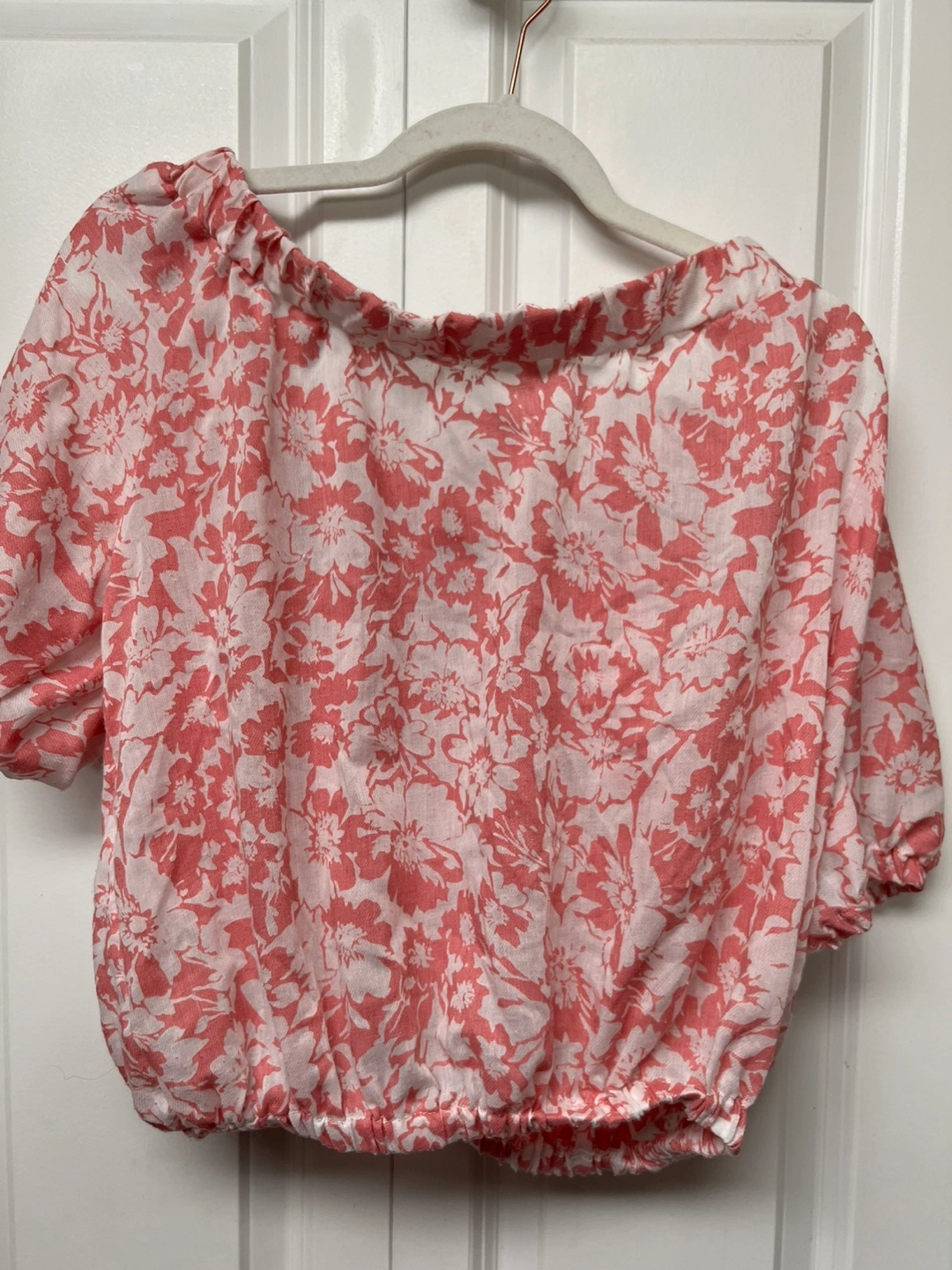 Pink and white floral off the shoulder top with a tie in the back. Short sleeves. Crop top. Stored in a smoke, pets free home Cash only and pick up at Port Coquitlam