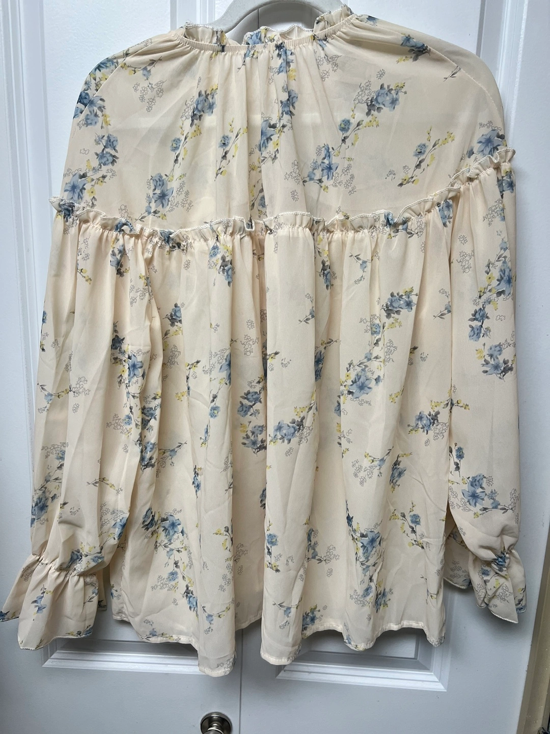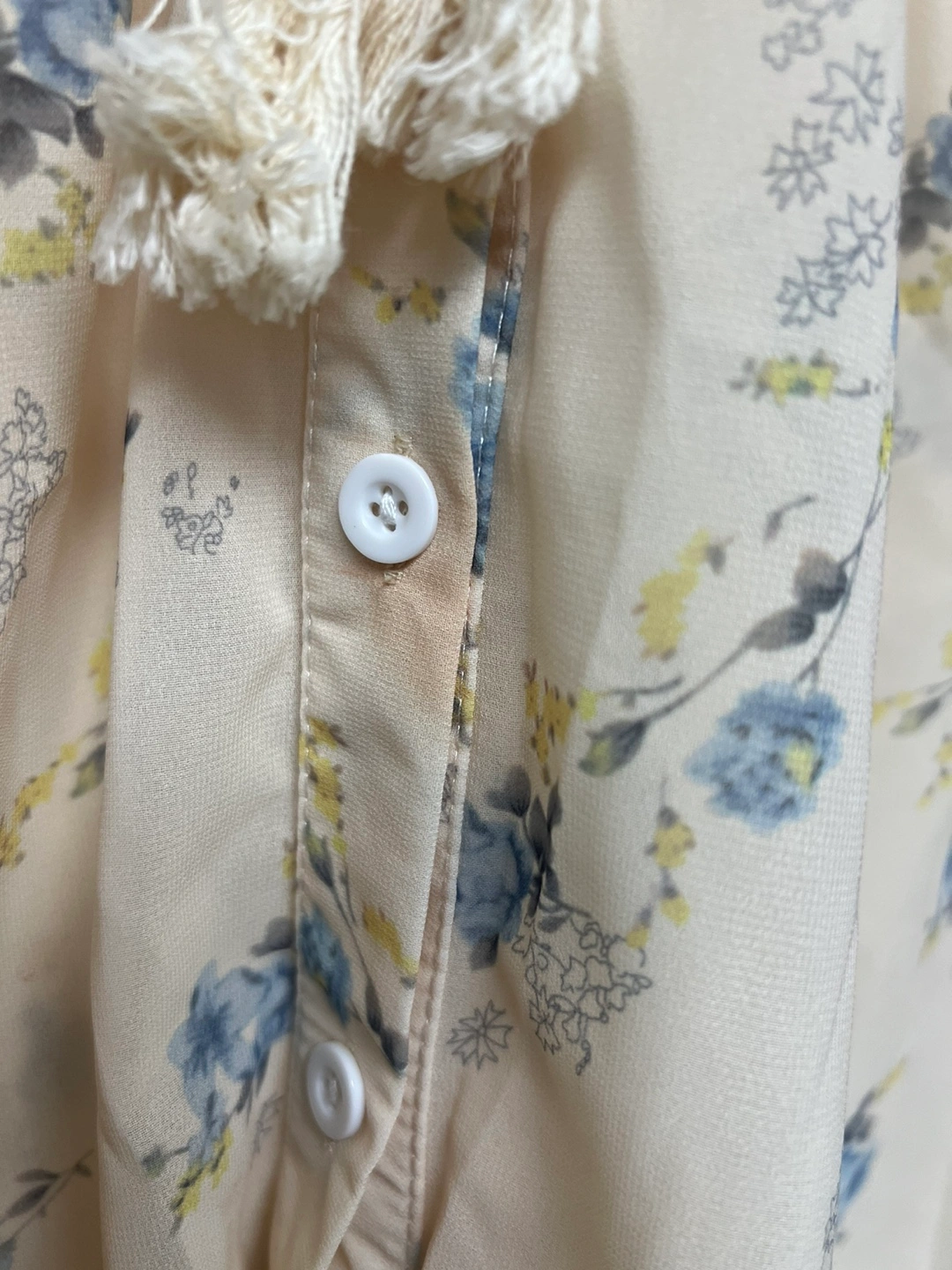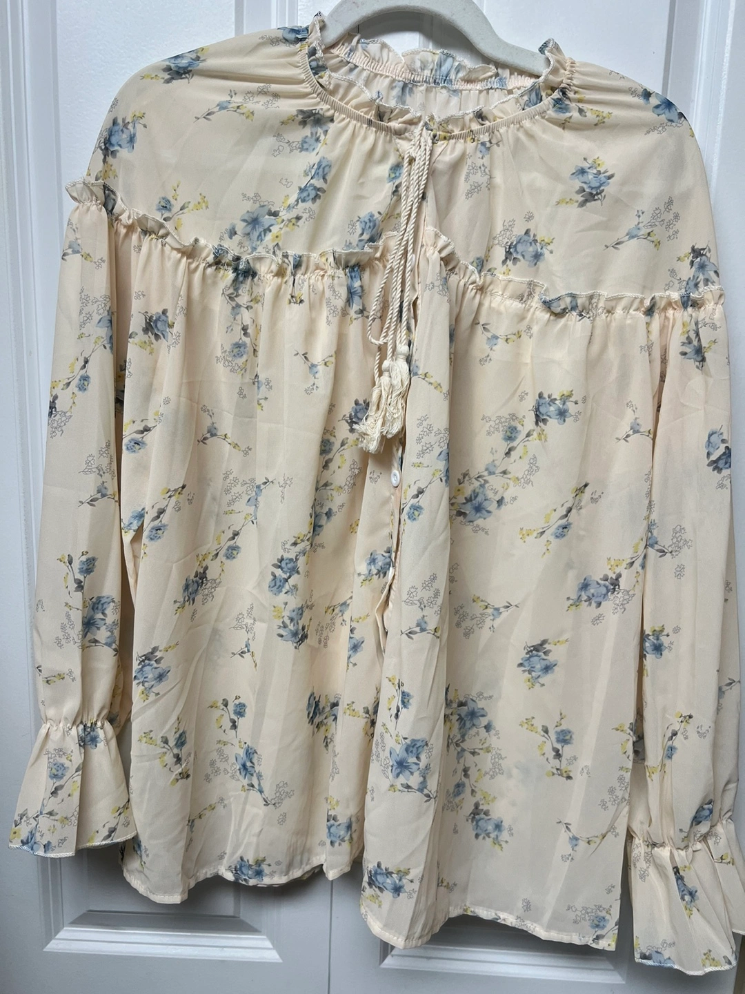 Long-sleeved blouse with a floral print. Features a tie at the neck and a button-up front. Has a minor yellow mark around button area, stored in a Smoke,Pets free house Cash only and pick up at Port Coquitlam