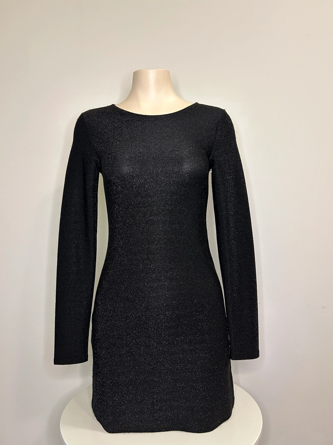 Black mini dress with long sleeves and a fitted silhouette. Made from a stretchy fabric with a subtle sparkle. Cash only. Msg to schedule pick up:)