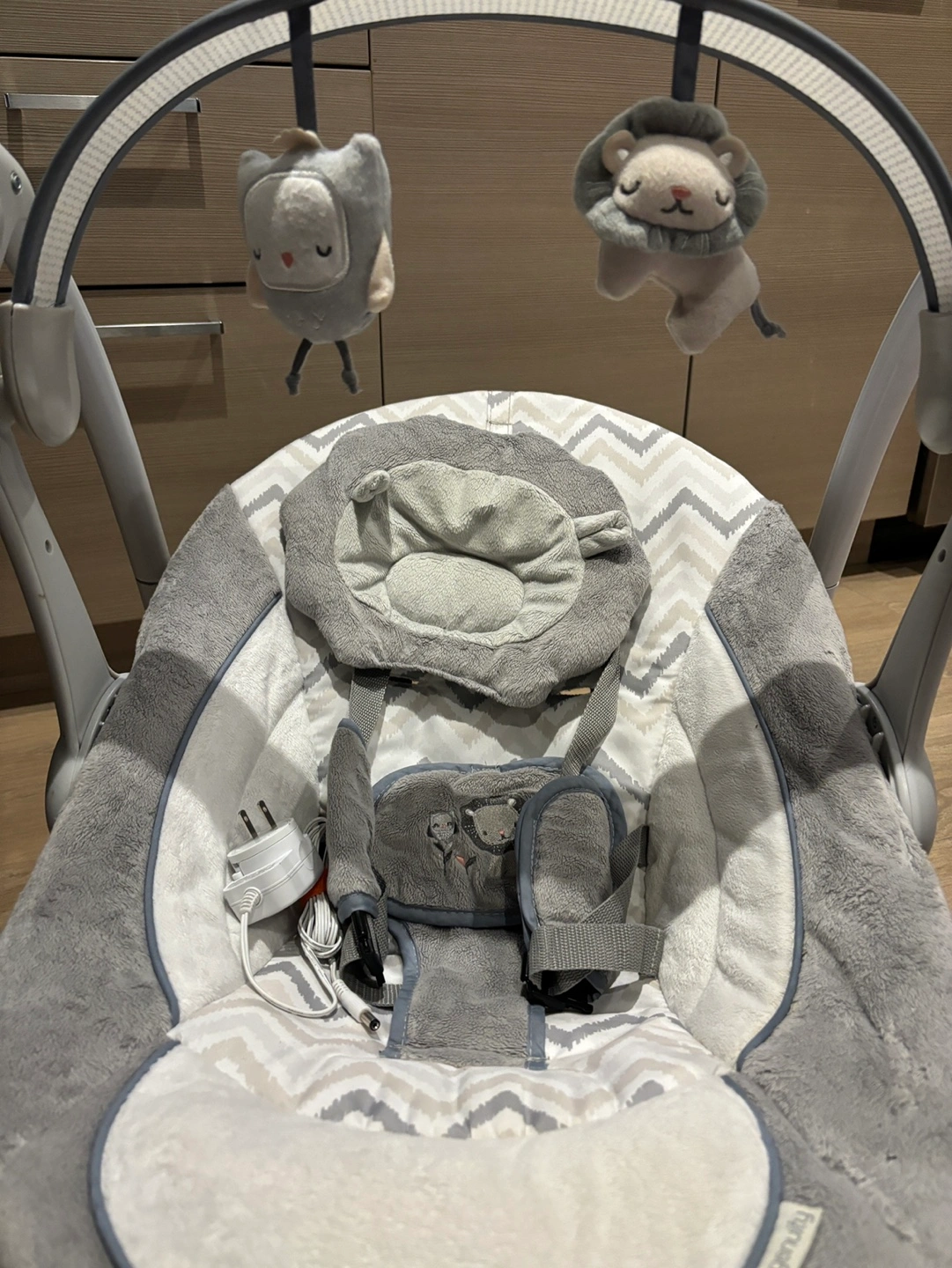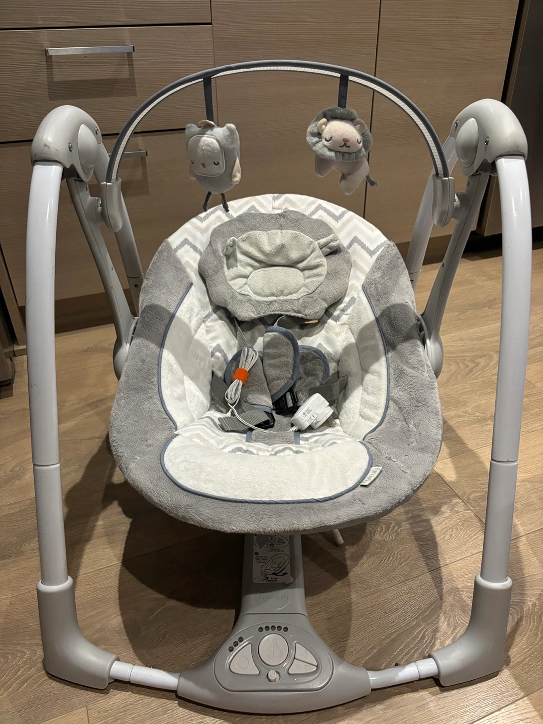 Grey and white baby swing with multiple speeds and sound options. It can also fold. Some buttons are a bit sticky and the seat has been sewn to fix a hole but the entire unit is in working condition.