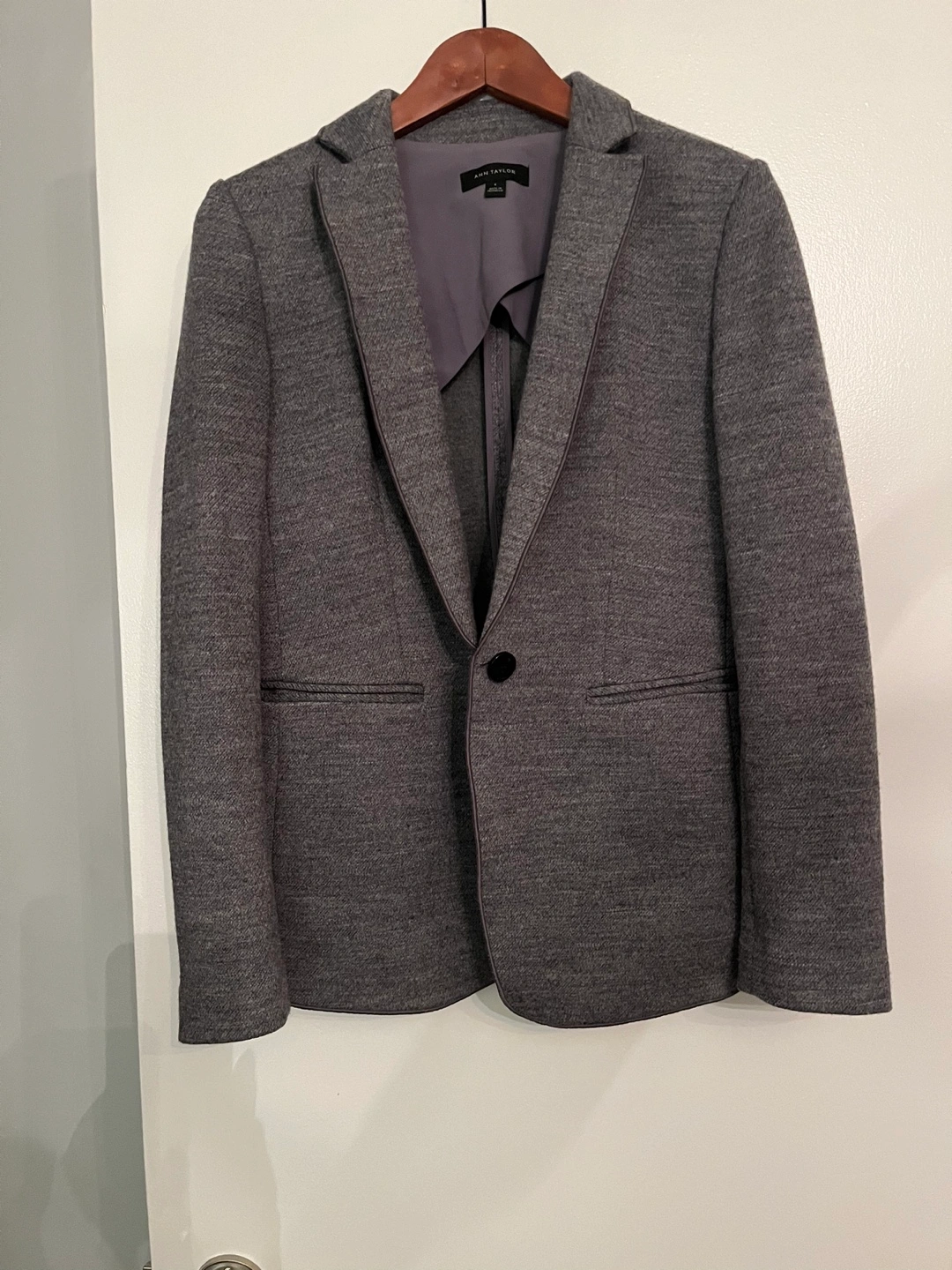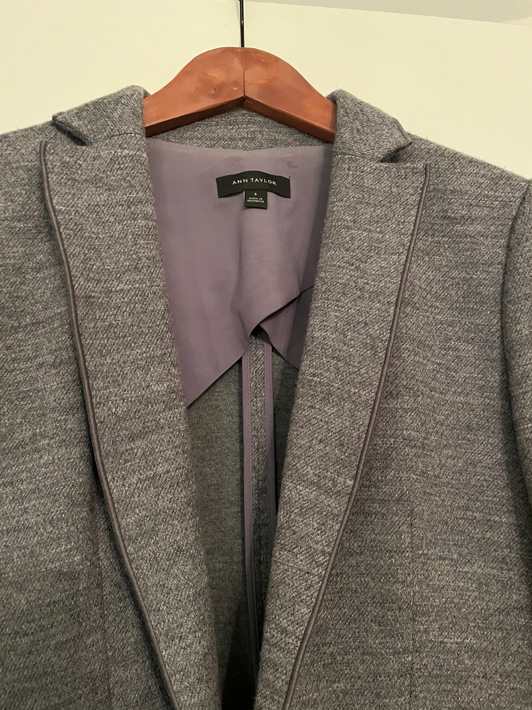 Grey blazer with a single button closure and a notched lapel. Trimmed with black piping. Wool blend. Partially lined.