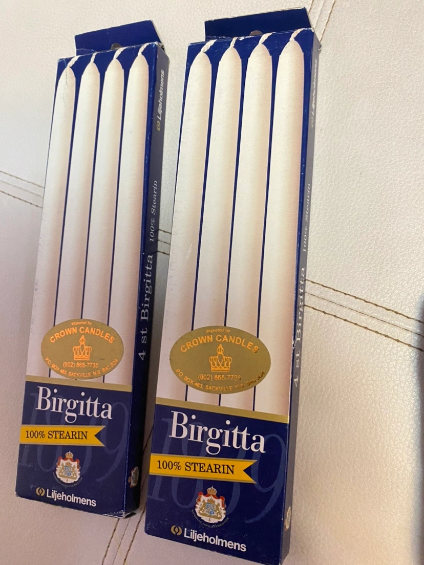 White candles in a box, imported by Crown Candles. 100% stearin. $10 each or $15 both 1 SOLD