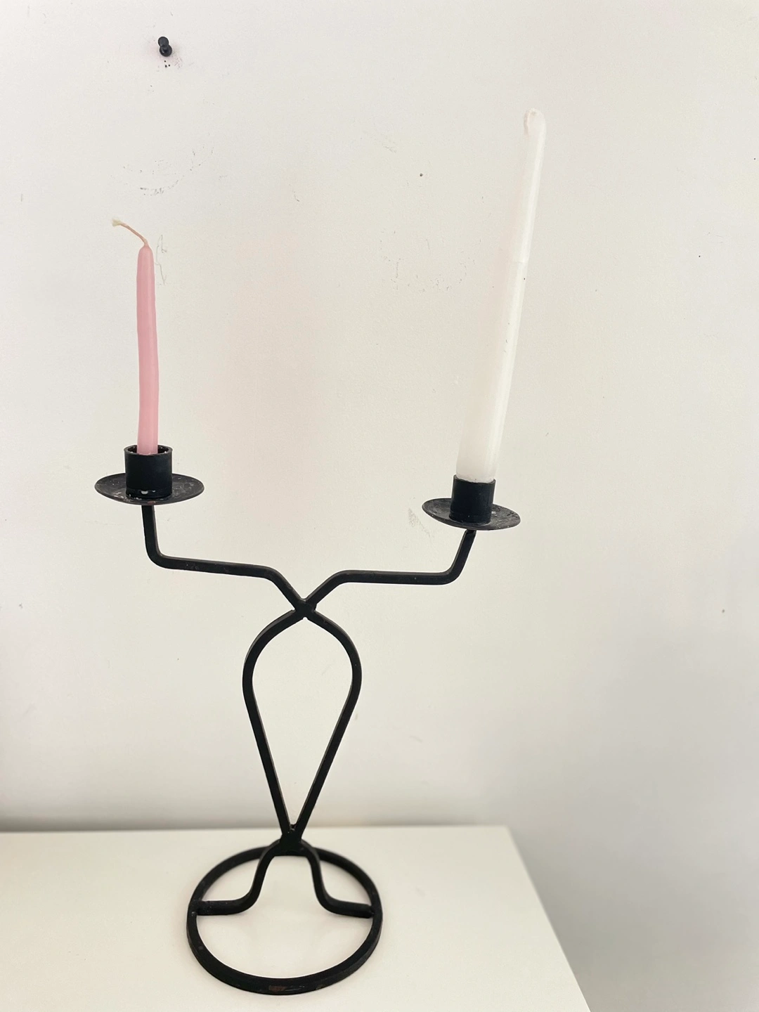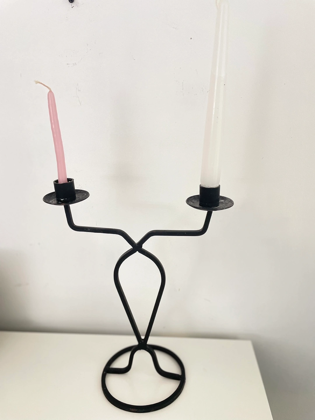 Two-arm candle holder made of black metal. Includes a round base and two arms that curve upwards to hold candles.