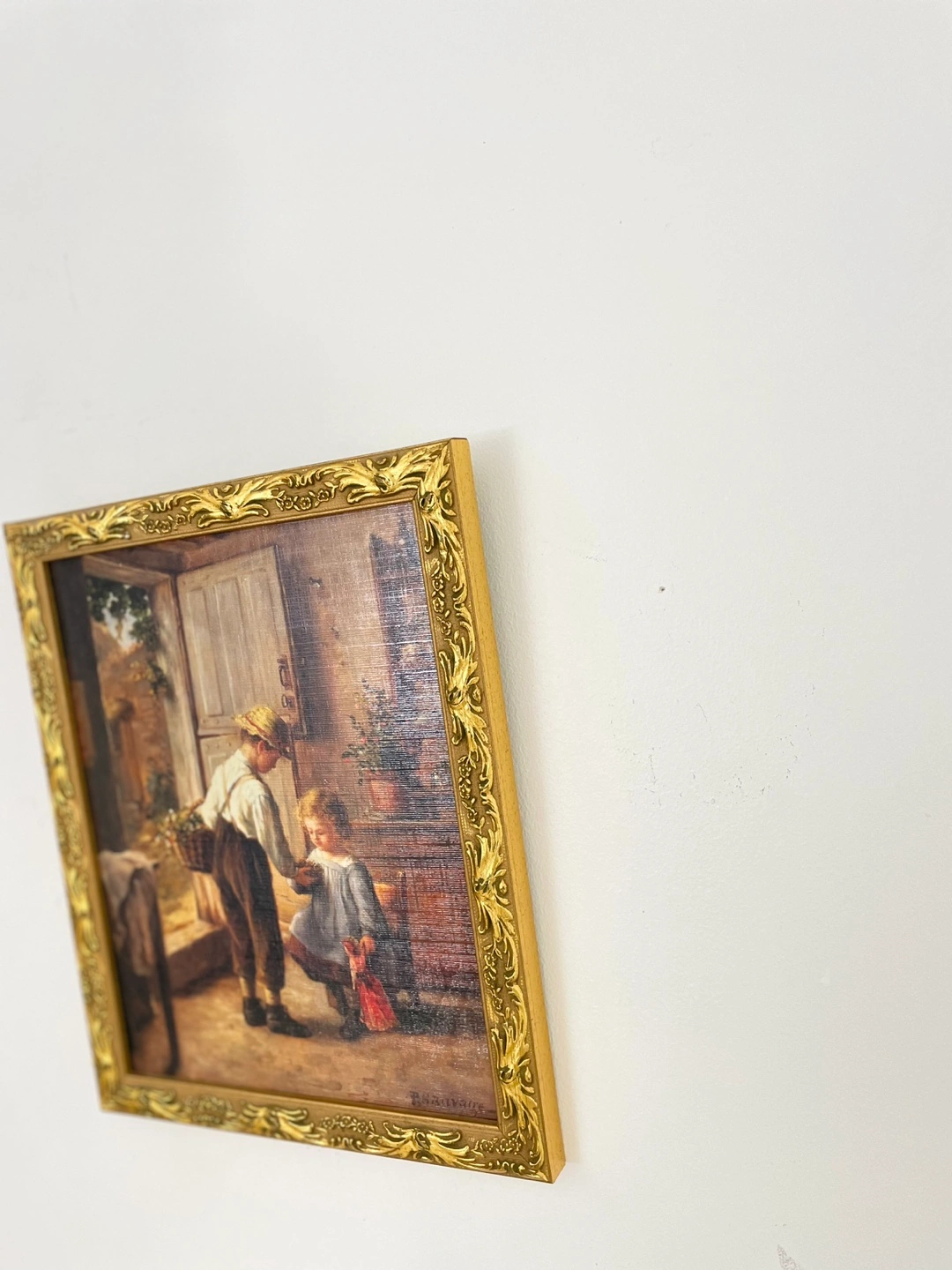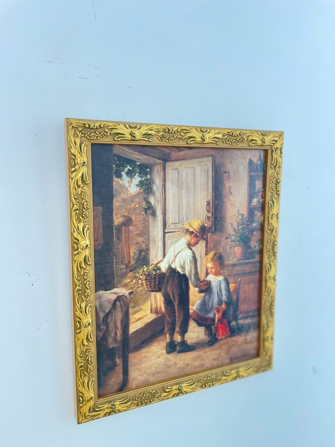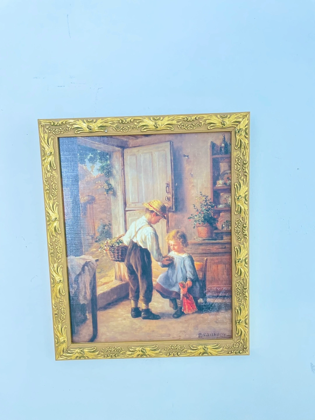 Framed print of a boy giving a basket of flowers to a girl, with a signature at the bottom.