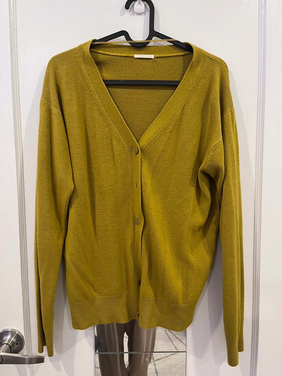 Bought in Tokyo. Long-sleeved, mustard coloured cardigan. V-neck and button up.