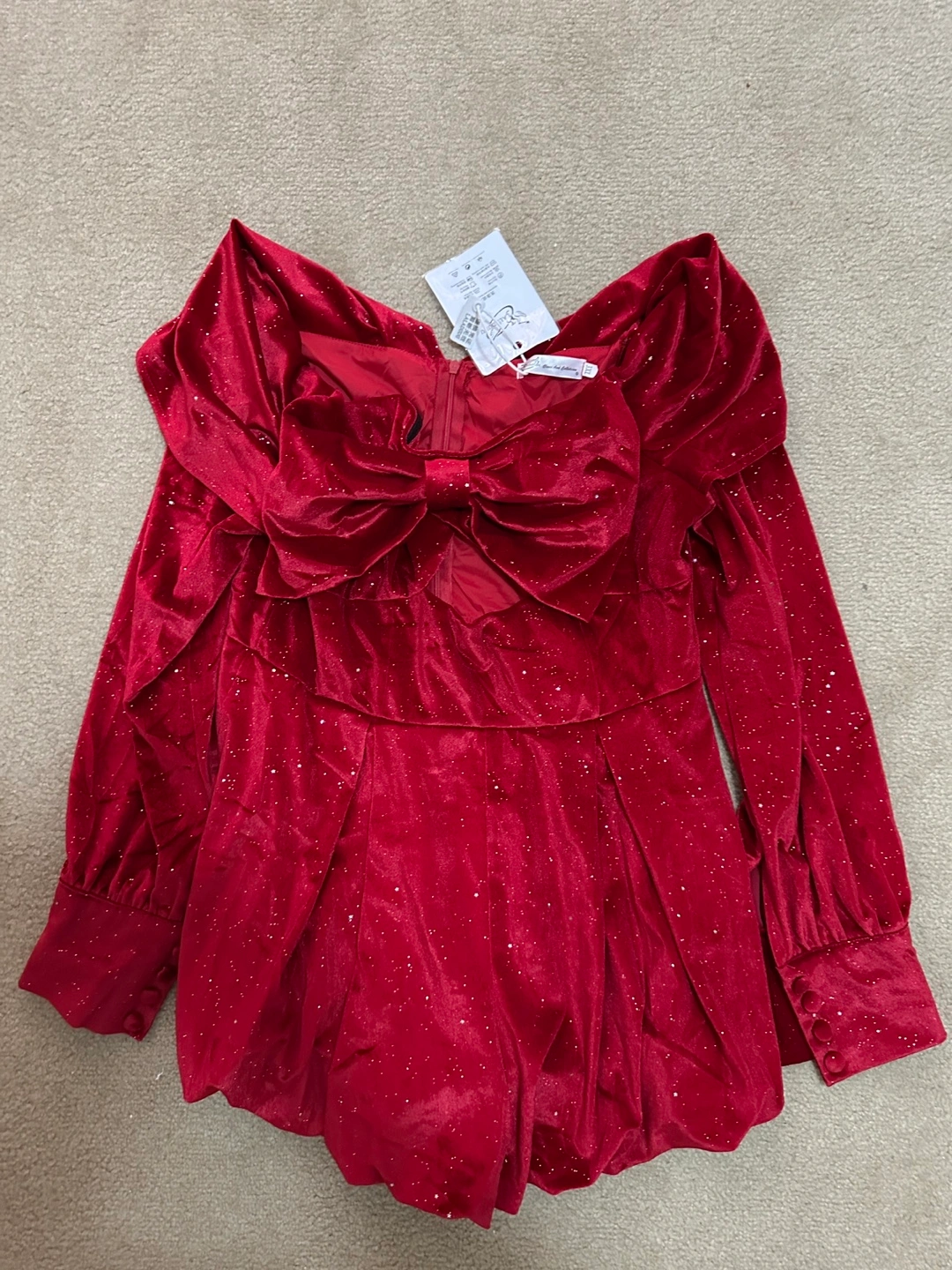 Red velvet jumpsuit with a large bow at the neckline. Long sleeves with button cuffs. Glittery fabric. This jumpsuit is perfect for a night out or a special occasion. Size fits L/XL
