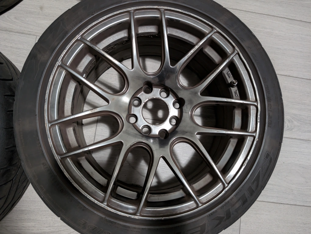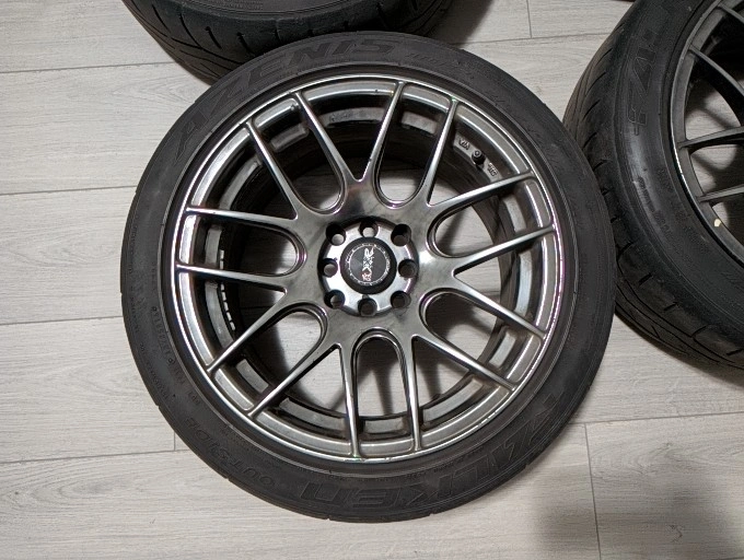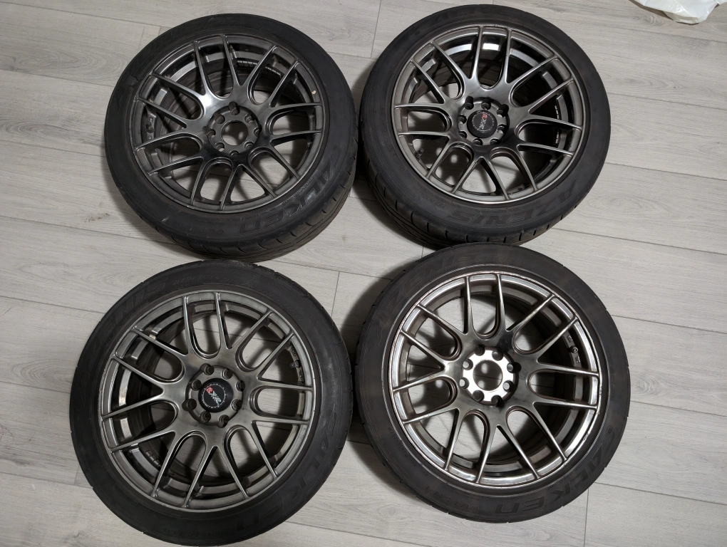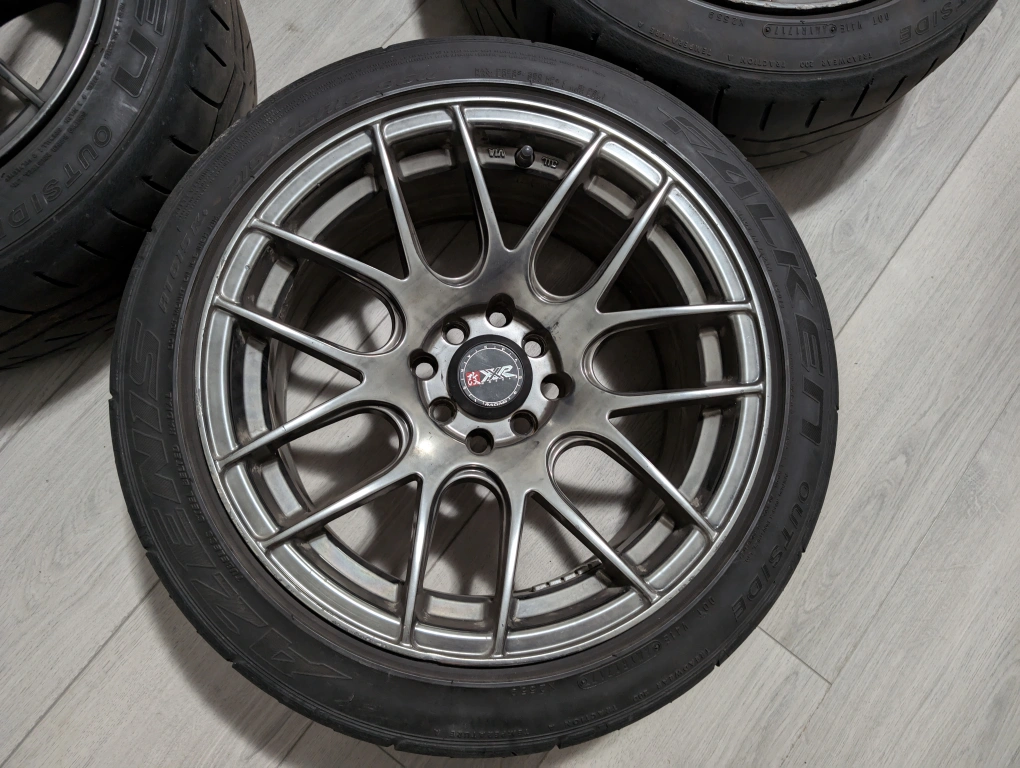 Set of 4 XXR 527 rims. two missing centre caps. 1 lip bent, still holds air recommend to replace tires, good for rollers has another bolt pattern, unsure, possibly 4x114.3