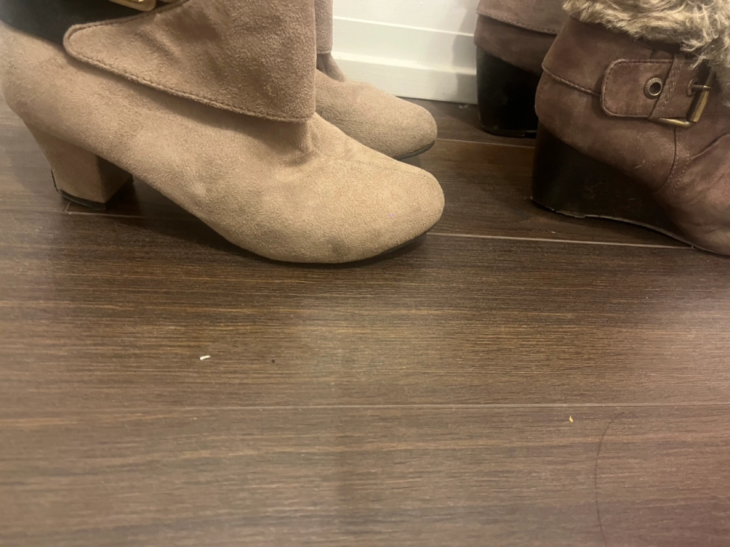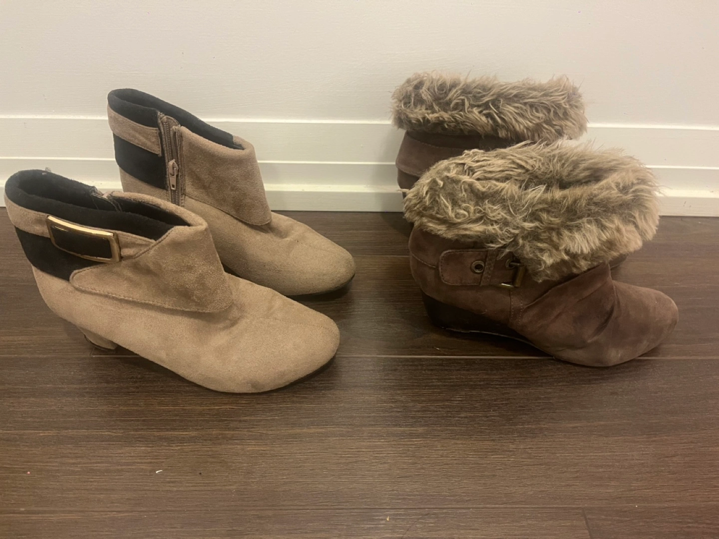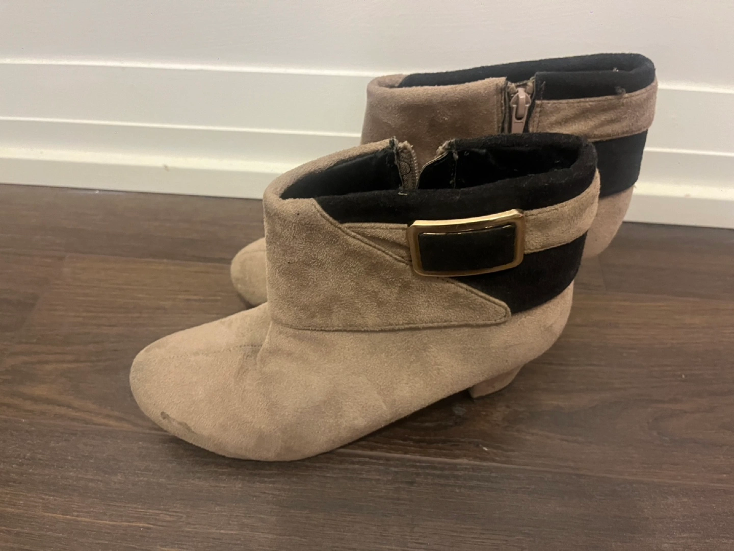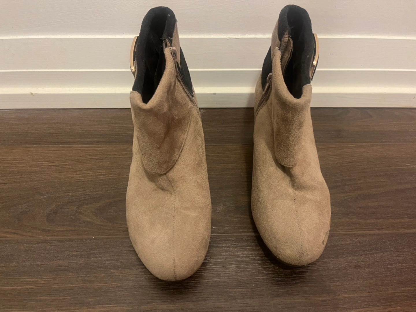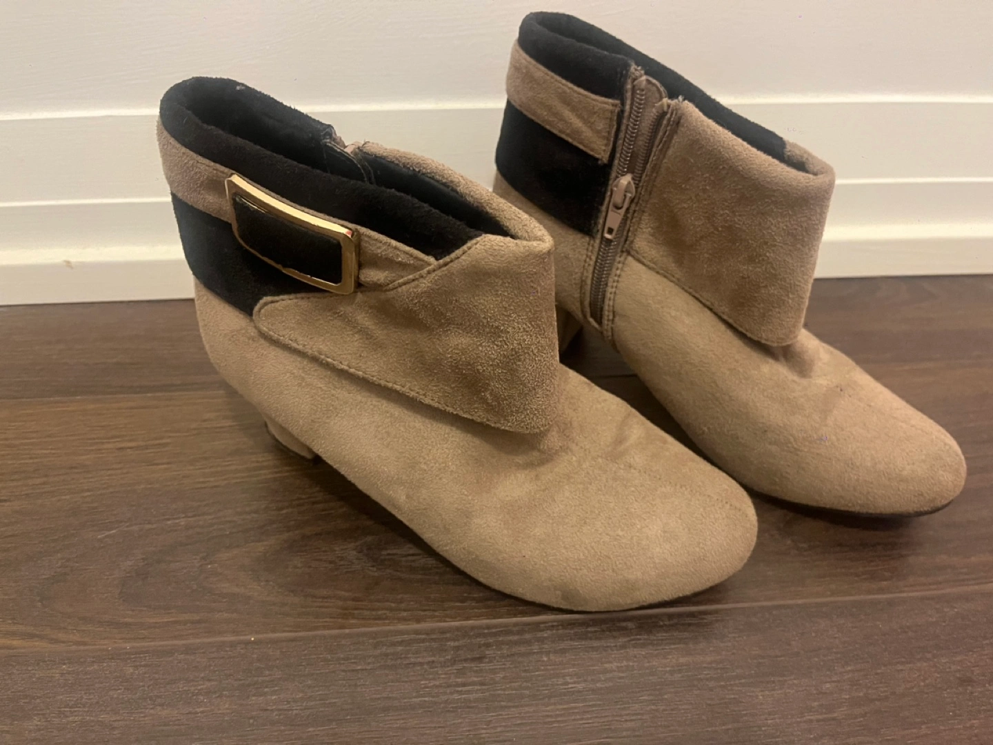 Pair of suede ankle boots. Have a gold buckle accent.From Japan! Comfortable and elegant.