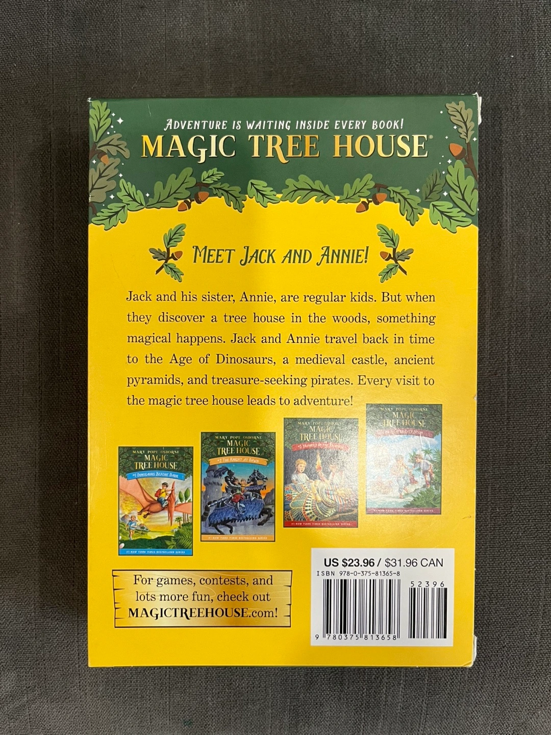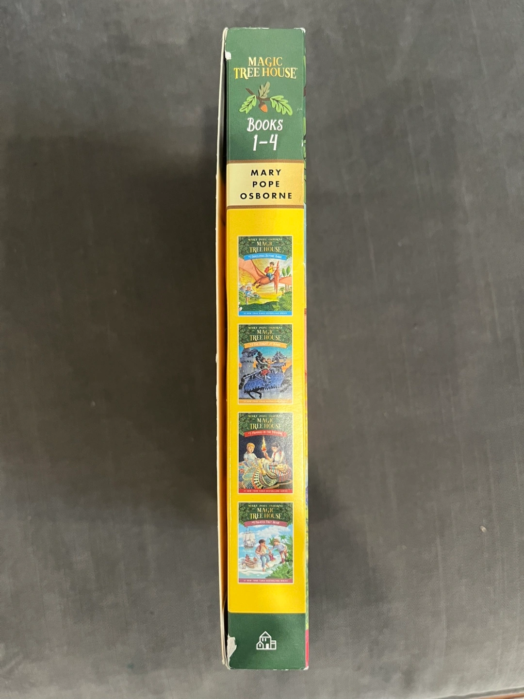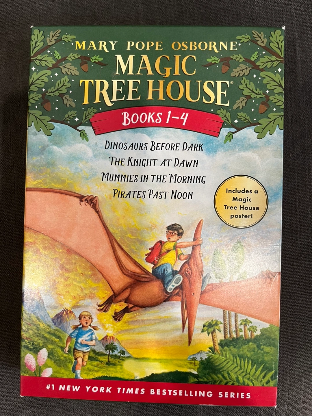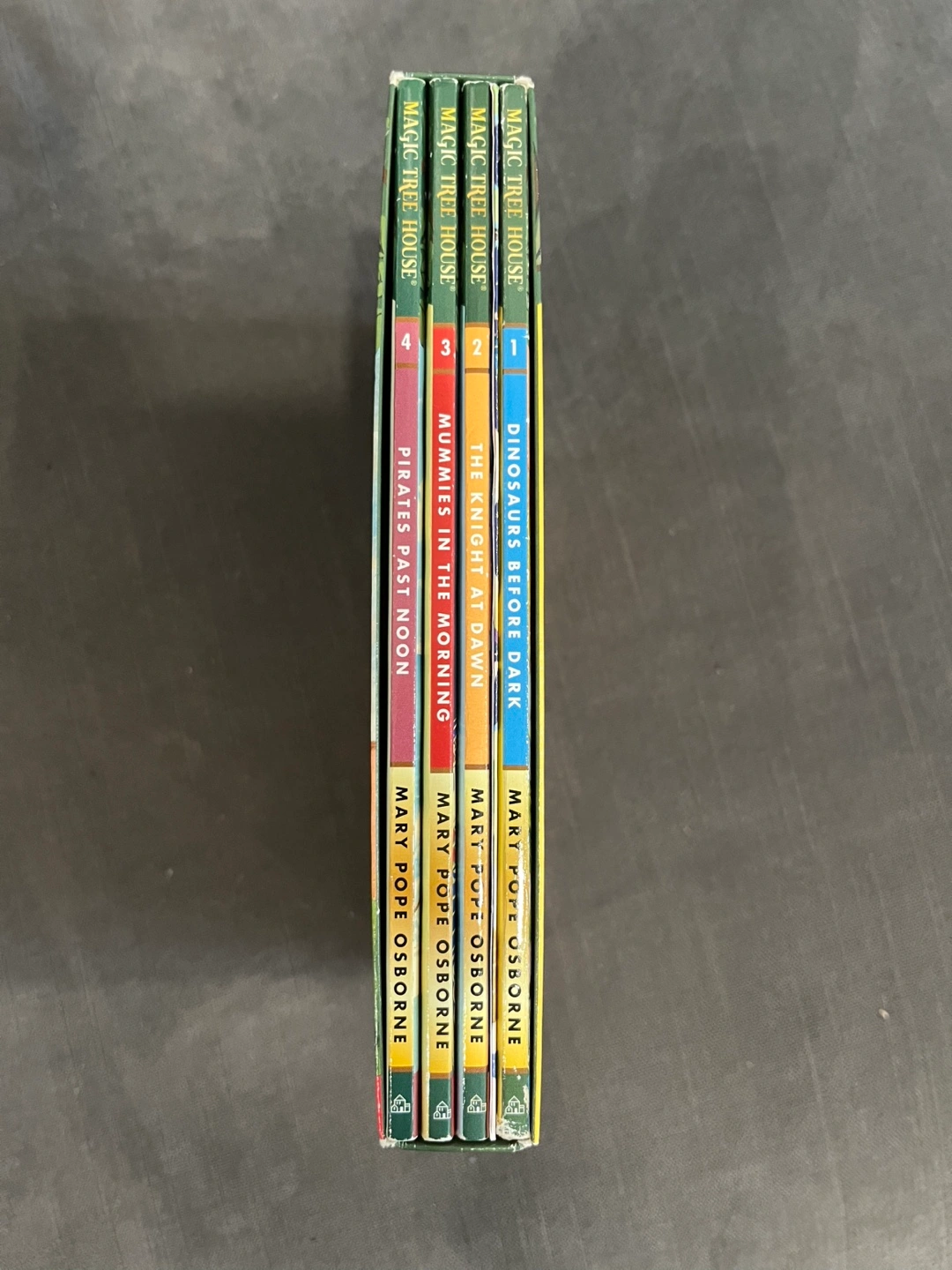Set of 4 Magic Tree House books: Dinosaurs Before Dark, The Knight at Dawn, Mummies in the Morning, Pirates Past Noon. Includes a Magic Tree House poster. These were read only twice and are in great condition.