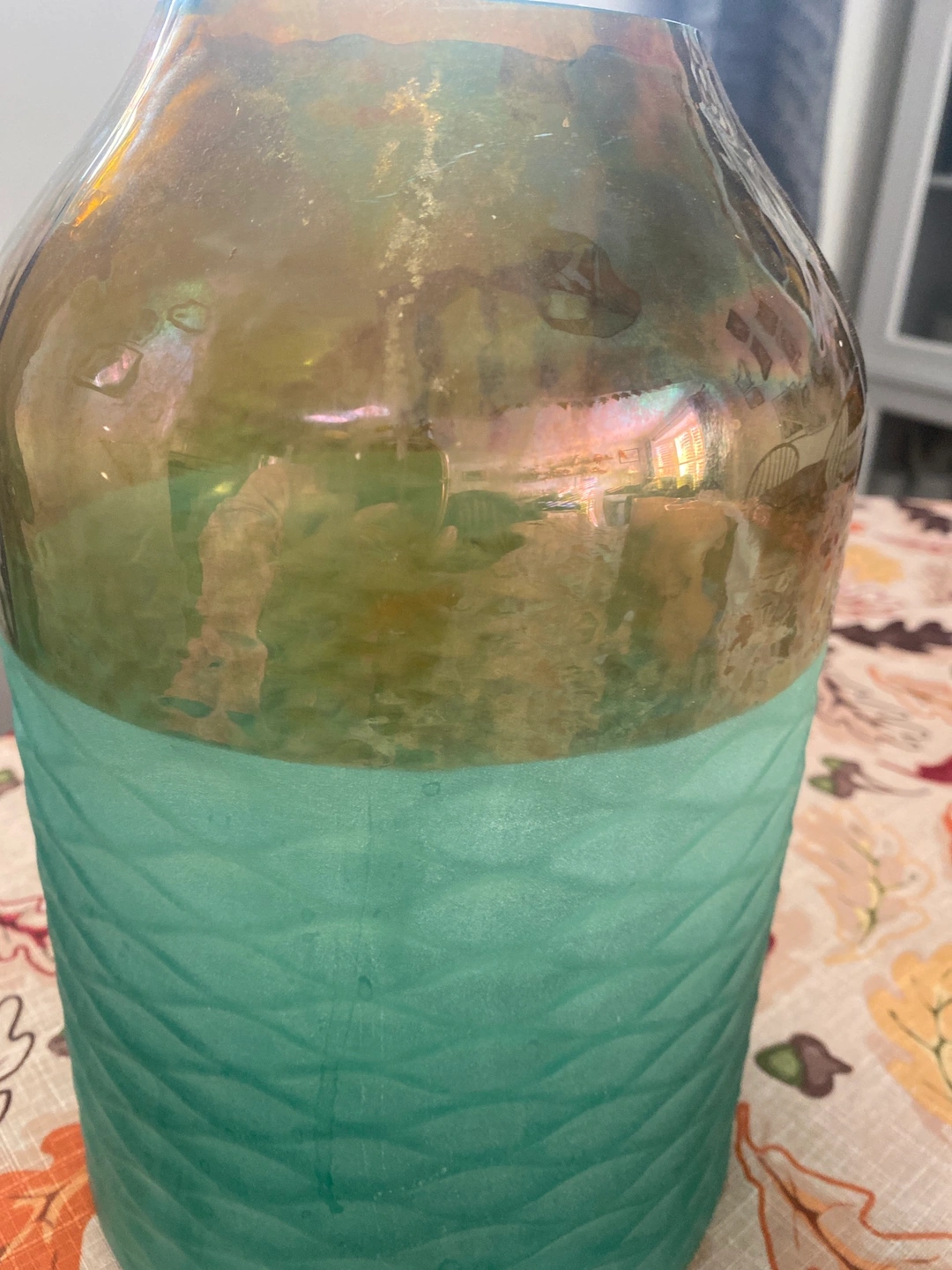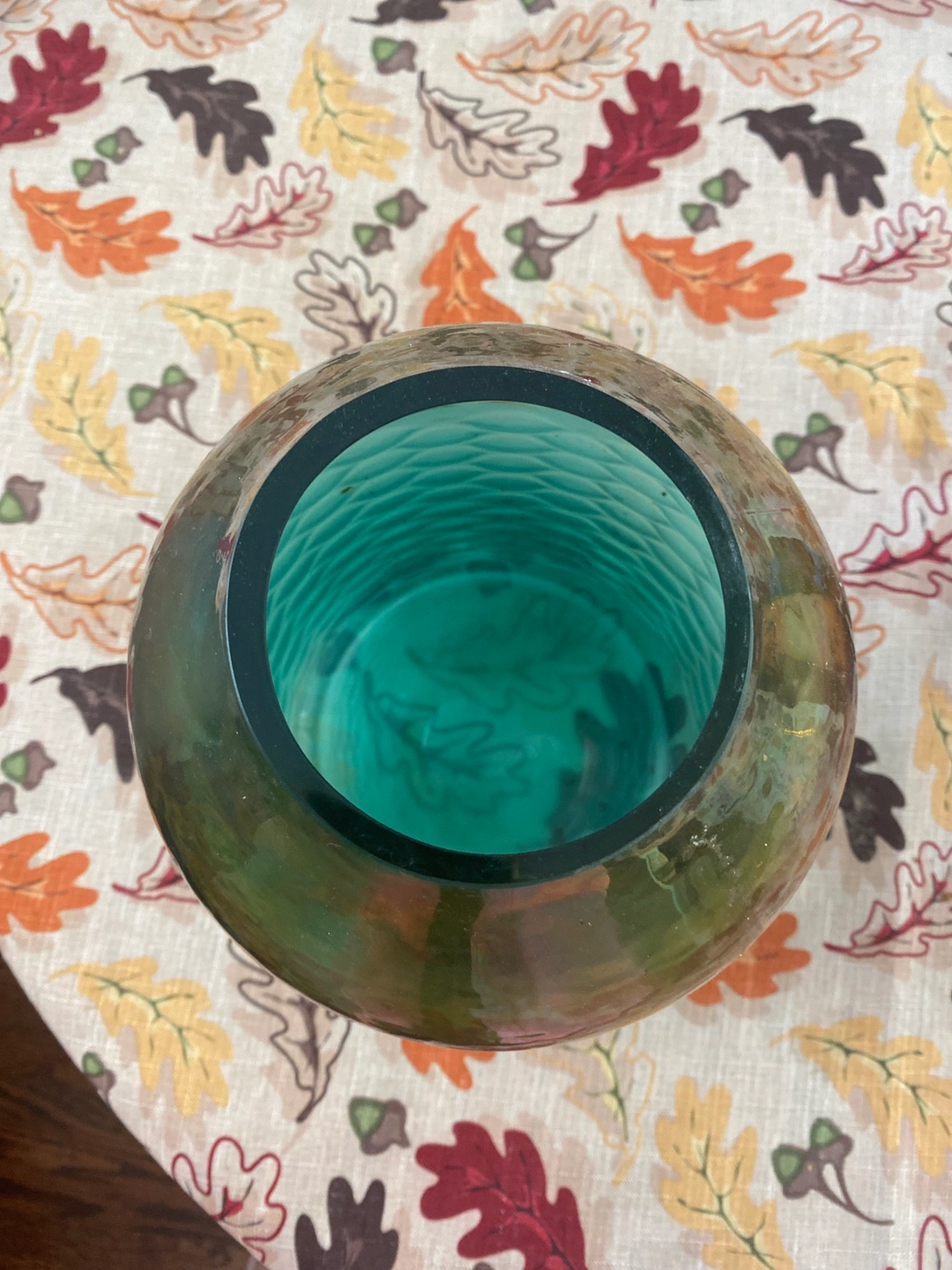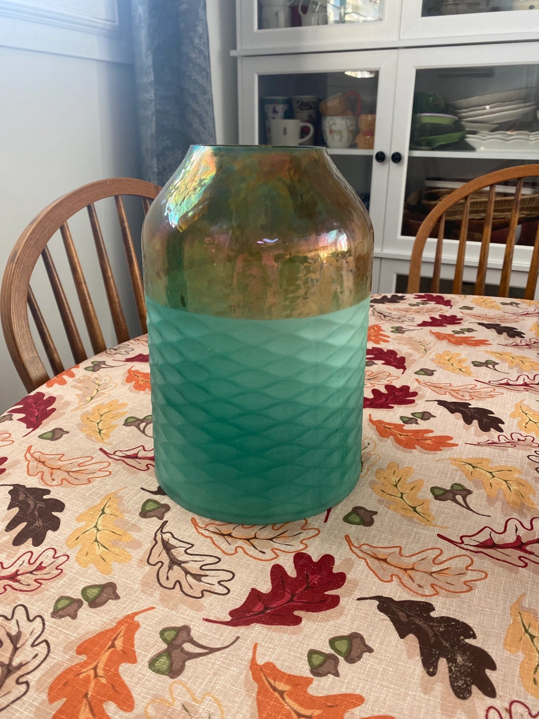 Very distinctive vase for fresh or dried flowers. About 10 “ in height. Gold And turquoise colours.