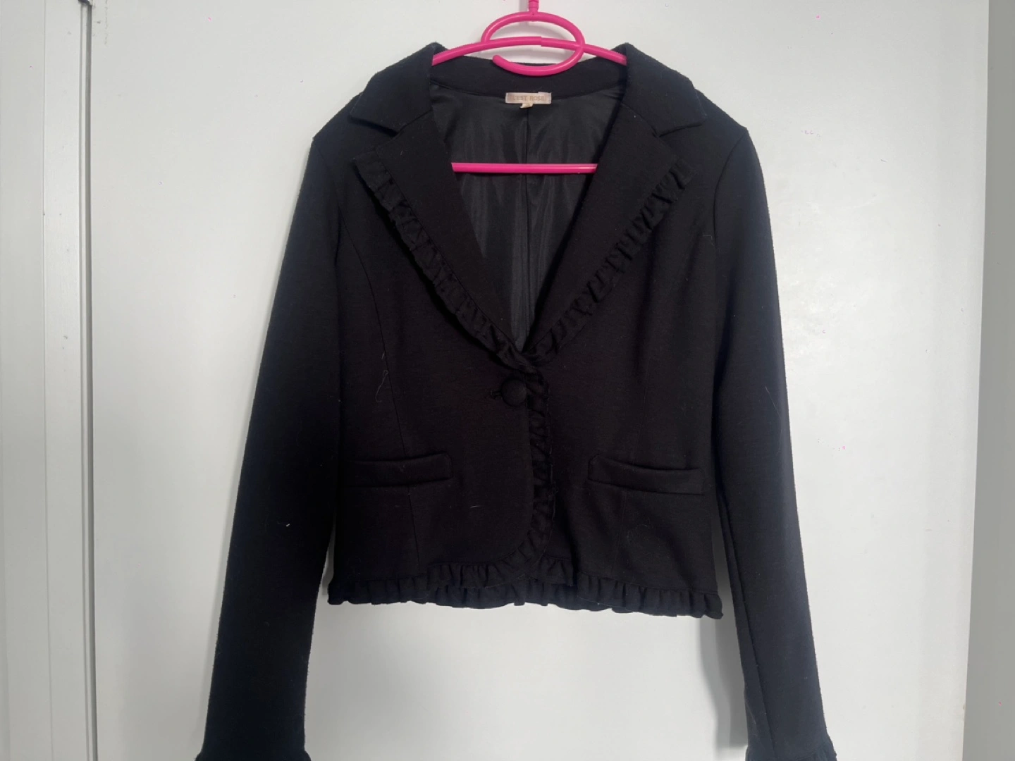 Black blazer with ruffle detail on collar, cuffs and hem. Long sleeves. From Japan! Good for work.