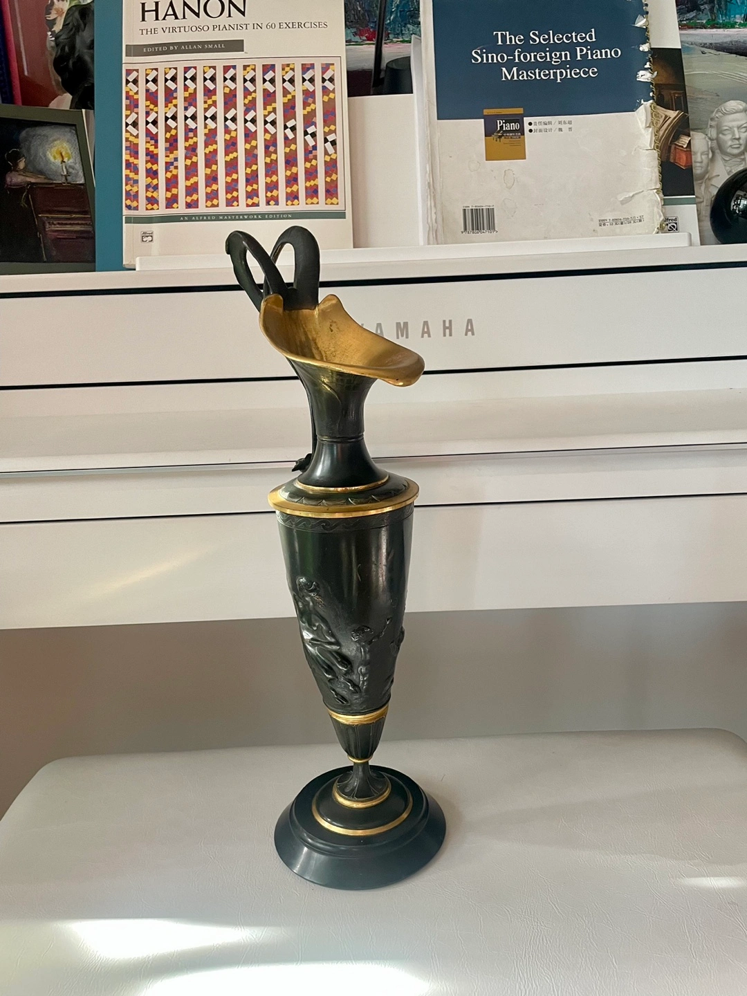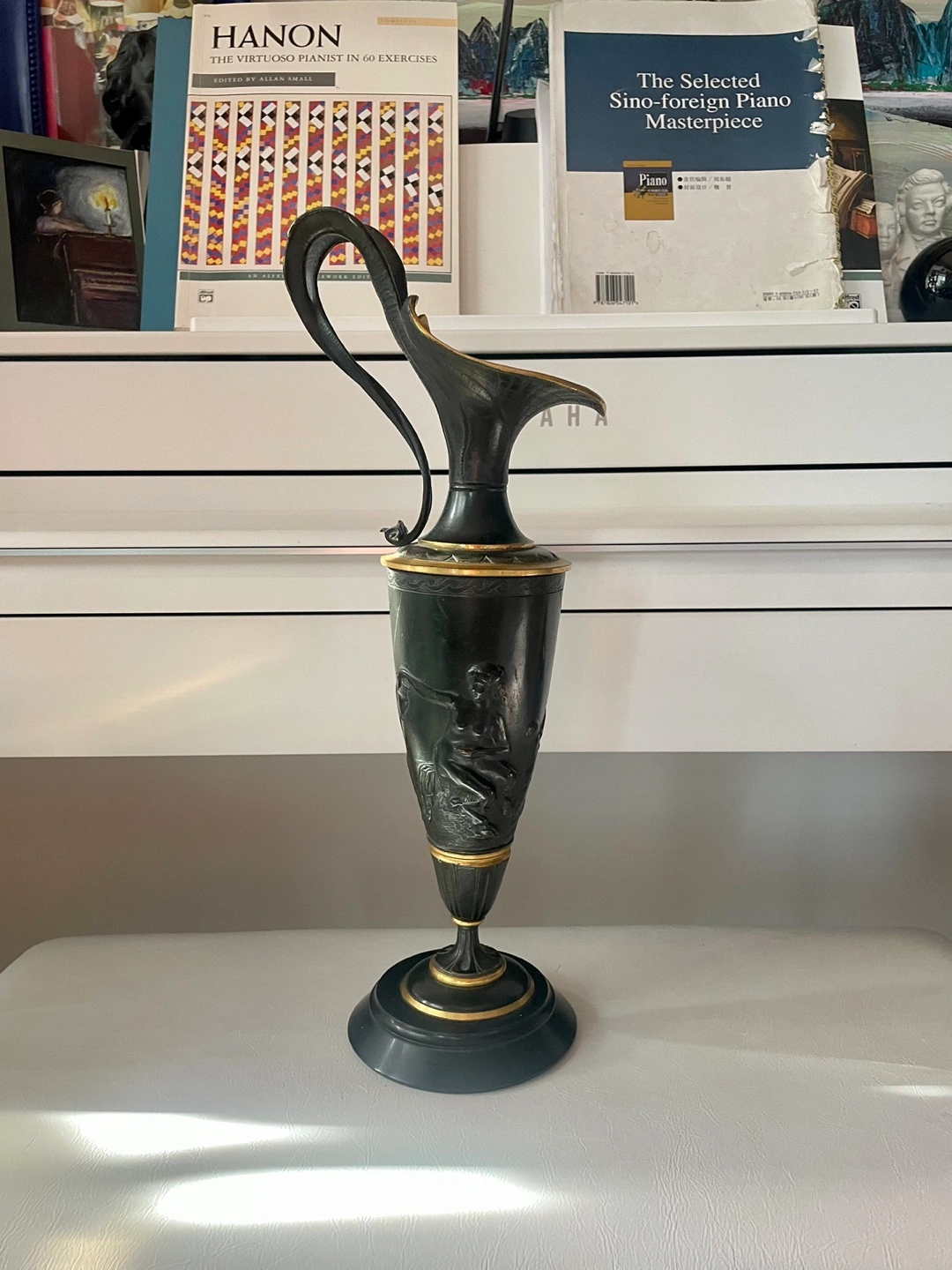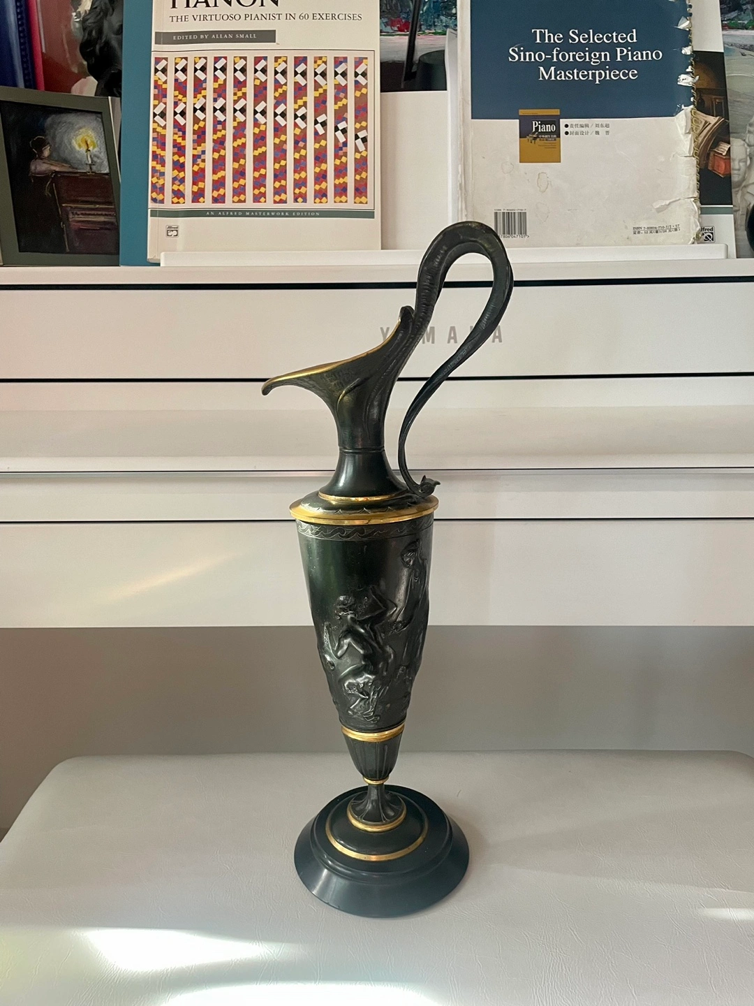 French Neo-Grec style ewer, c. 1880, when there was a revival of classical Greek aesthetics in decorative arts. The slender, elongated form and stylized handle are typical of Neo-Grec design, which emphasizes a reinterpretation of ancient Greek shapes and motifs. The decorative relief on the body of the ewer is a hallmark of this style, often portraying mythological or idyllic scenes inspired by antiquity. Signed Clodion in neo-classical relief bear the base. 16” H Pick up around Sherbourne/ Wellesley Could ship/ deliver for a fee