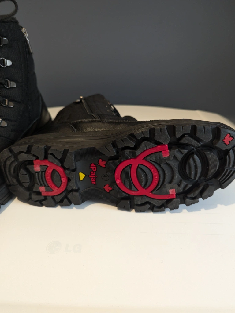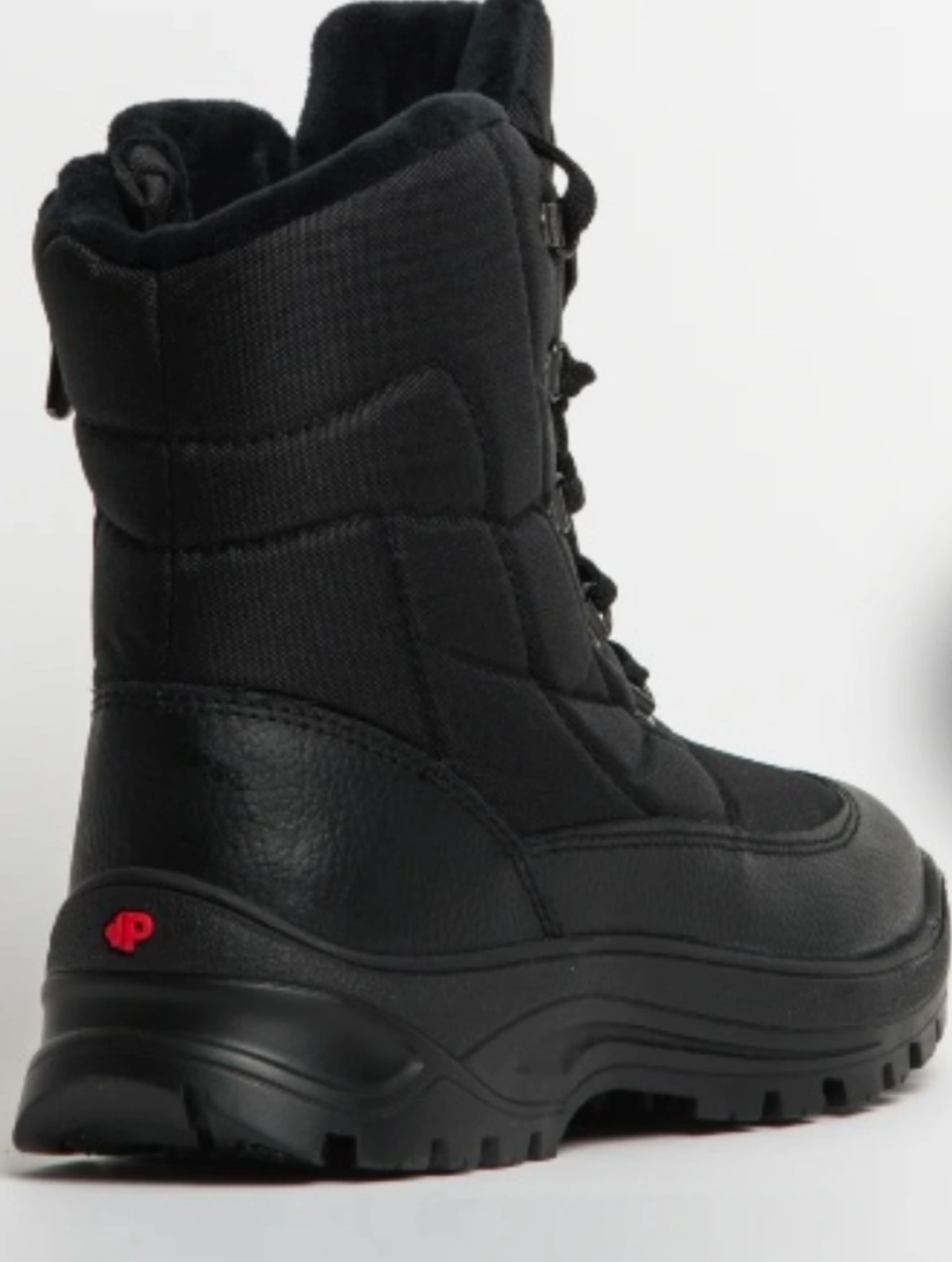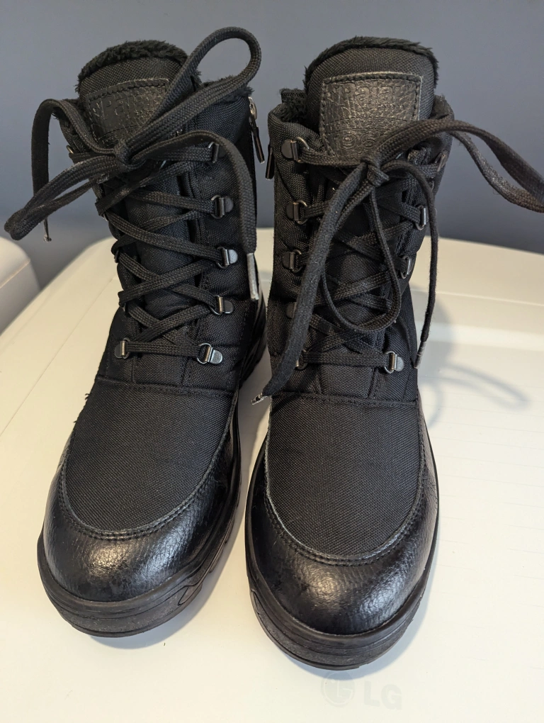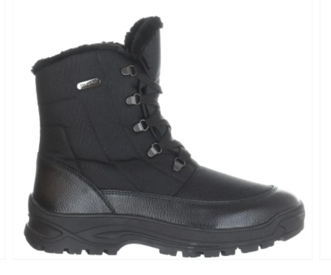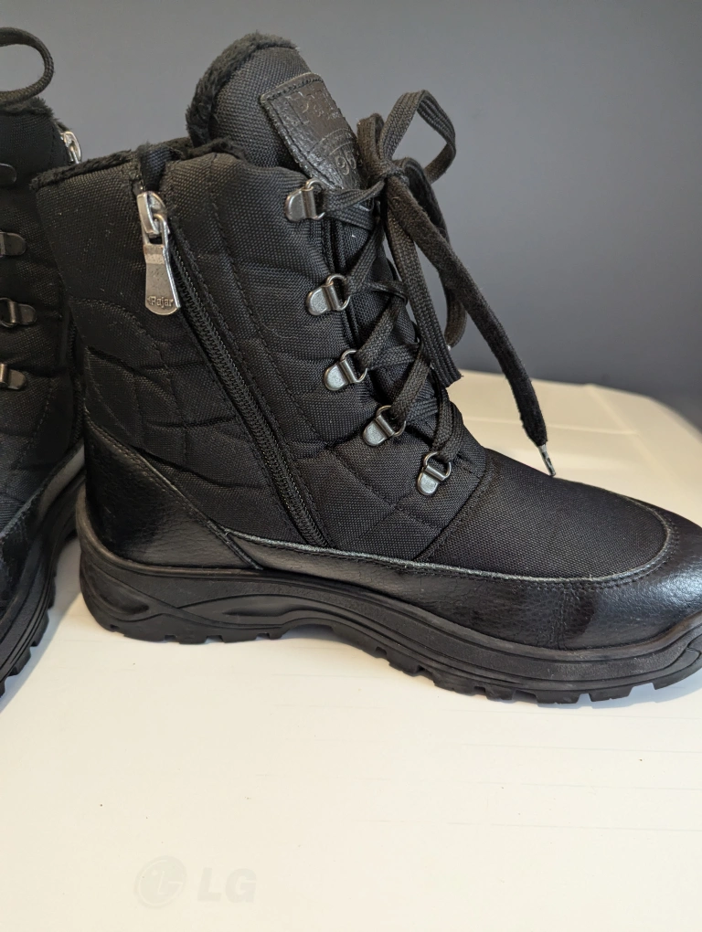 Black winter boots with a lace-up closure and side zipper. Fur lining.
