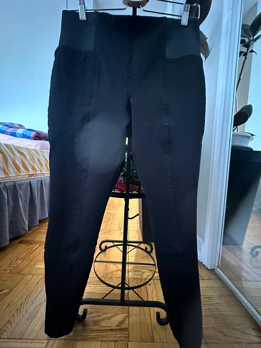 Black pants with a straight leg and a slightly higher waist. Fabric has stretch. Medium.