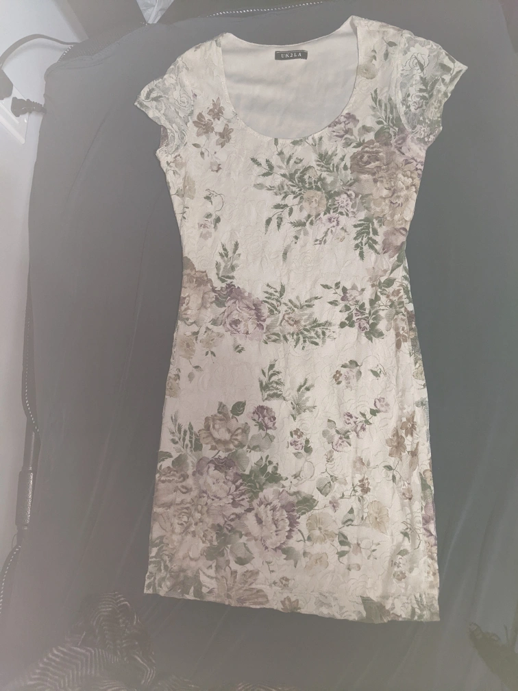 Short sleeved floral lace dress. White base with green and purple floral pattern. Serious Inquiries only No delivery
