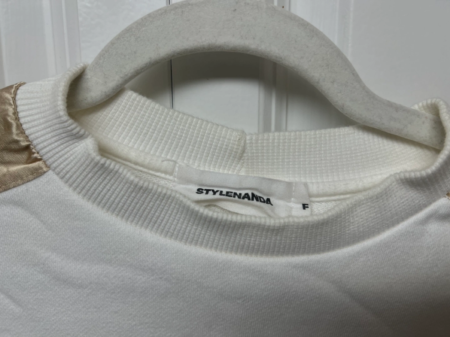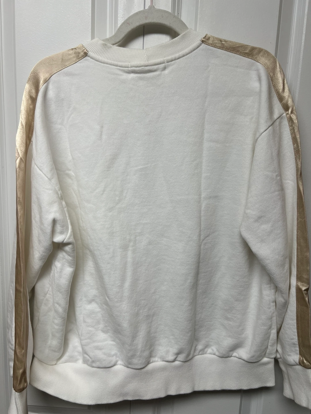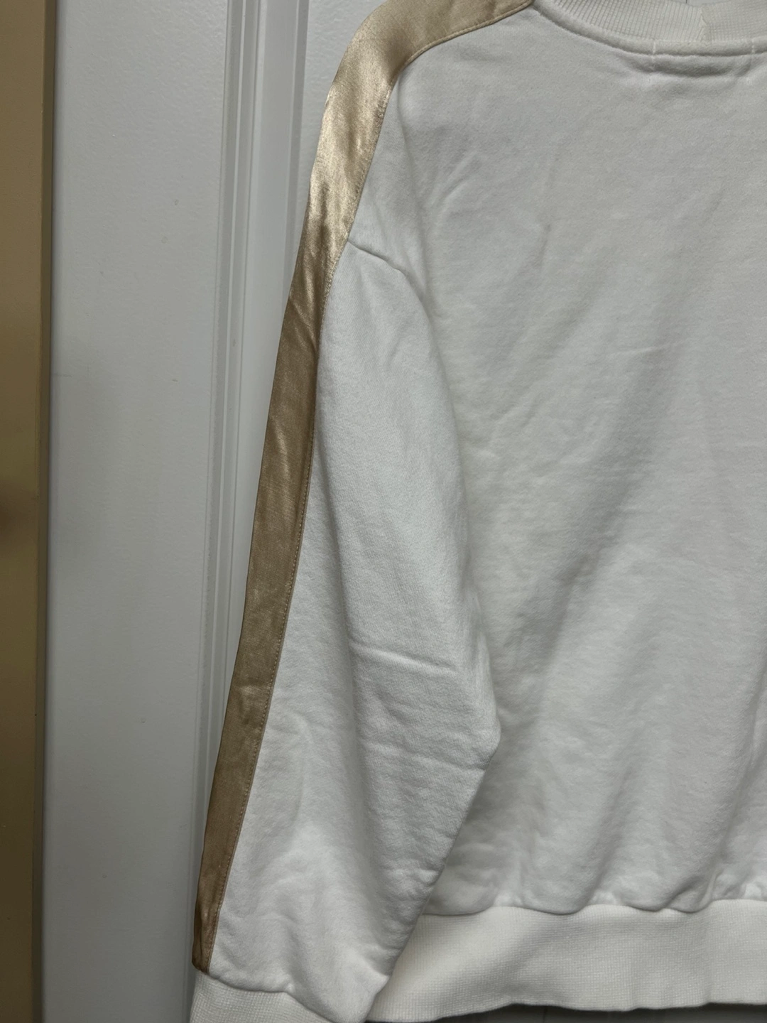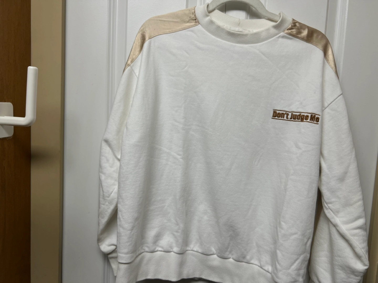 White cropped sweatshirt with gold satin stripes on the sleeves and "Don't Judge Me" embroidery on the front. Crew neck. Long sleeves. Stored in a SMOKE, PETS free house Cash only and Pick up at Port Coquitlam